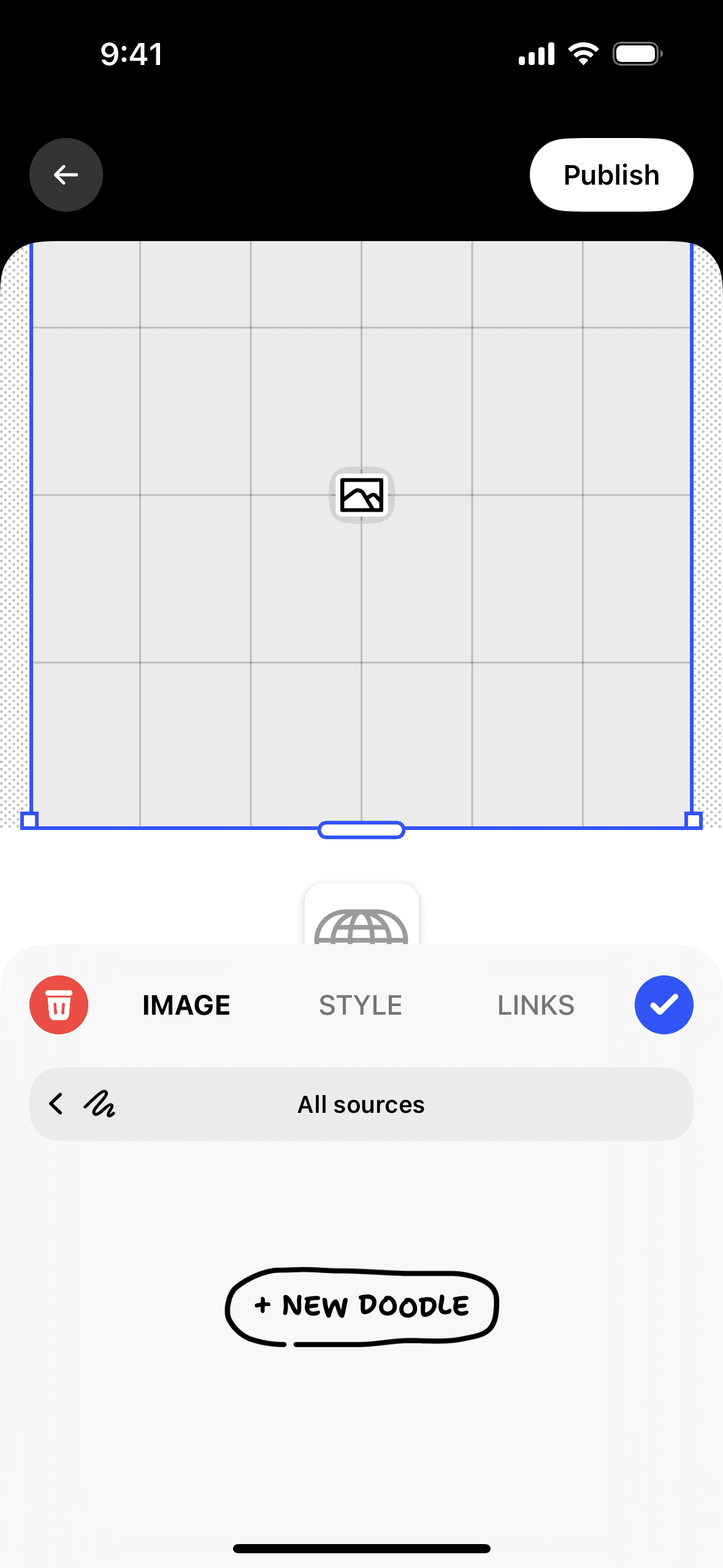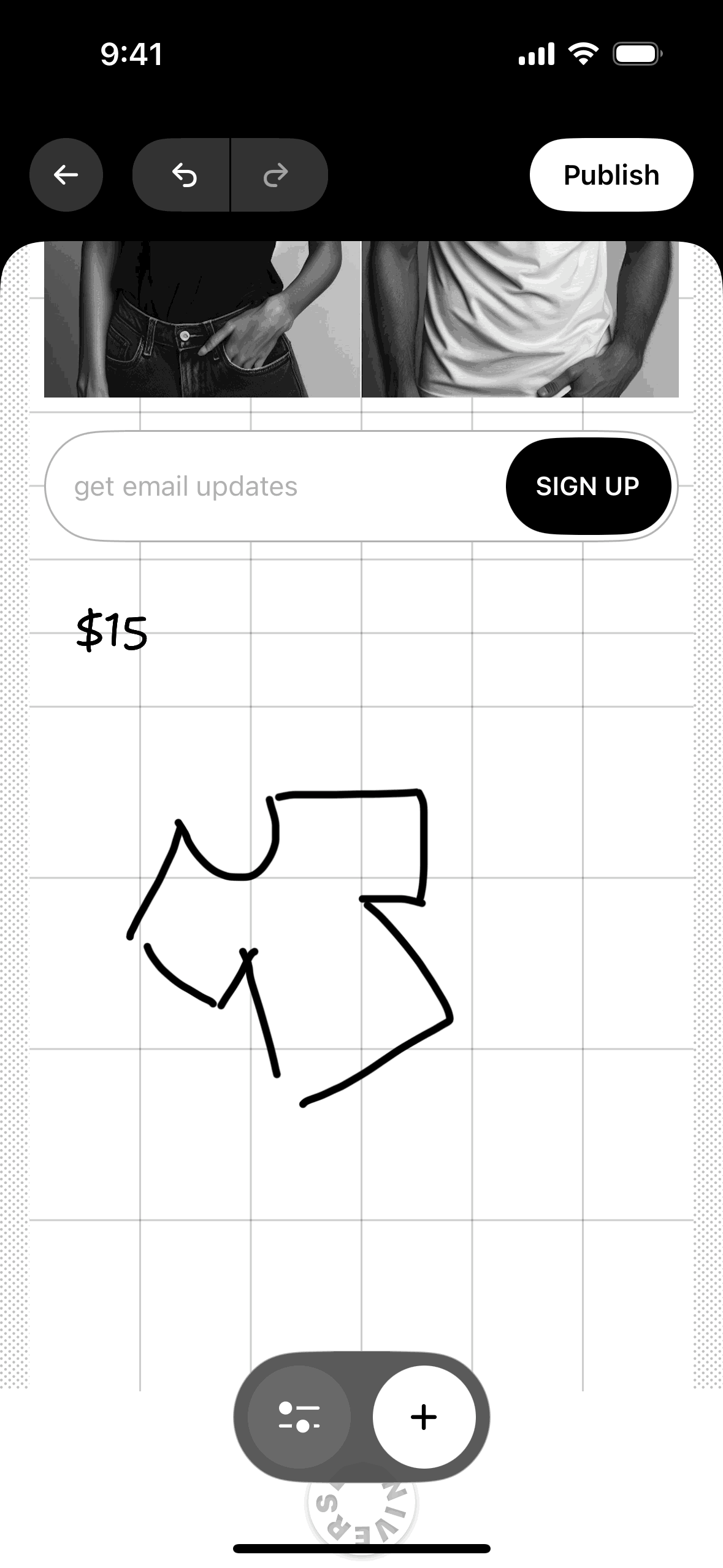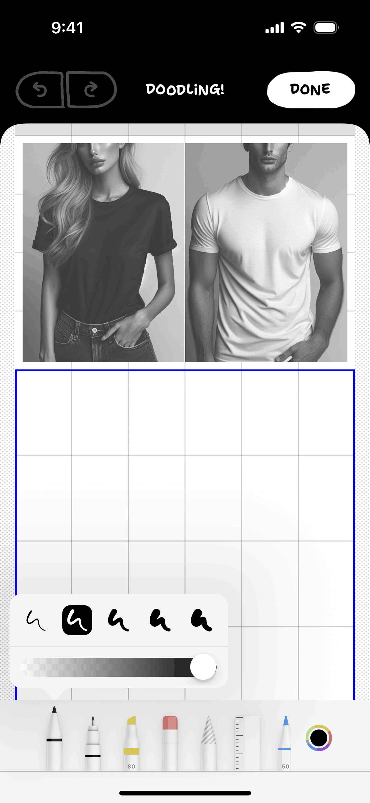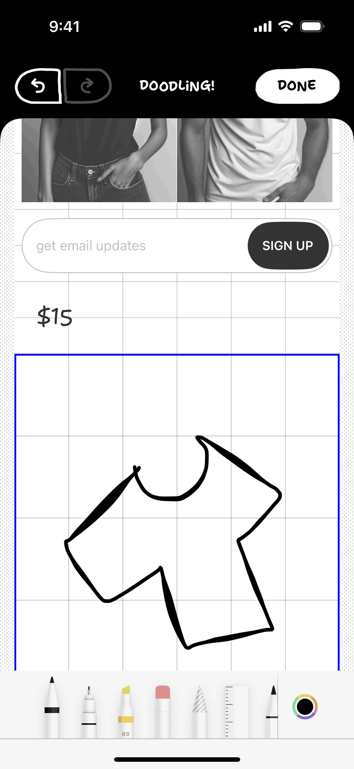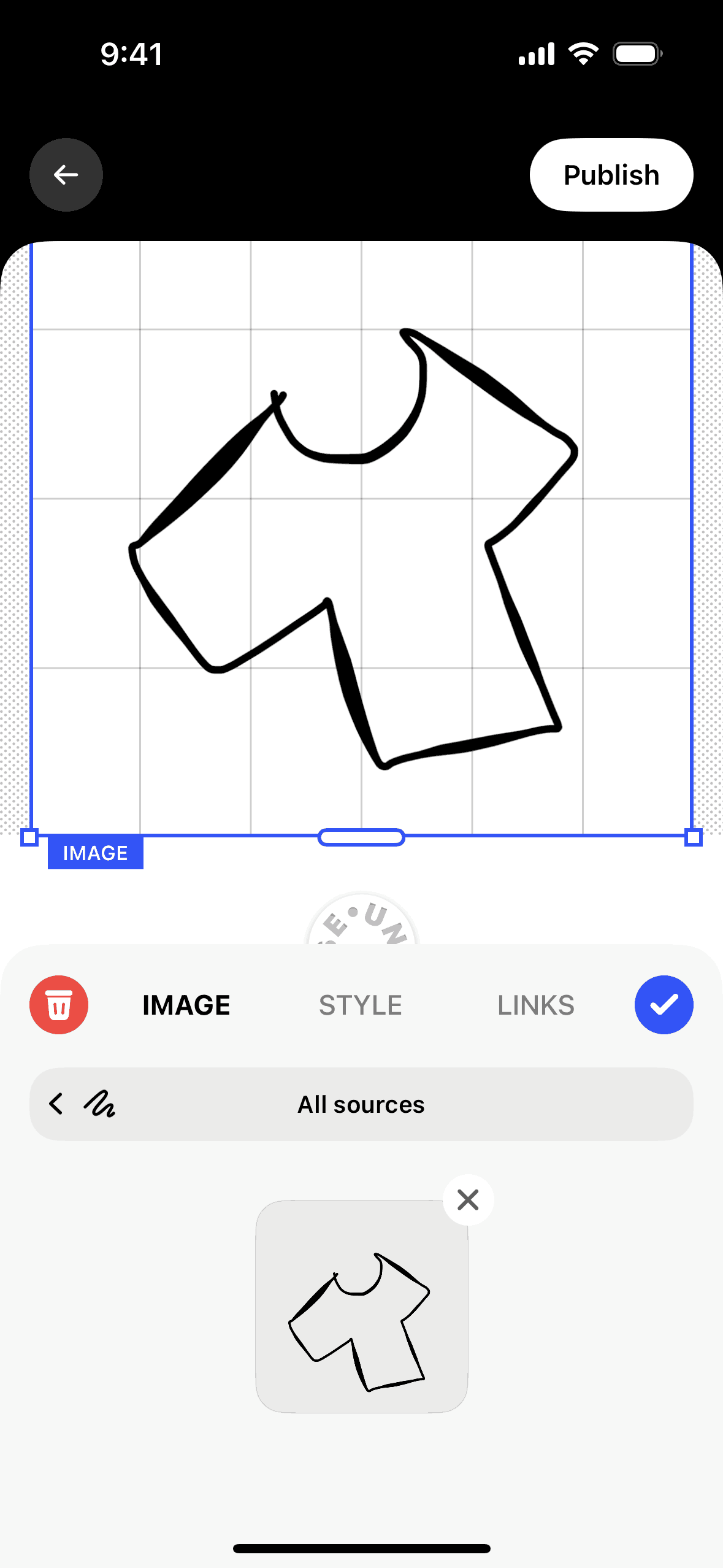 The user selects an image block, creates a doodle of a t-shirt, and integrates it into the main design for publishing.