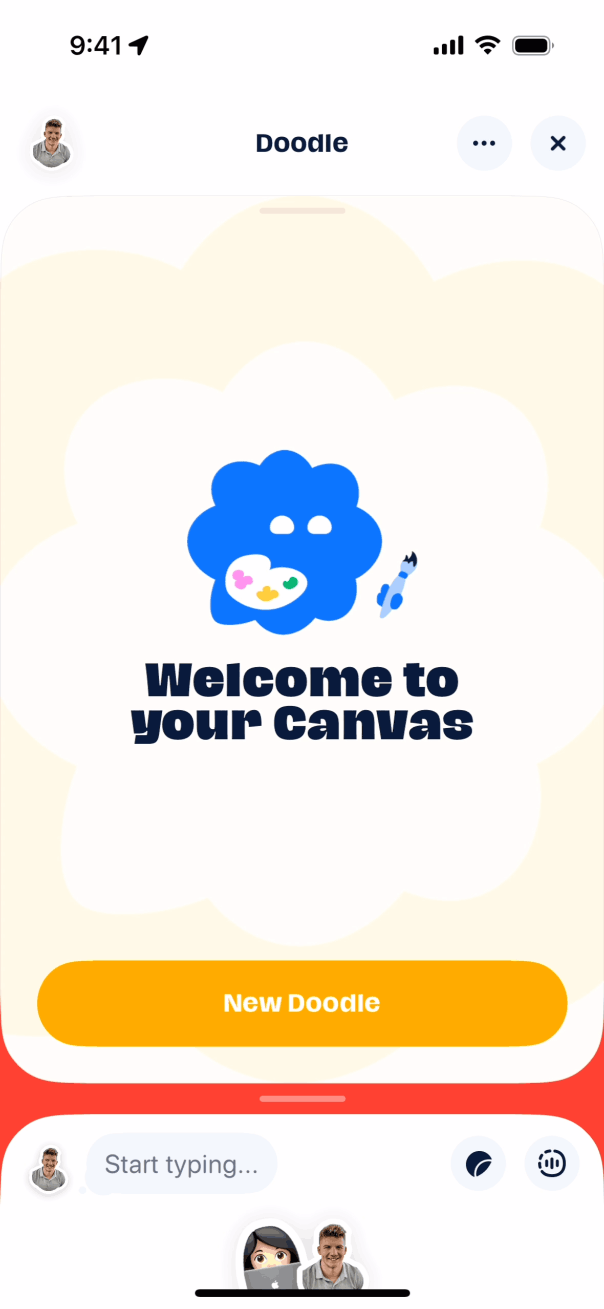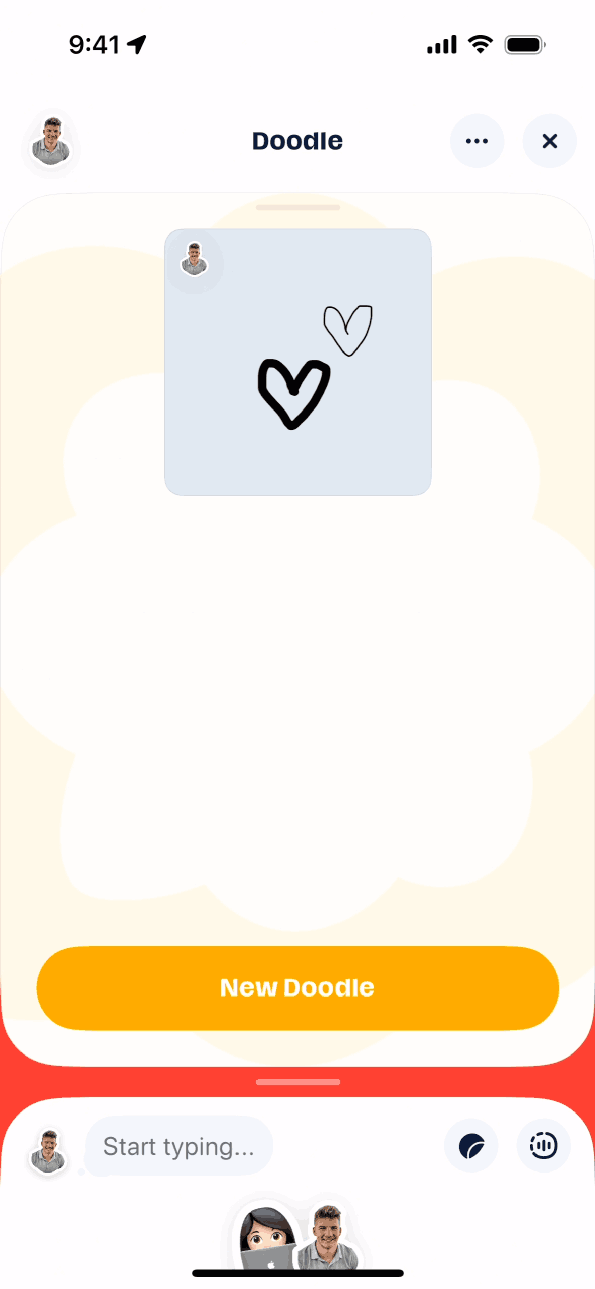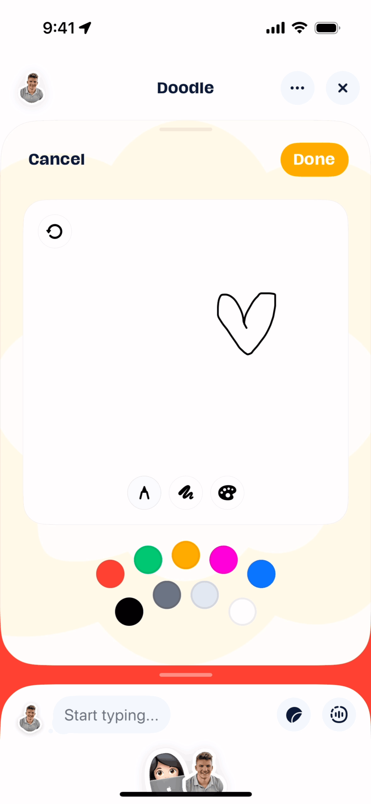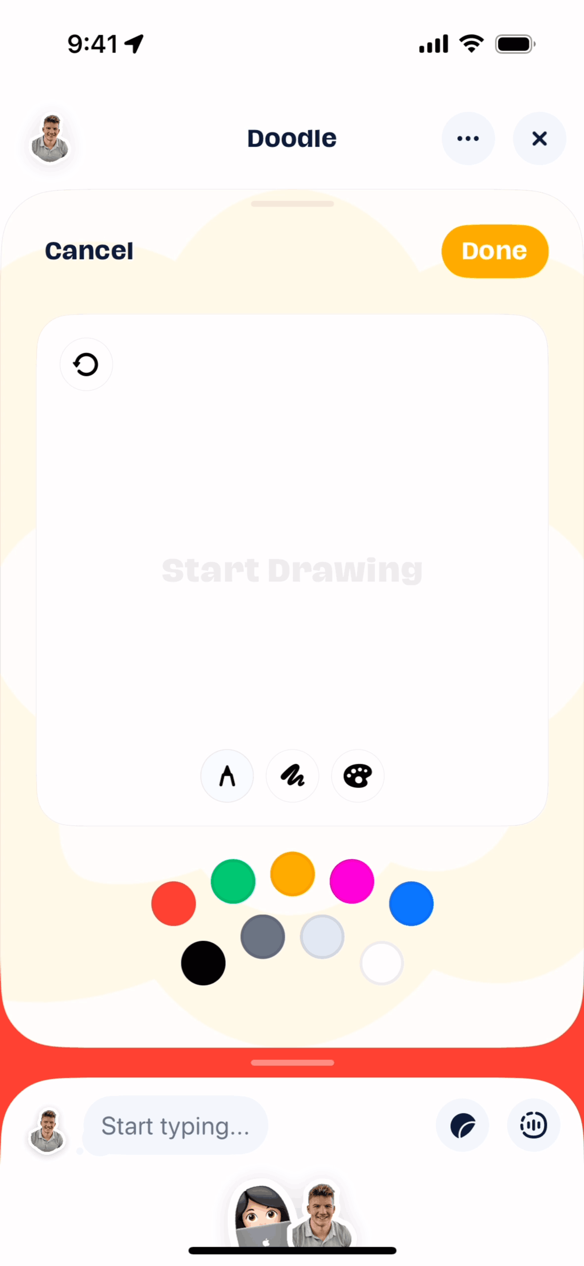 The user flow demonstrates creating a doodle and adding it as a magnet to a chat. It involves canvas drawing, thickness adjustment, and color selection.