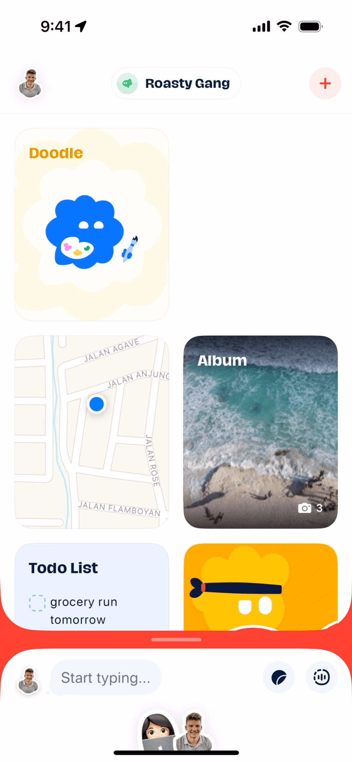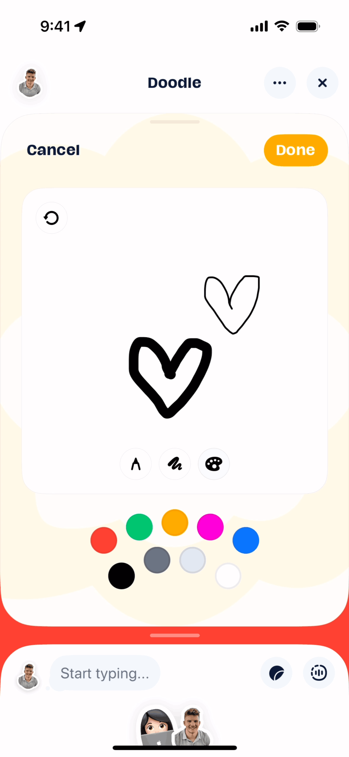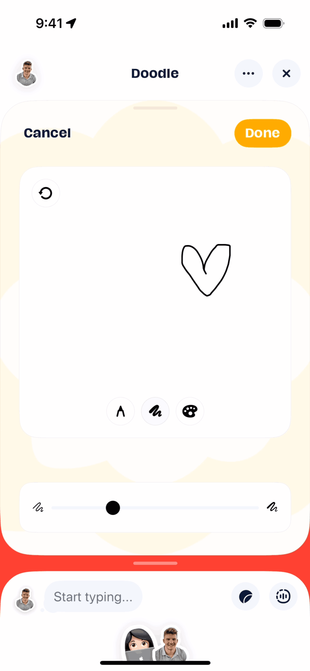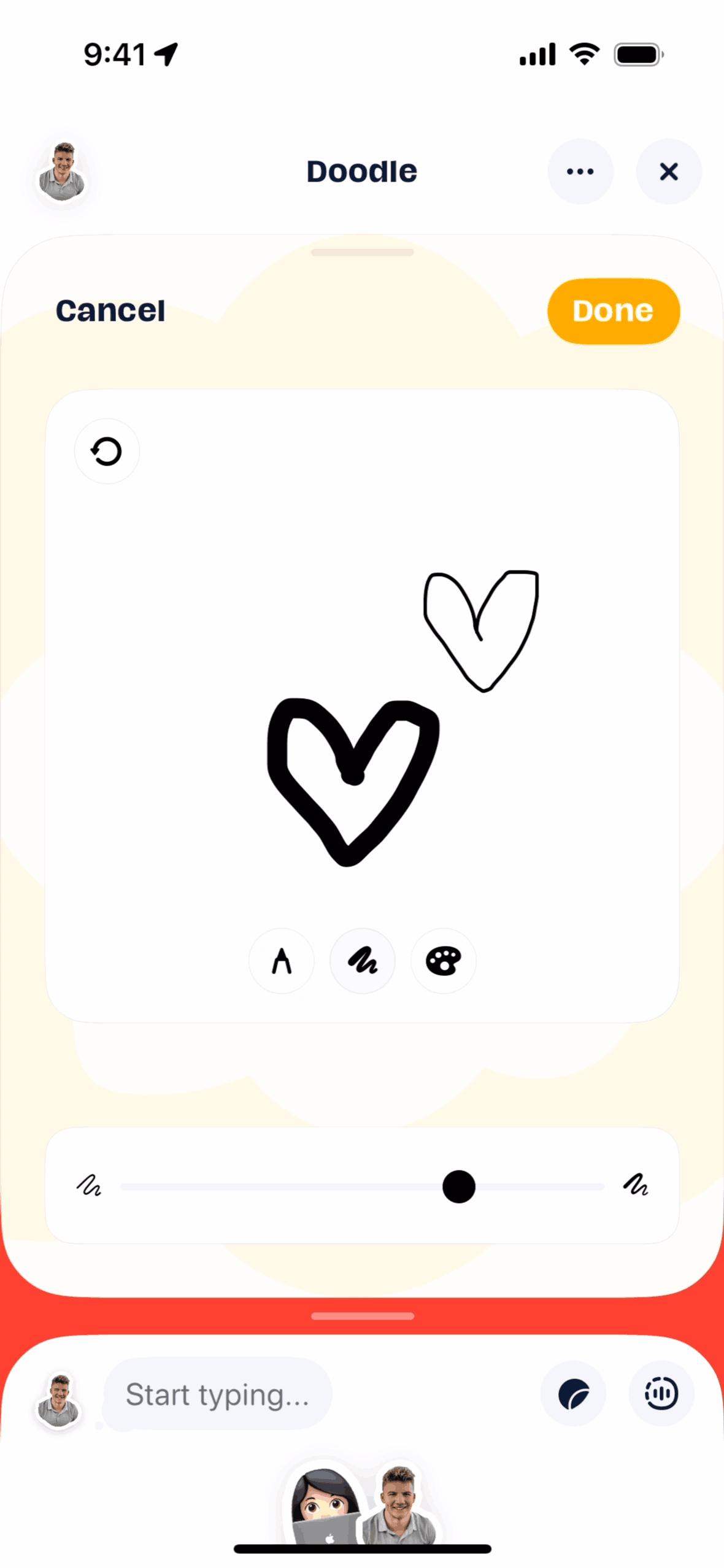 The user flow demonstrates creating a doodle and adding it as a magnet to a chat. It involves canvas drawing, thickness adjustment, and color selection.