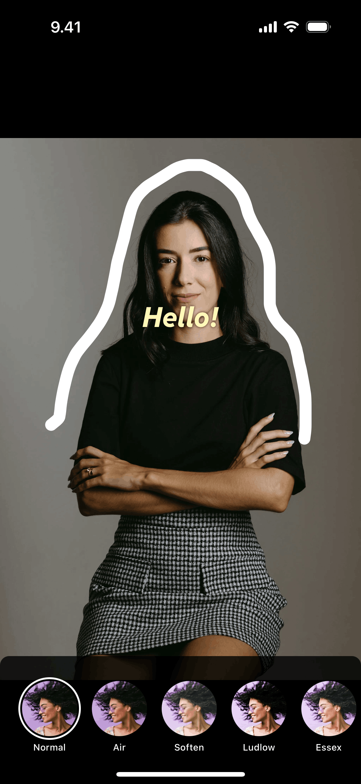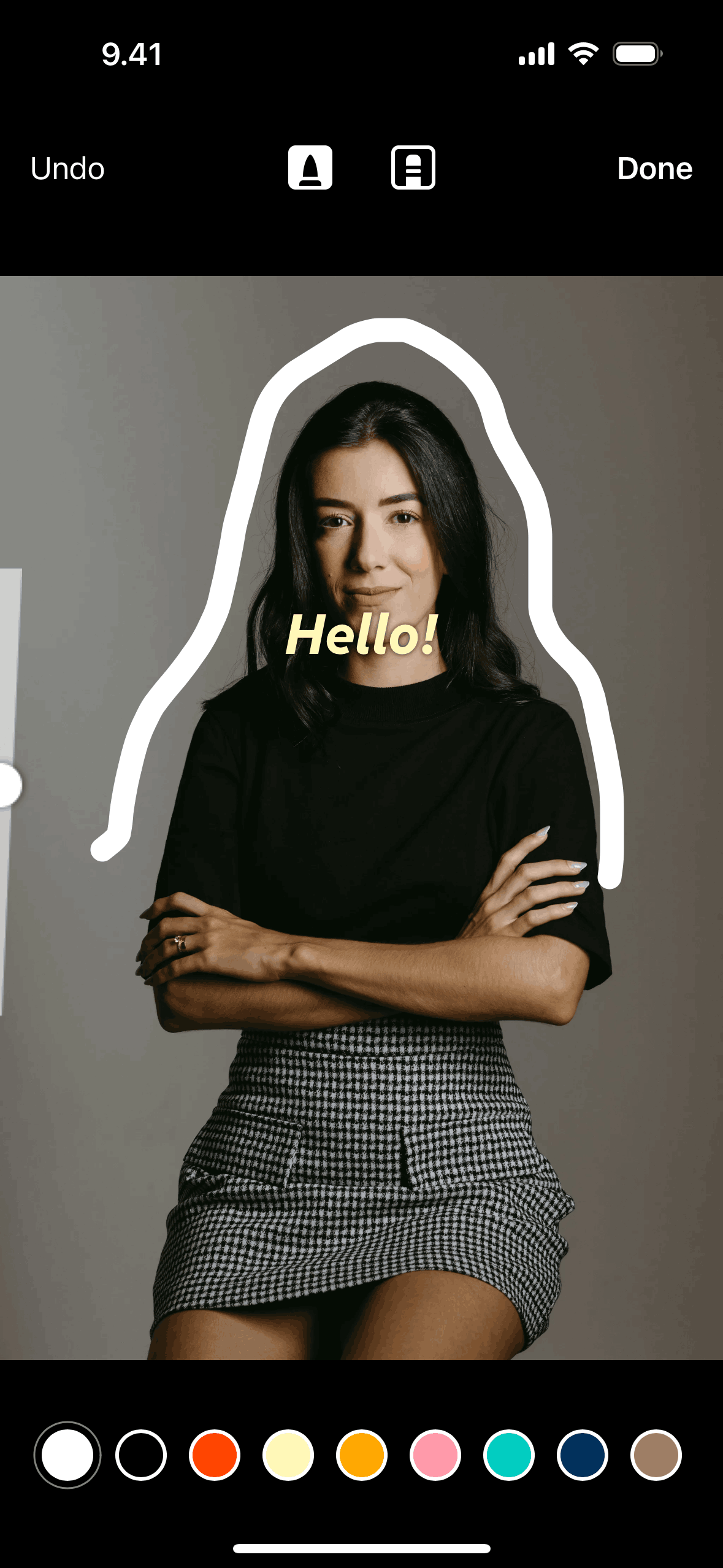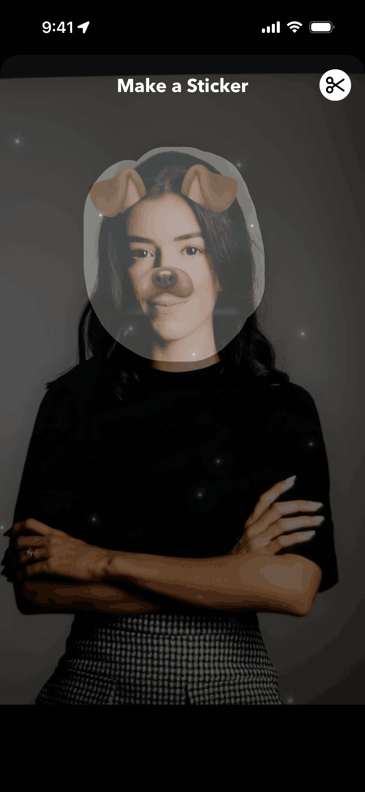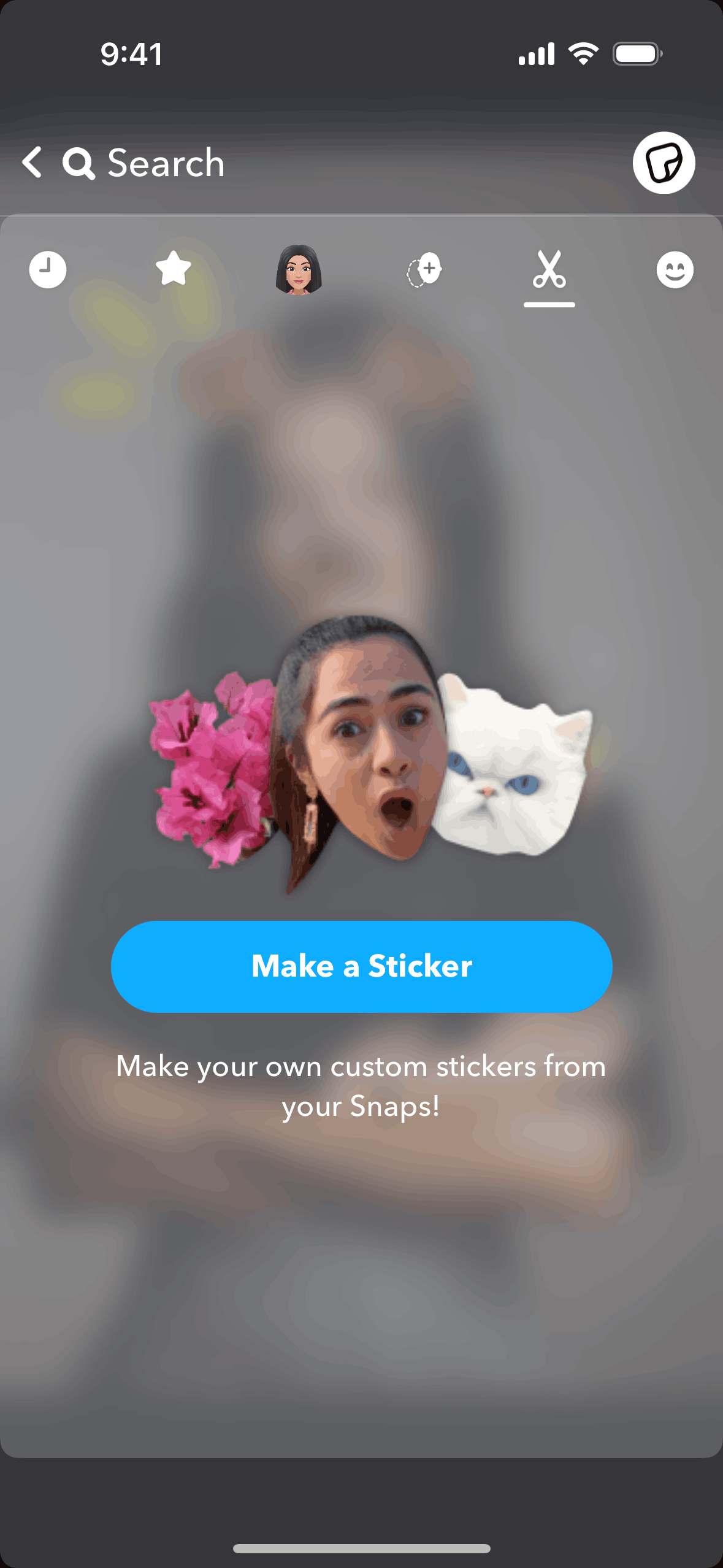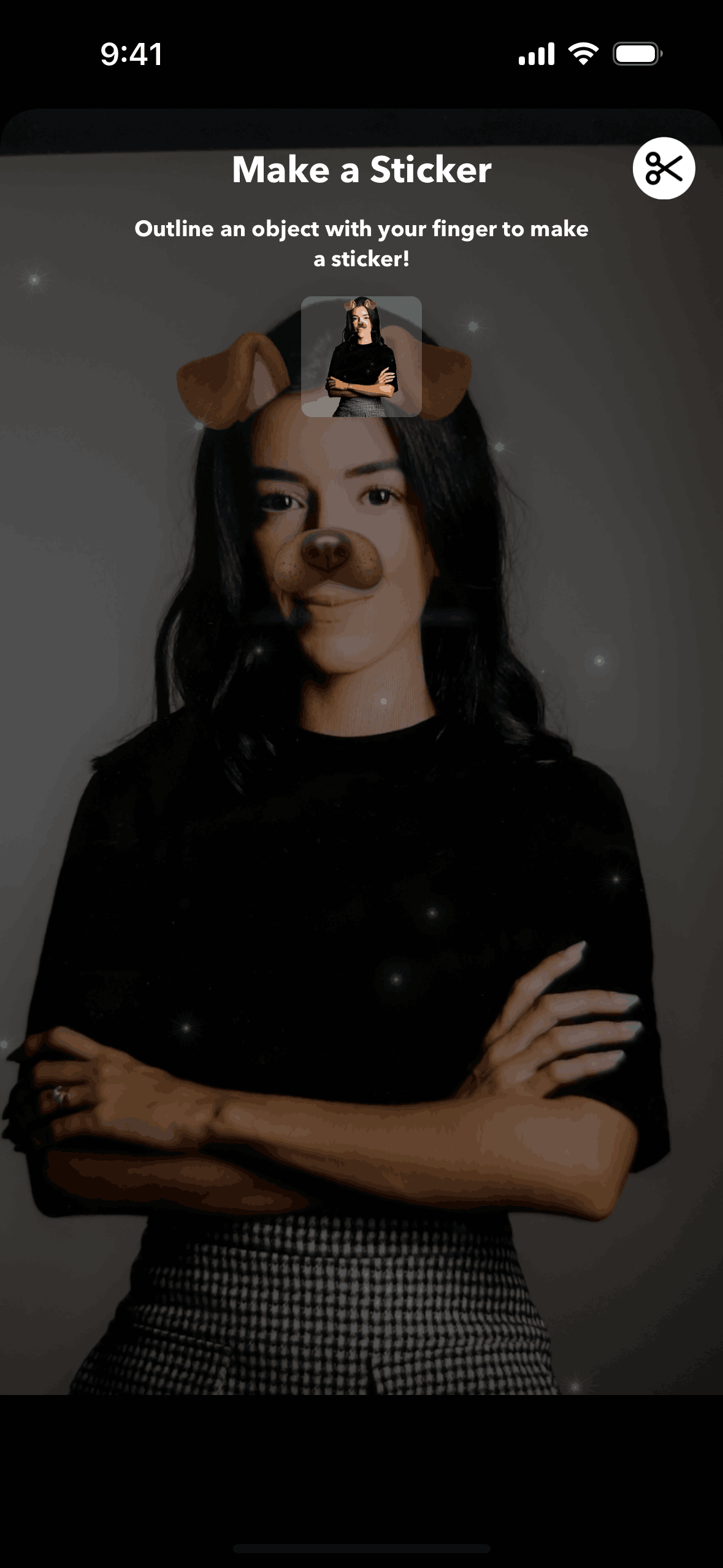 The user flow demonstrates creating a sticker from a photo. It involves outlining an object and then editing/sharing the final sticker.
