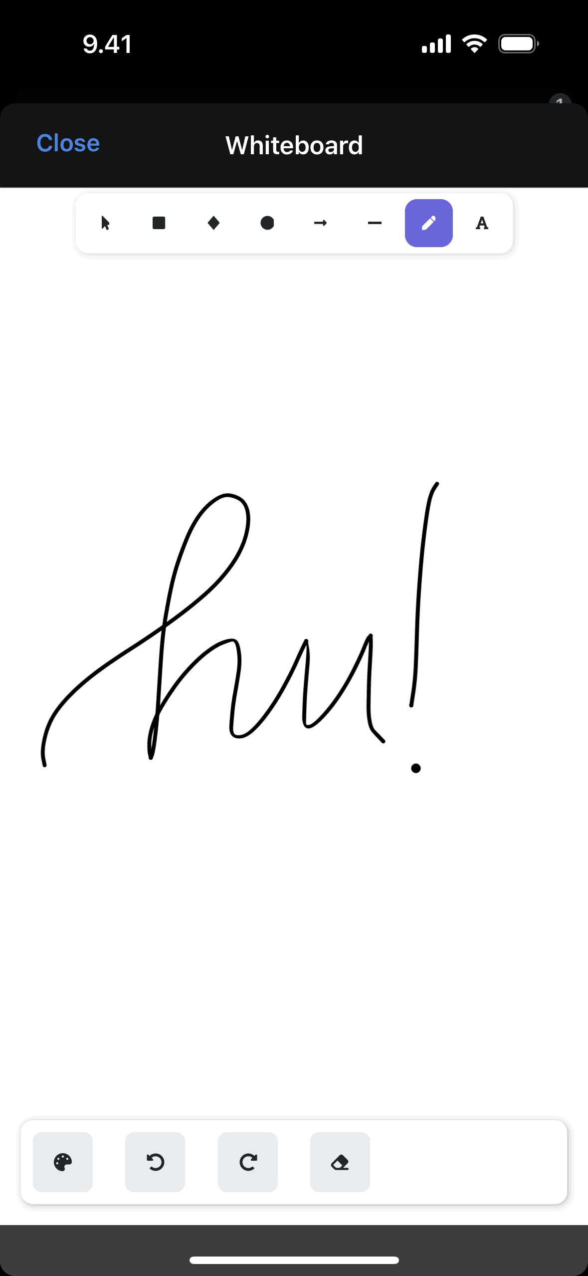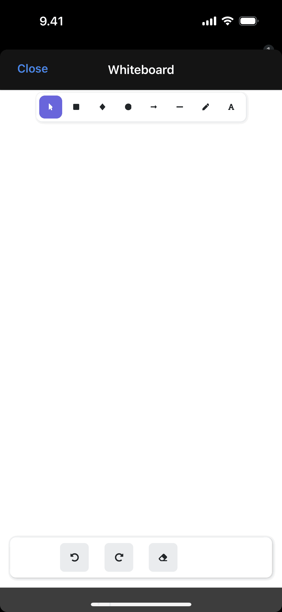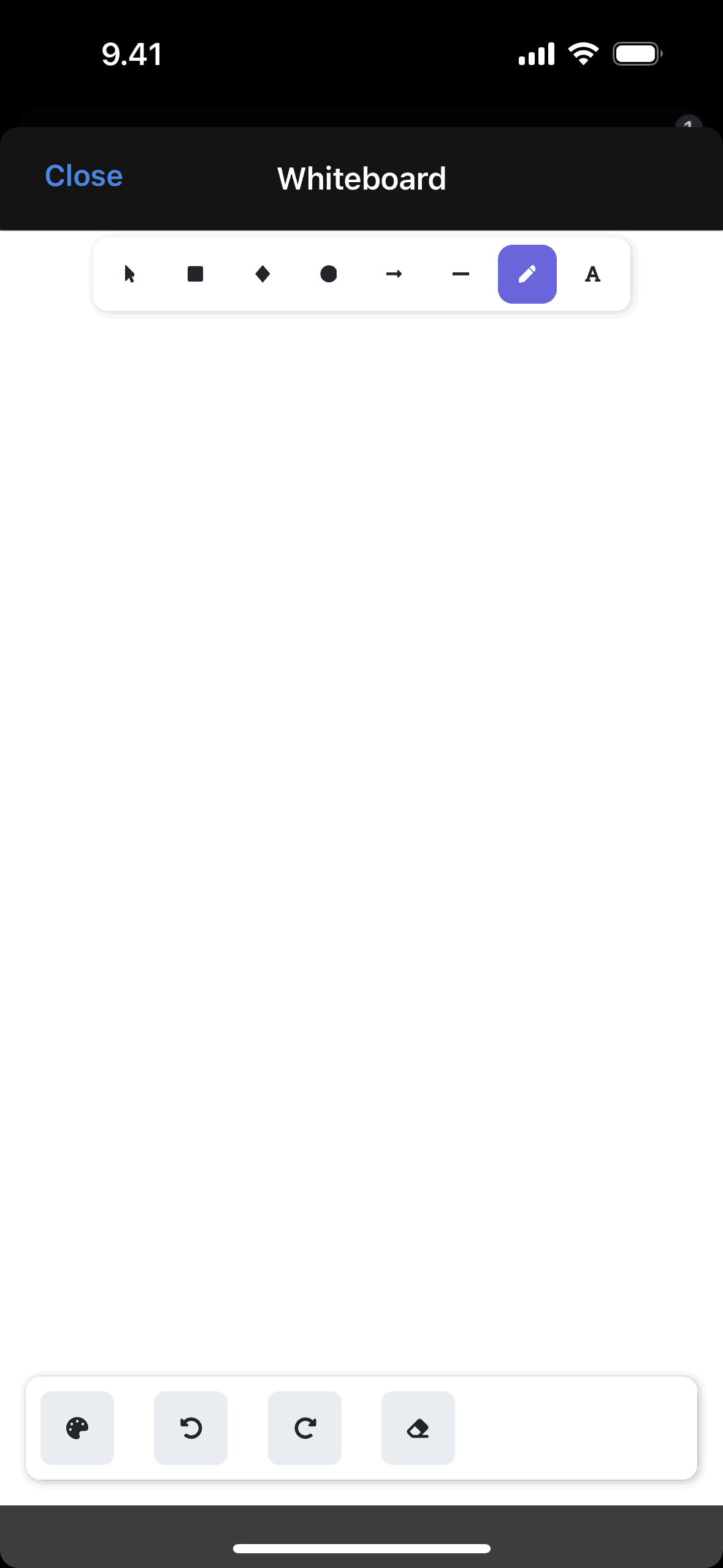 The user opens a blank whiteboard, selects the pen tool, and then draws on the whiteboard. The flow demonstrates simple whiteboard editing.