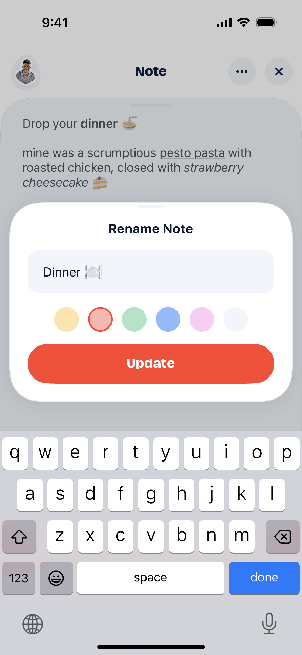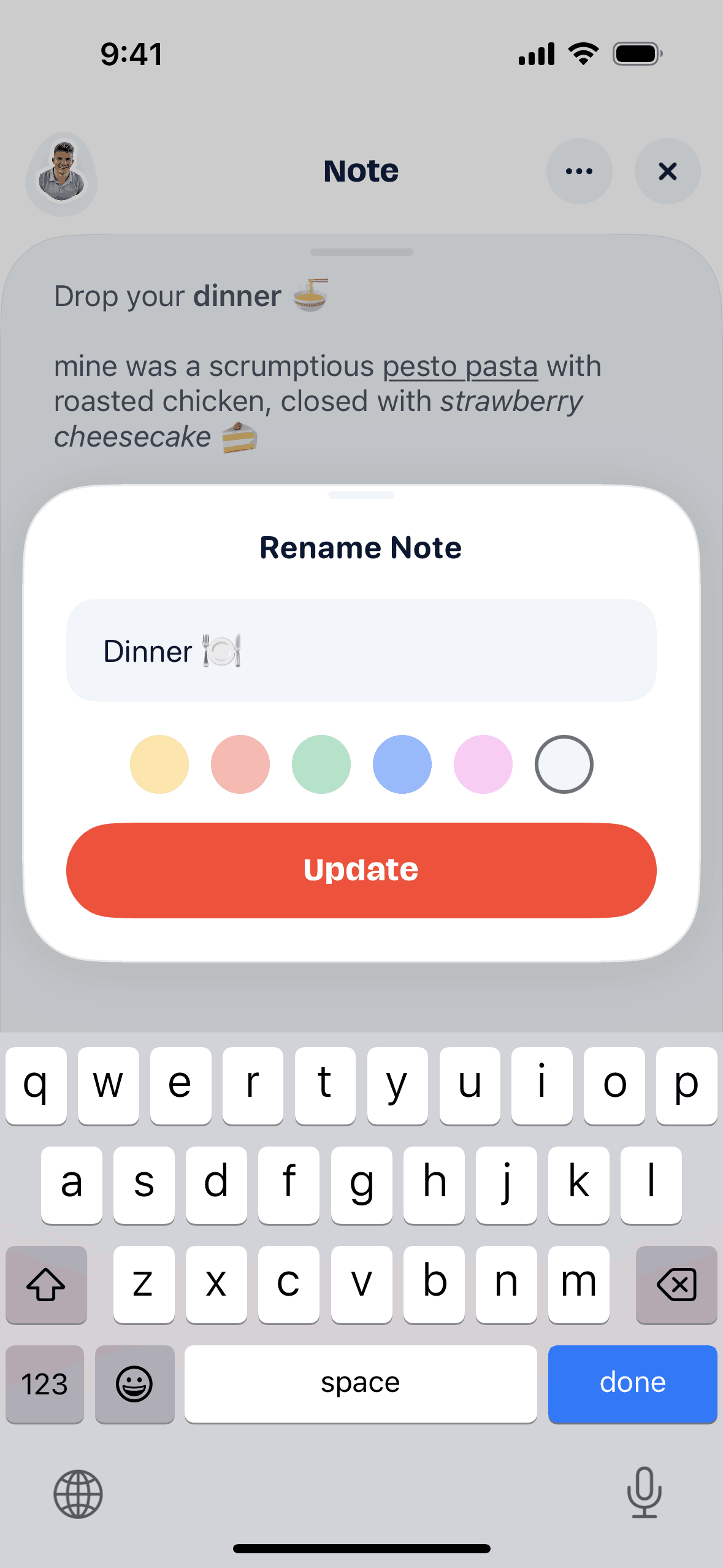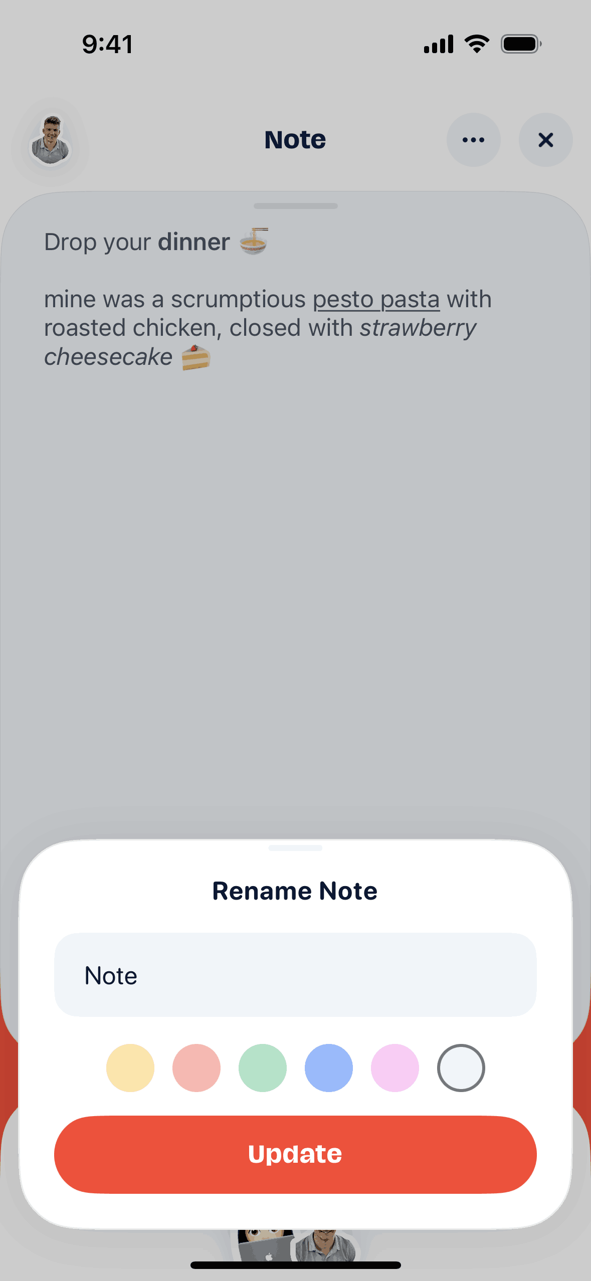The user edits a note by renaming it and changing its background color. The flow involves opening a rename modal and updating the note details.