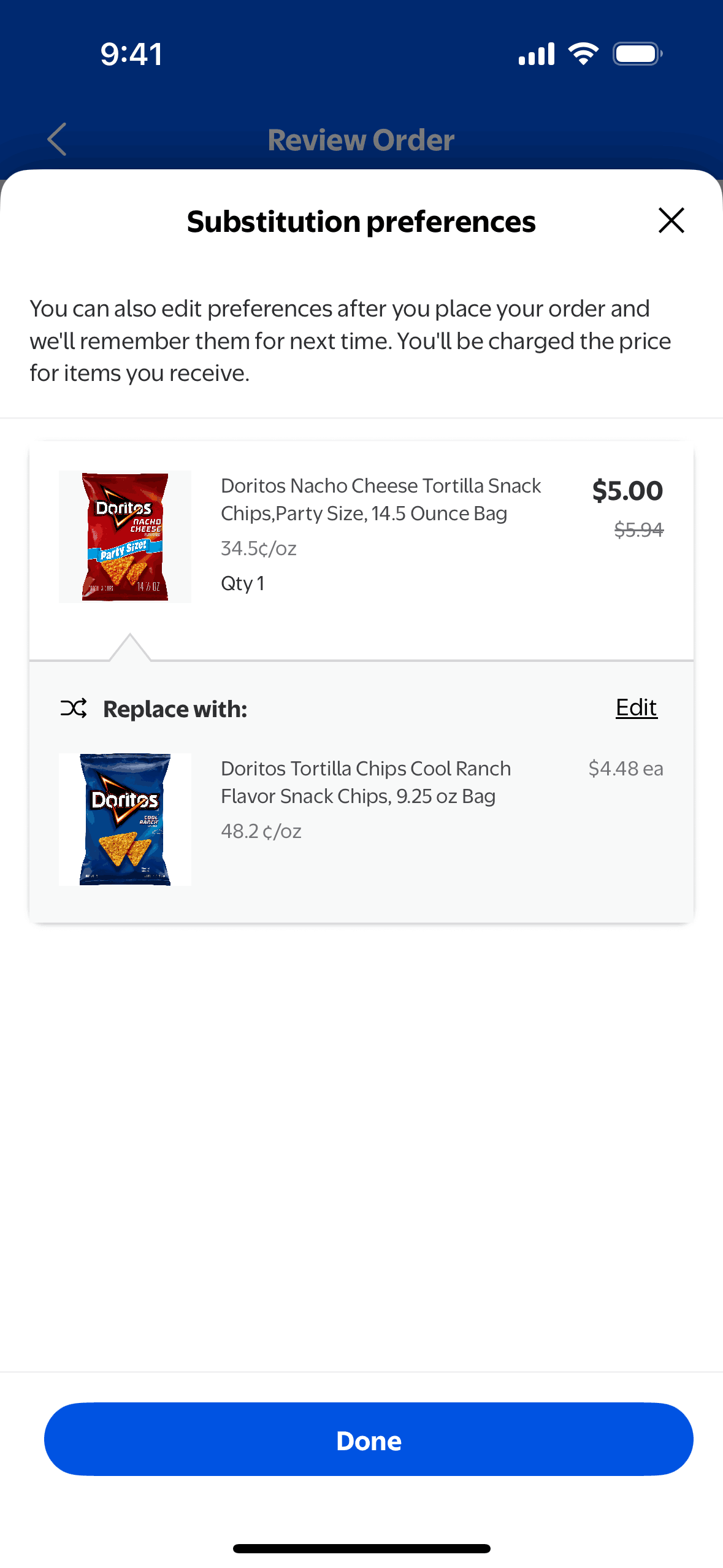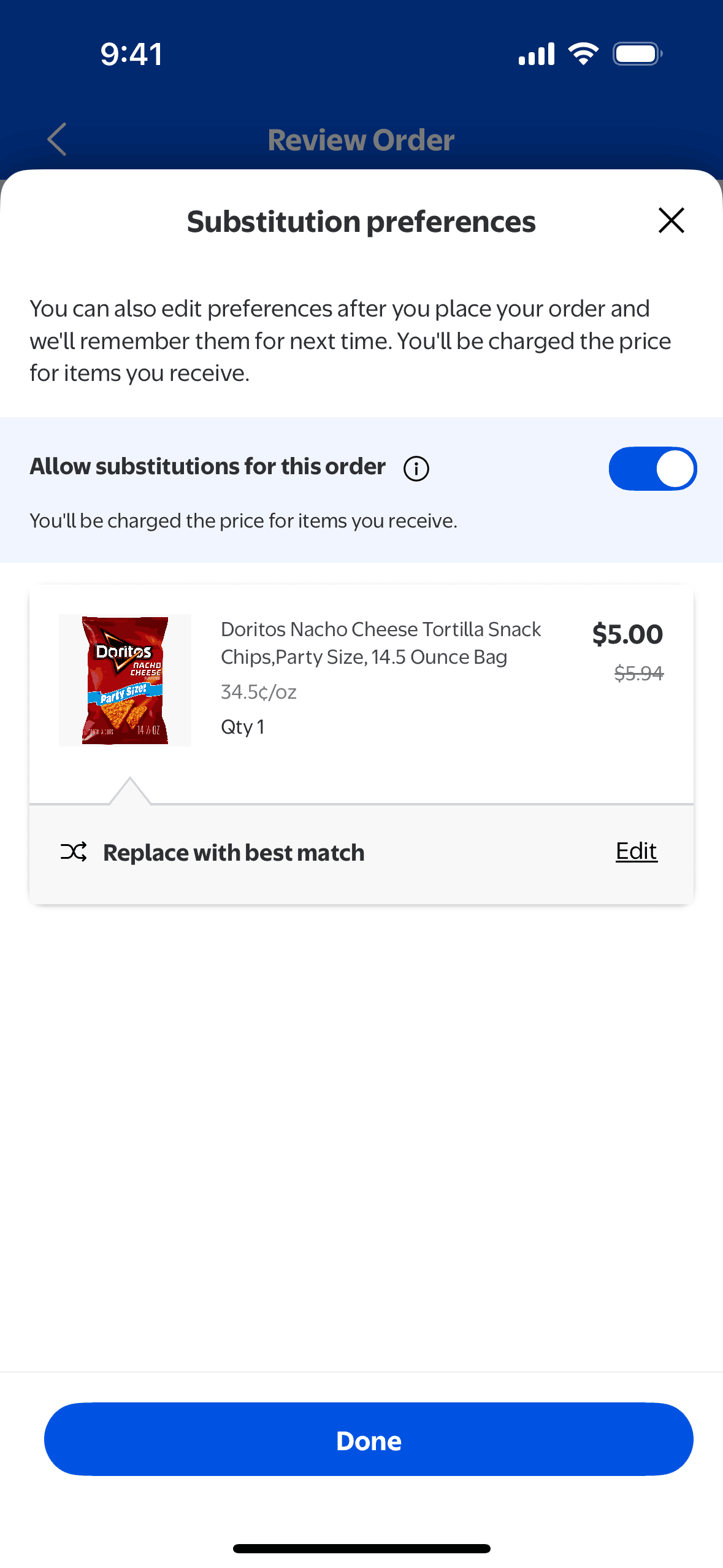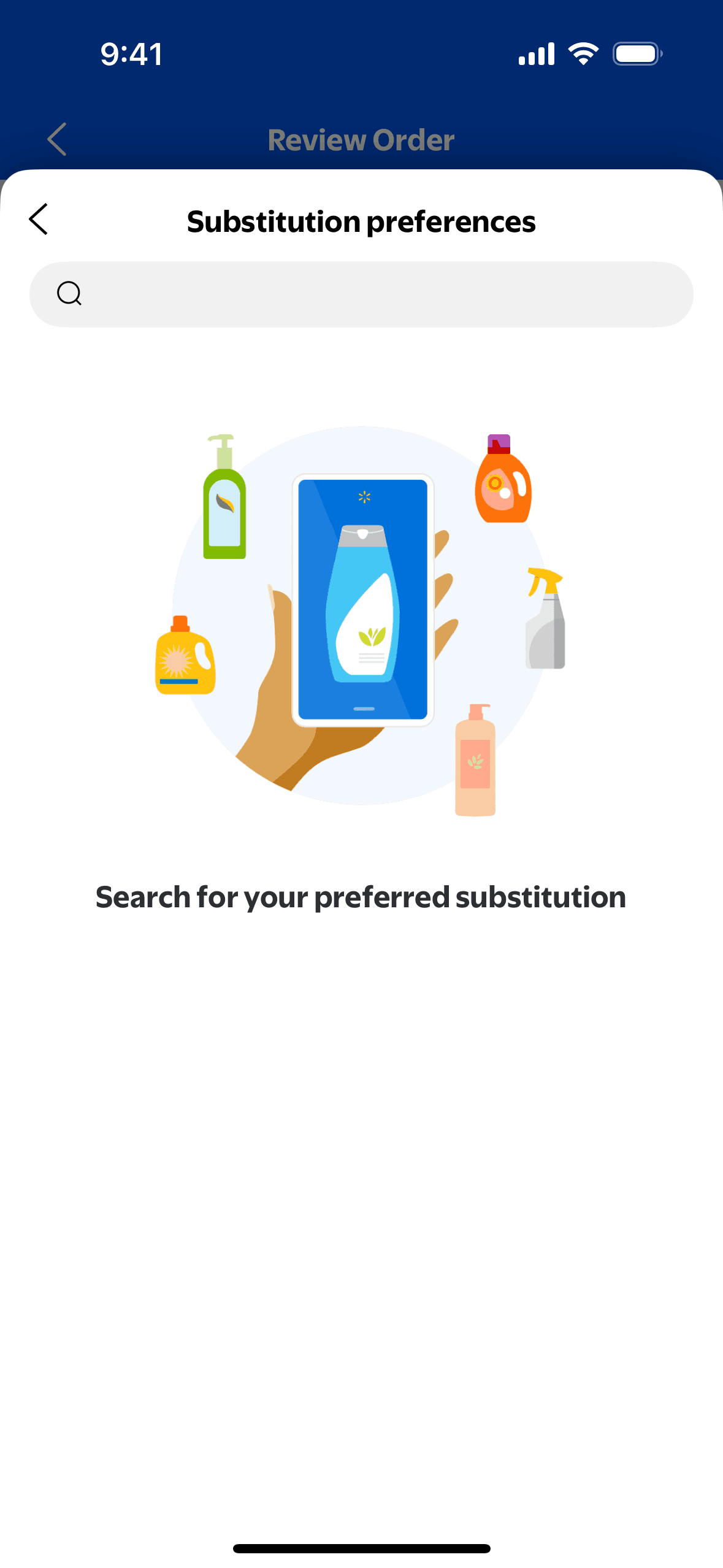 The user flow demonstrates how a user can modify substitution preferences for an order. The user can allow substitutions and select preferred replacement items.