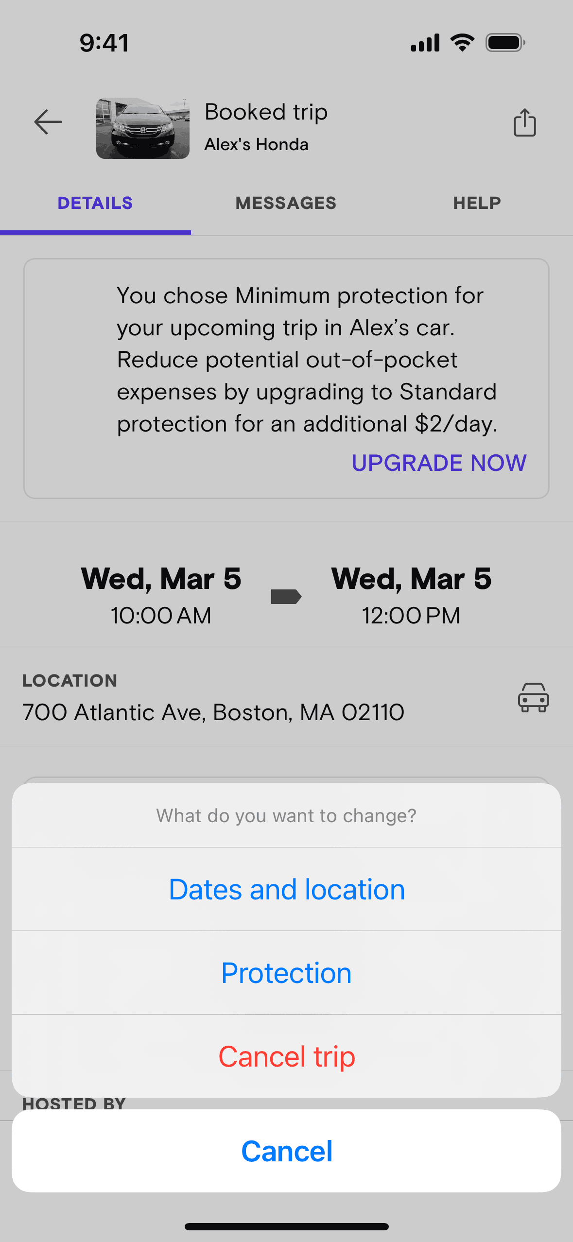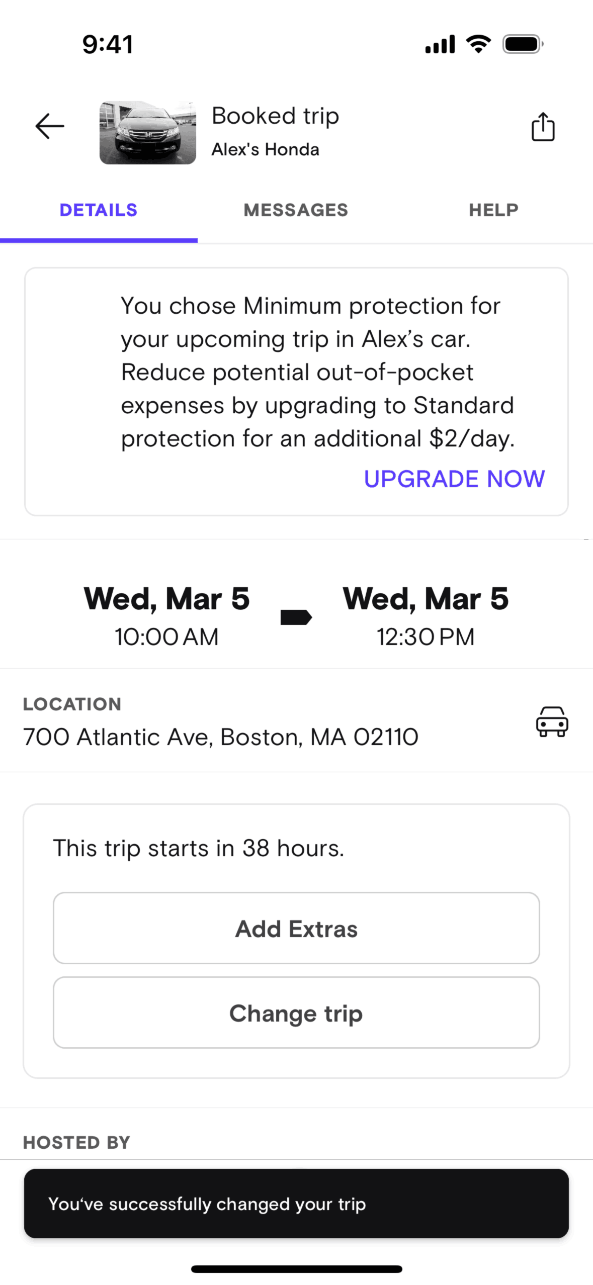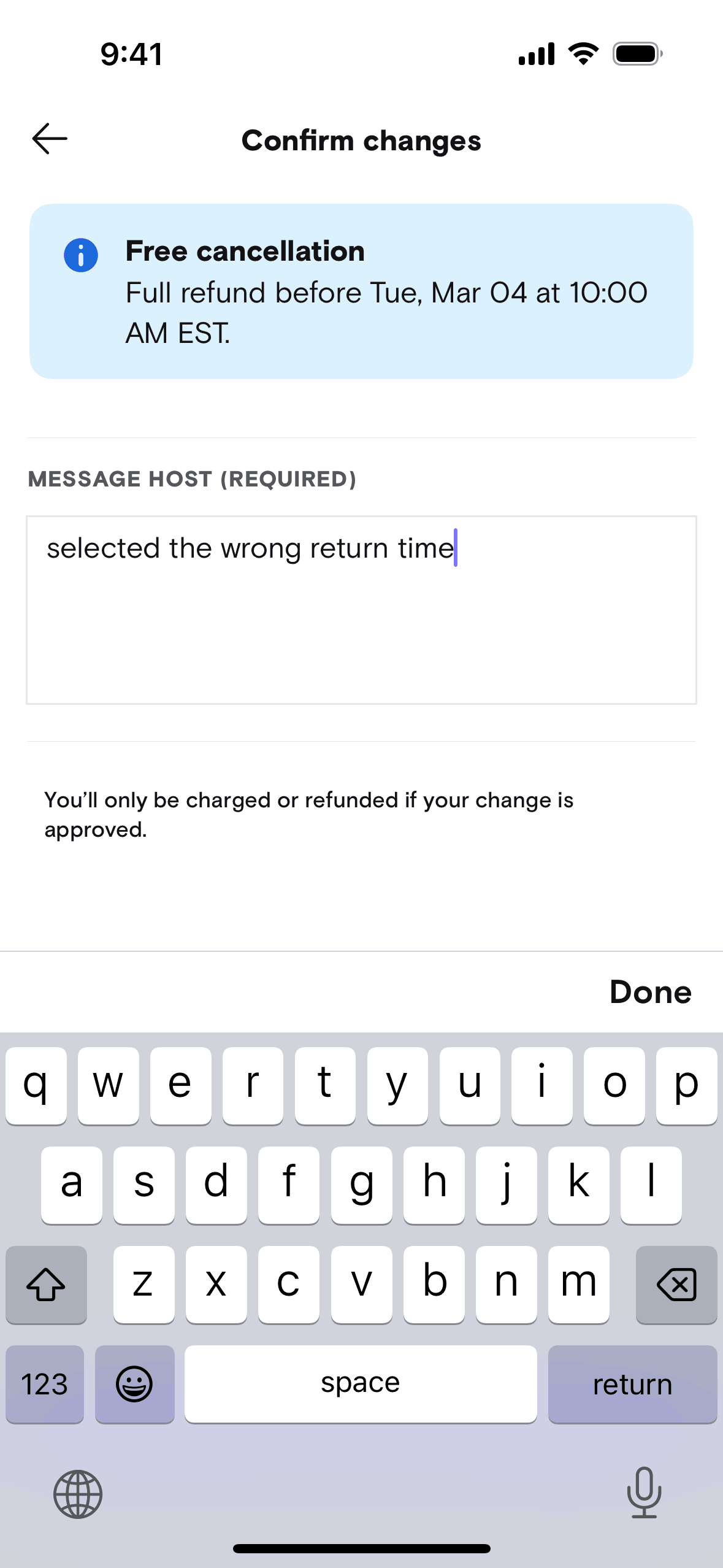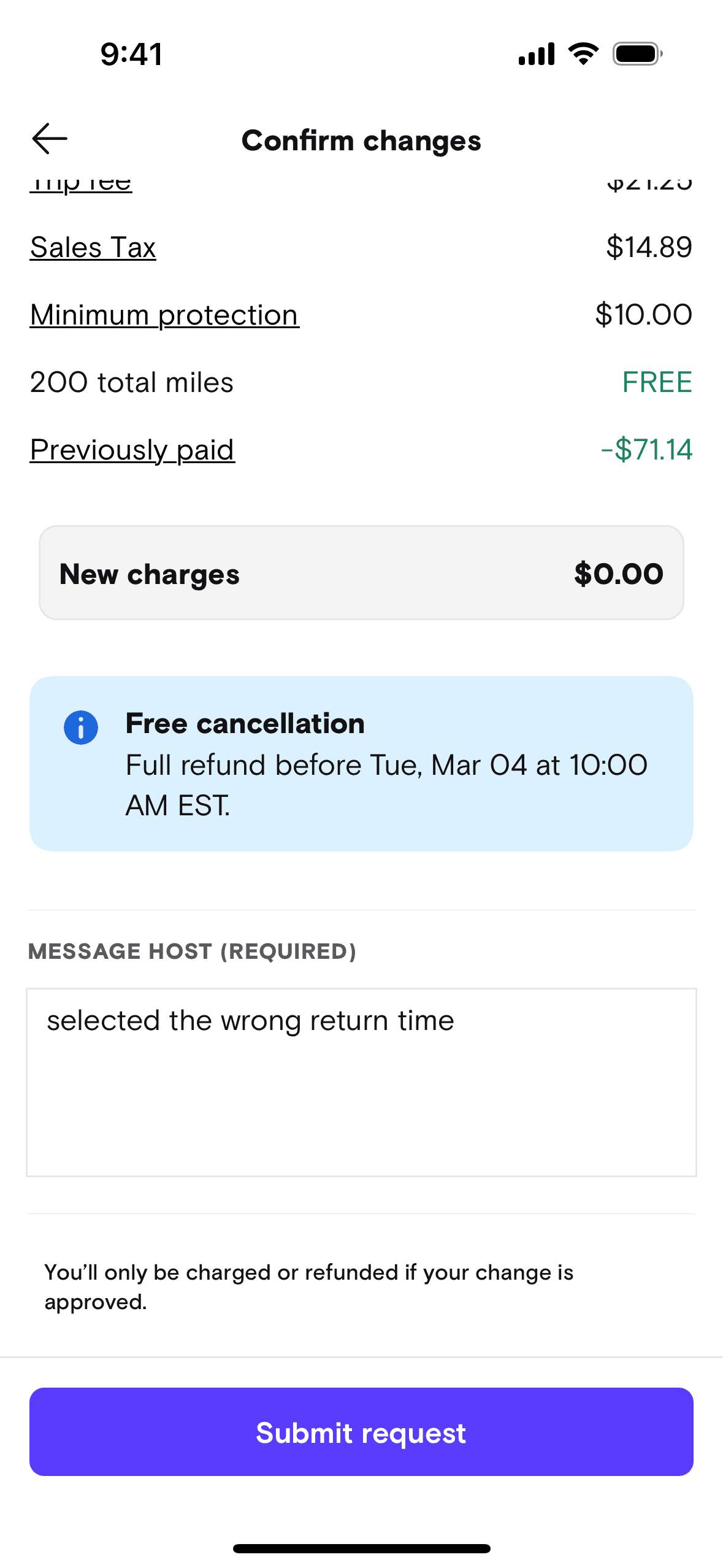 The user modifies the date and time of a booked trip. They confirm the changes and submit a request to the host.