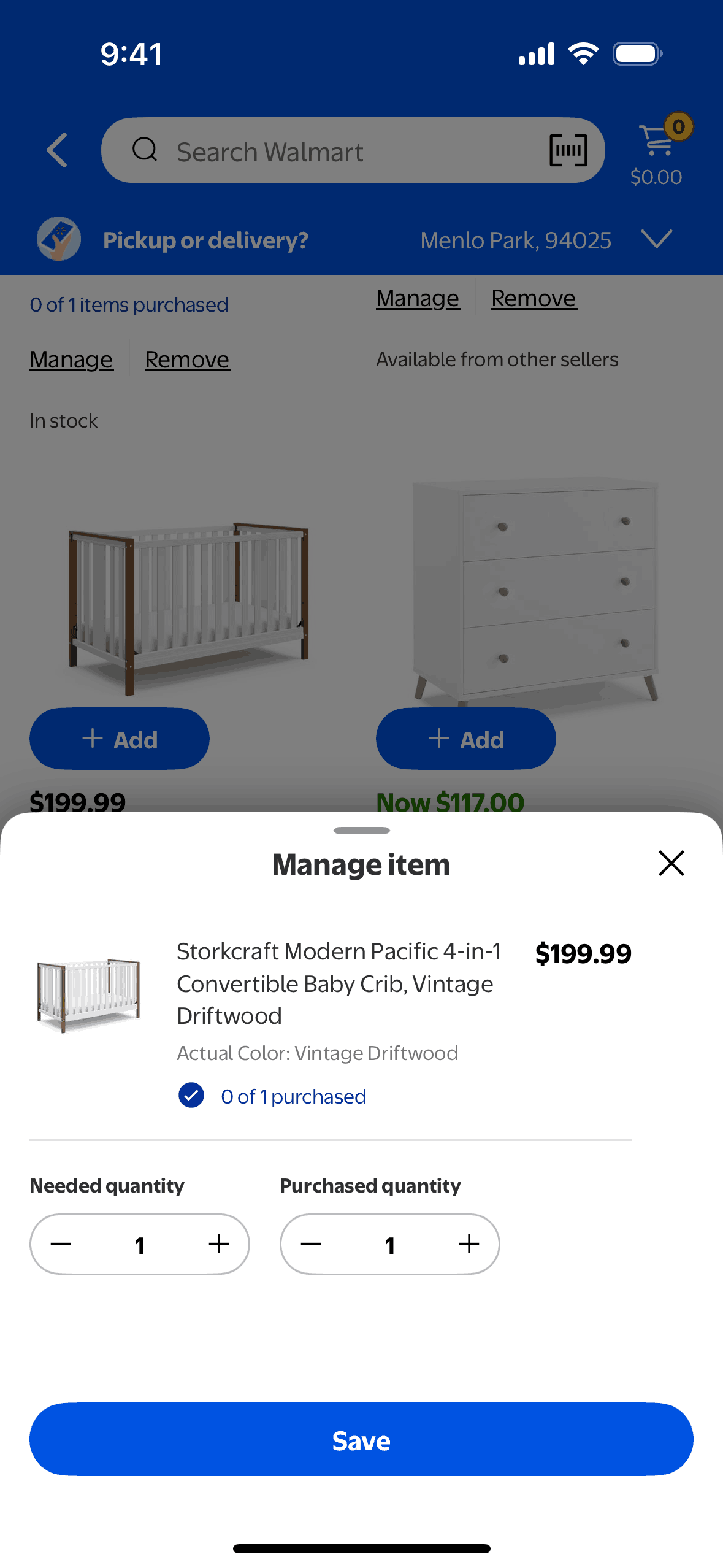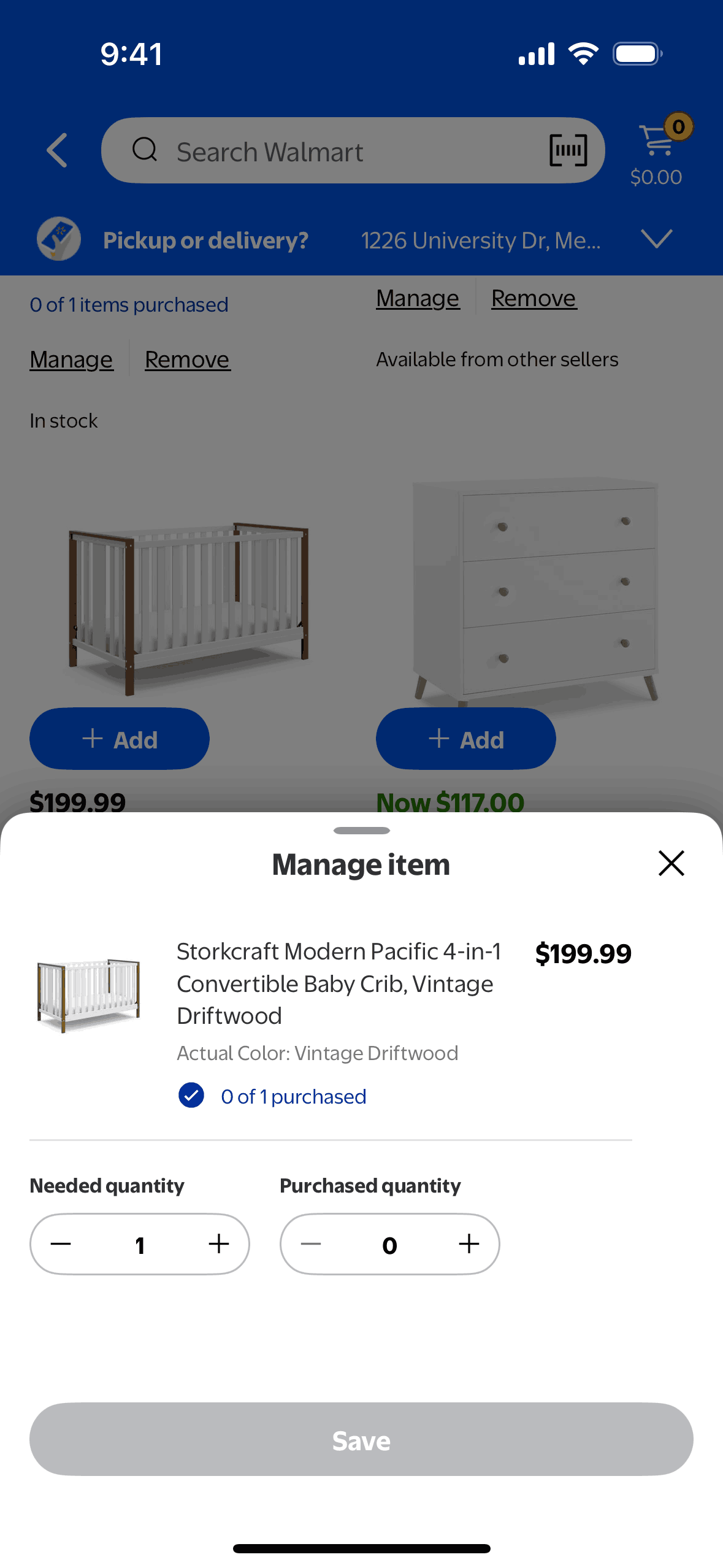 The user manages a product by adjusting the quantity in a modal. The product listing then updates to reflect the changes.