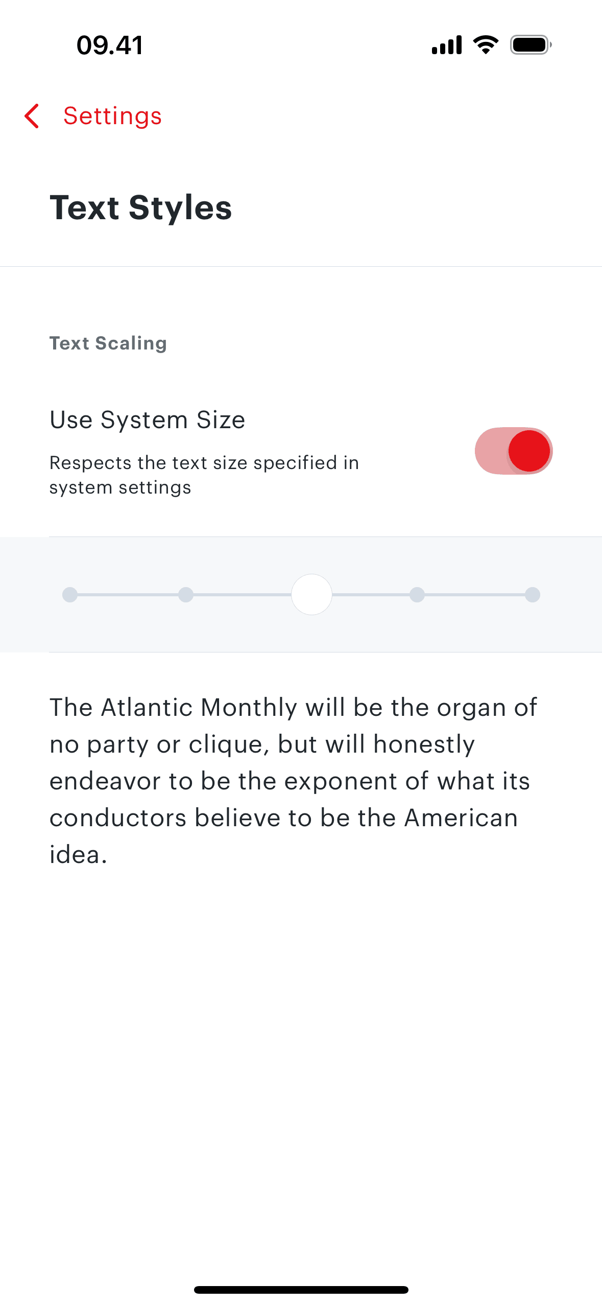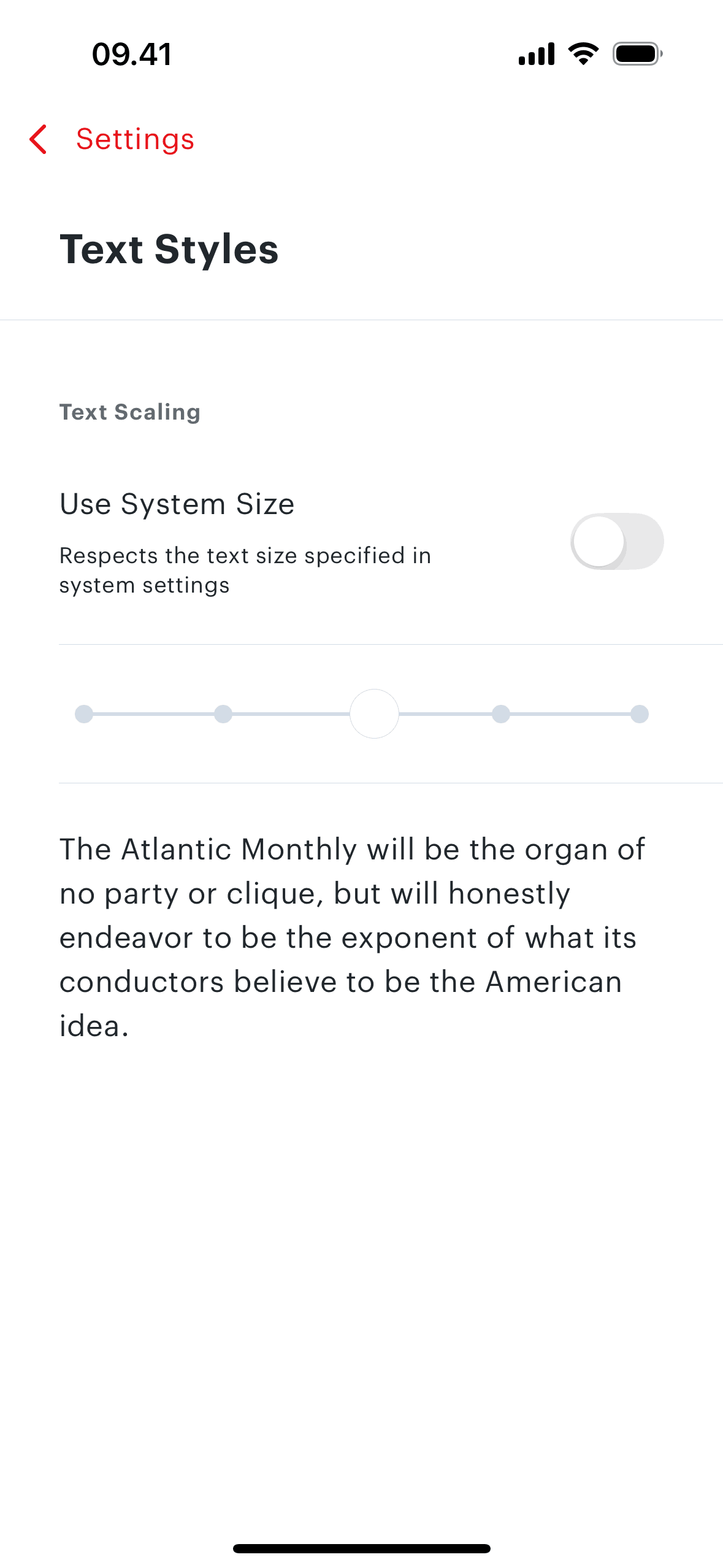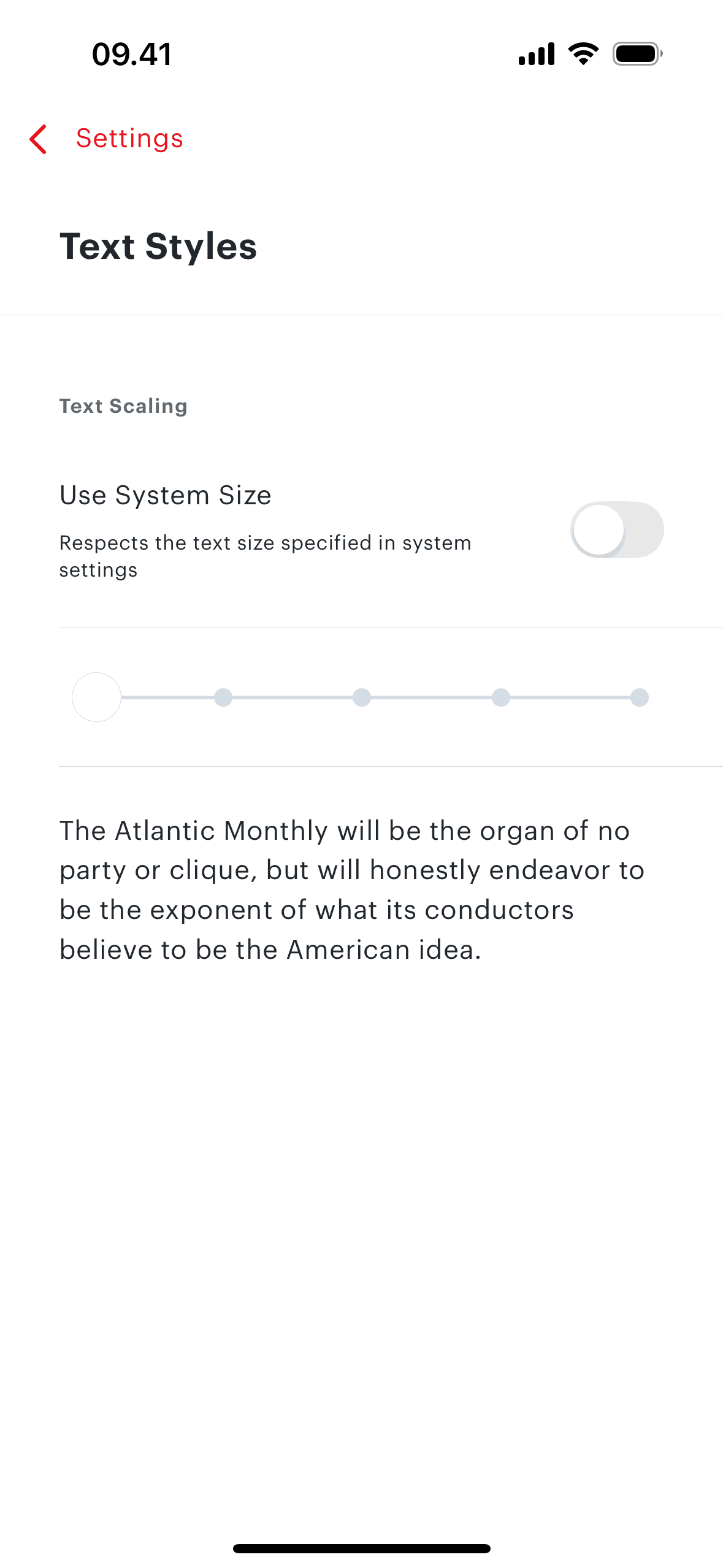 The user accesses text style settings, disables system text size, and sets the text scaling to the minimum size. The flow demonstrates customizing text appearance.