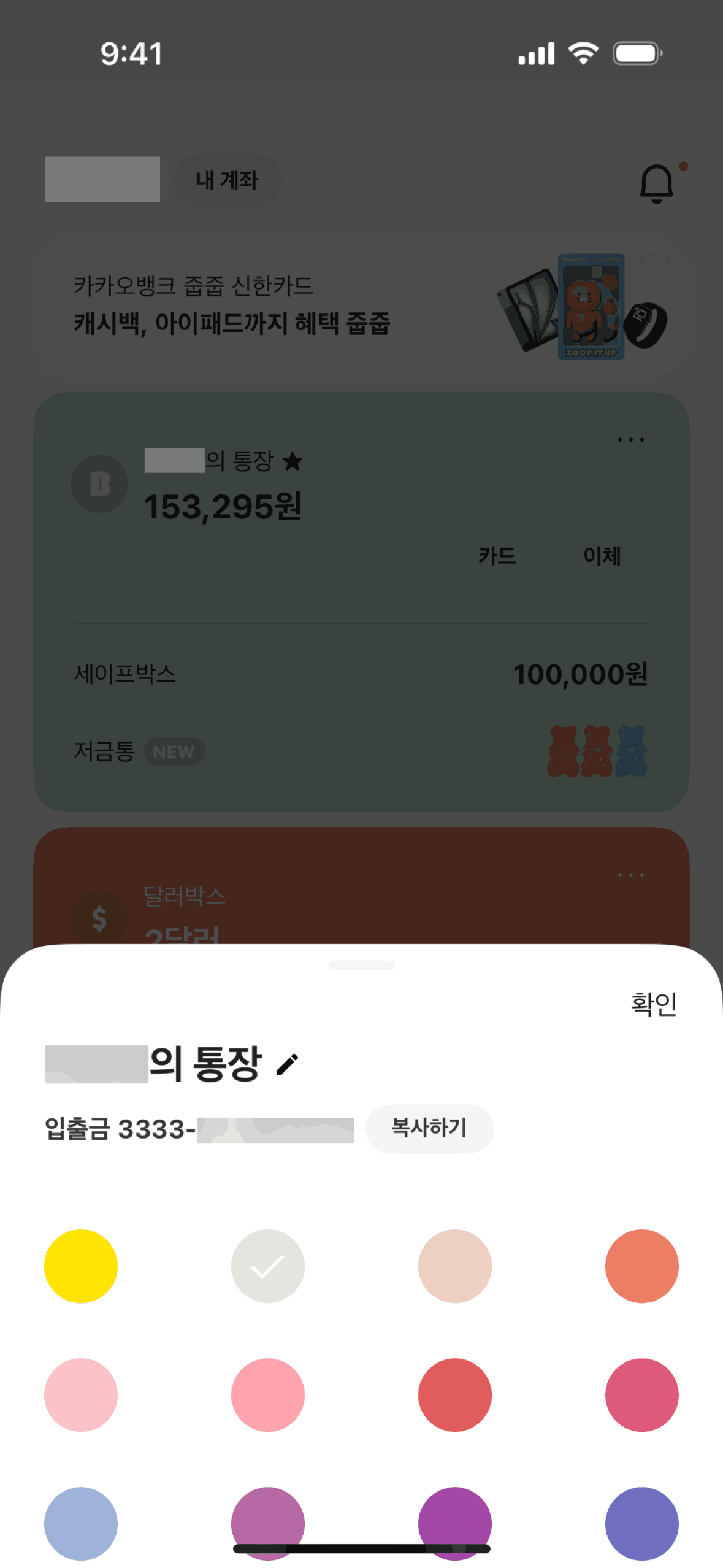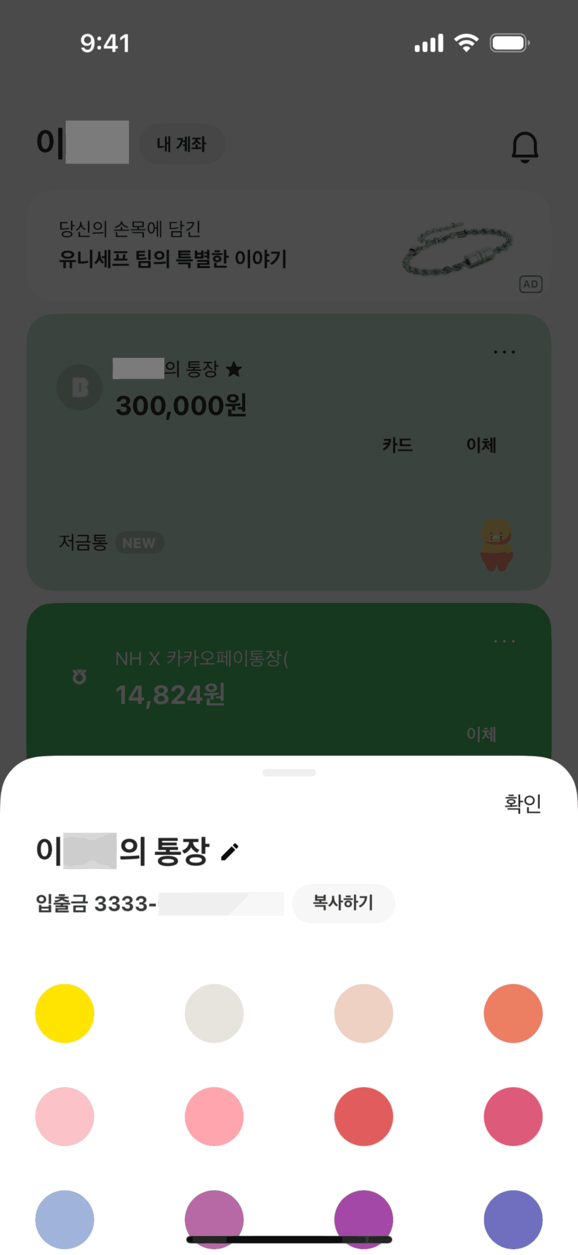 The user flow demonstrates editing an account's appearance by changing its color and name. The updated account details are then reflected on the account overview.