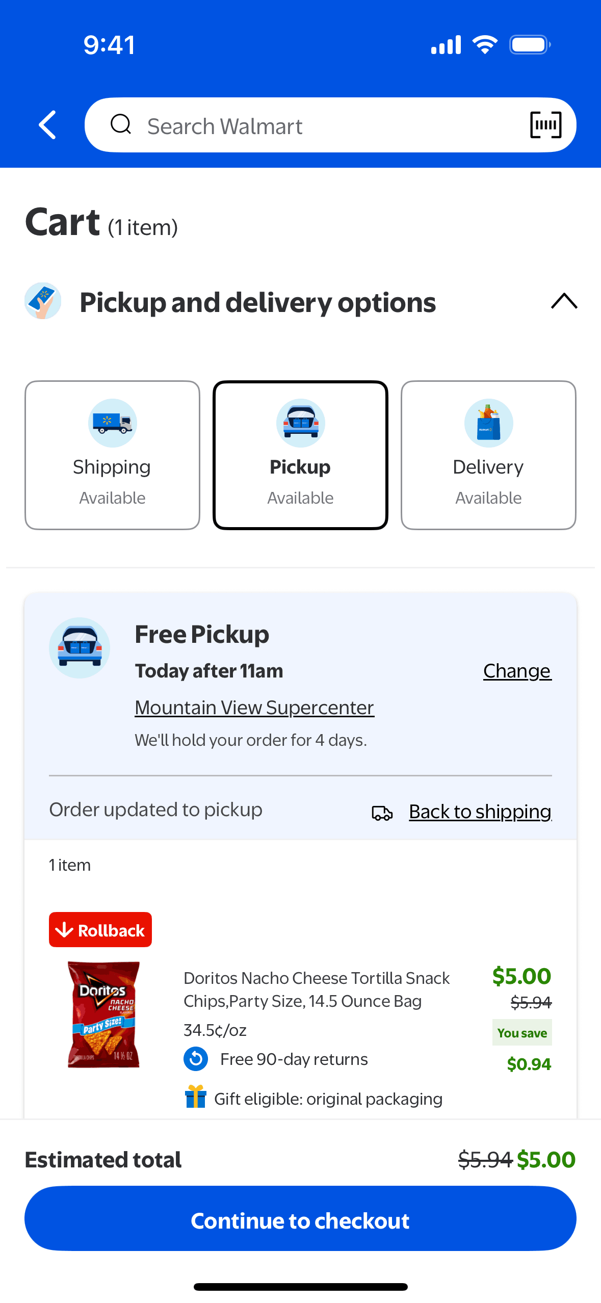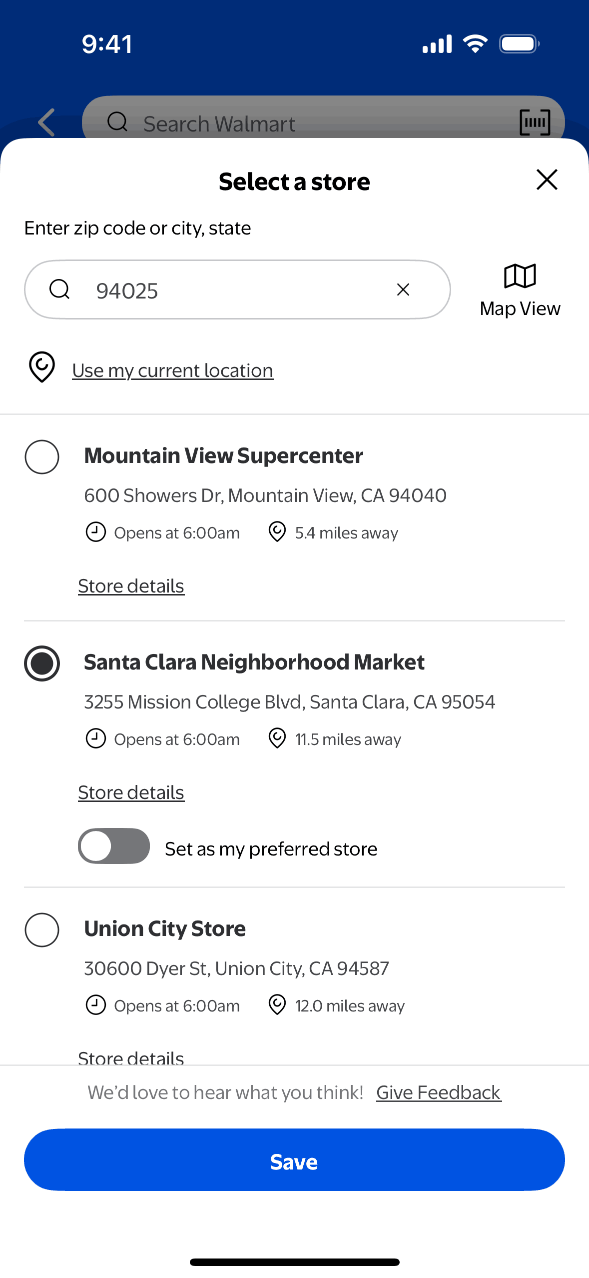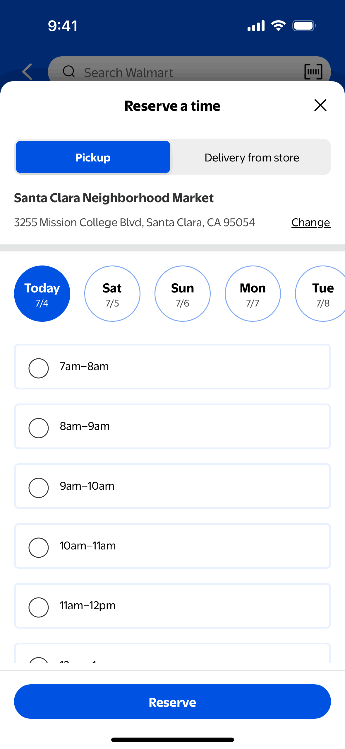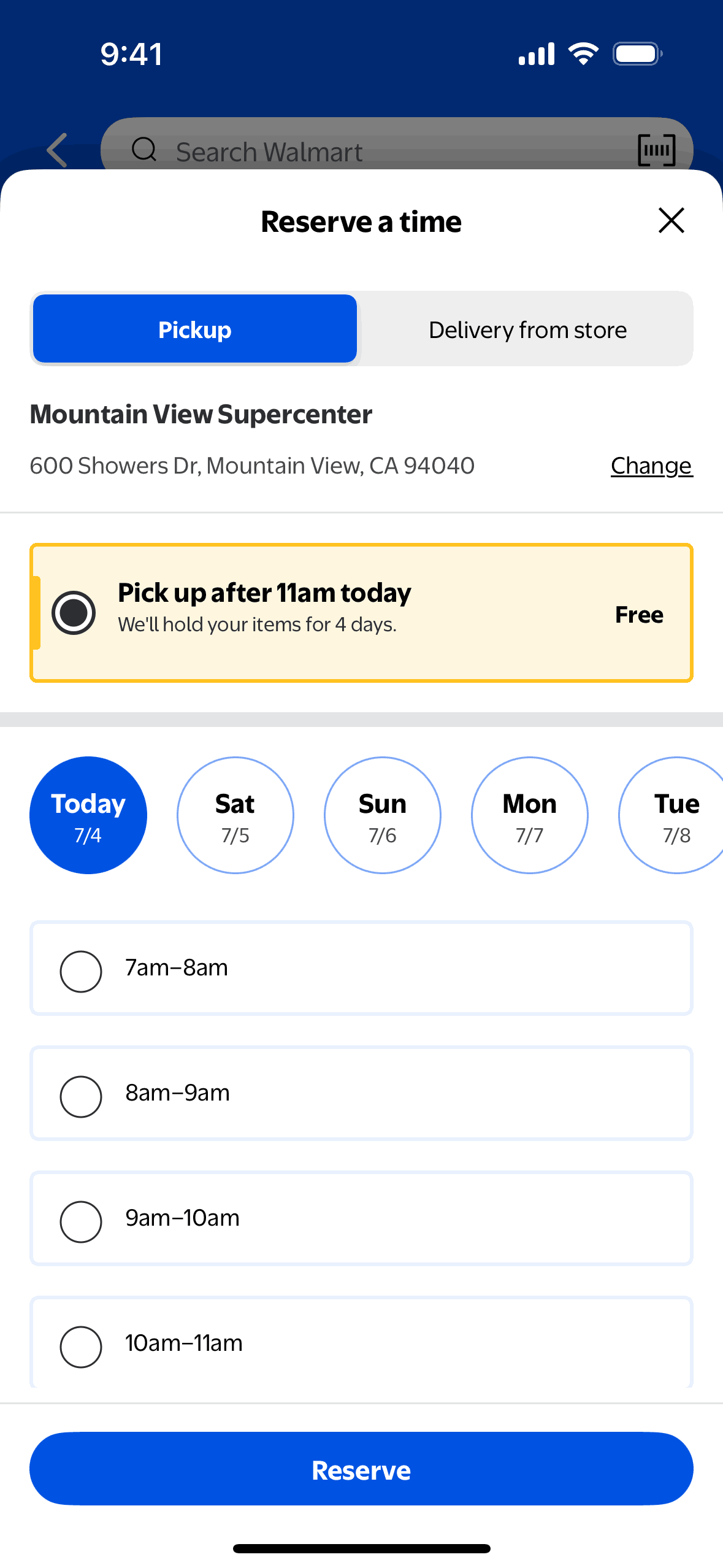 The user flow demonstrates changing the pickup store for an order. It involves navigating through store selection and time reservation screens.