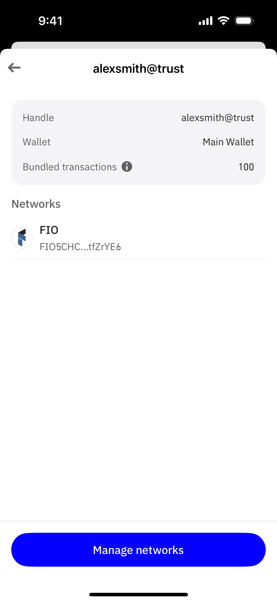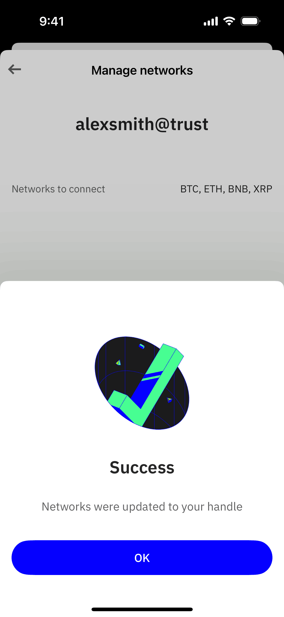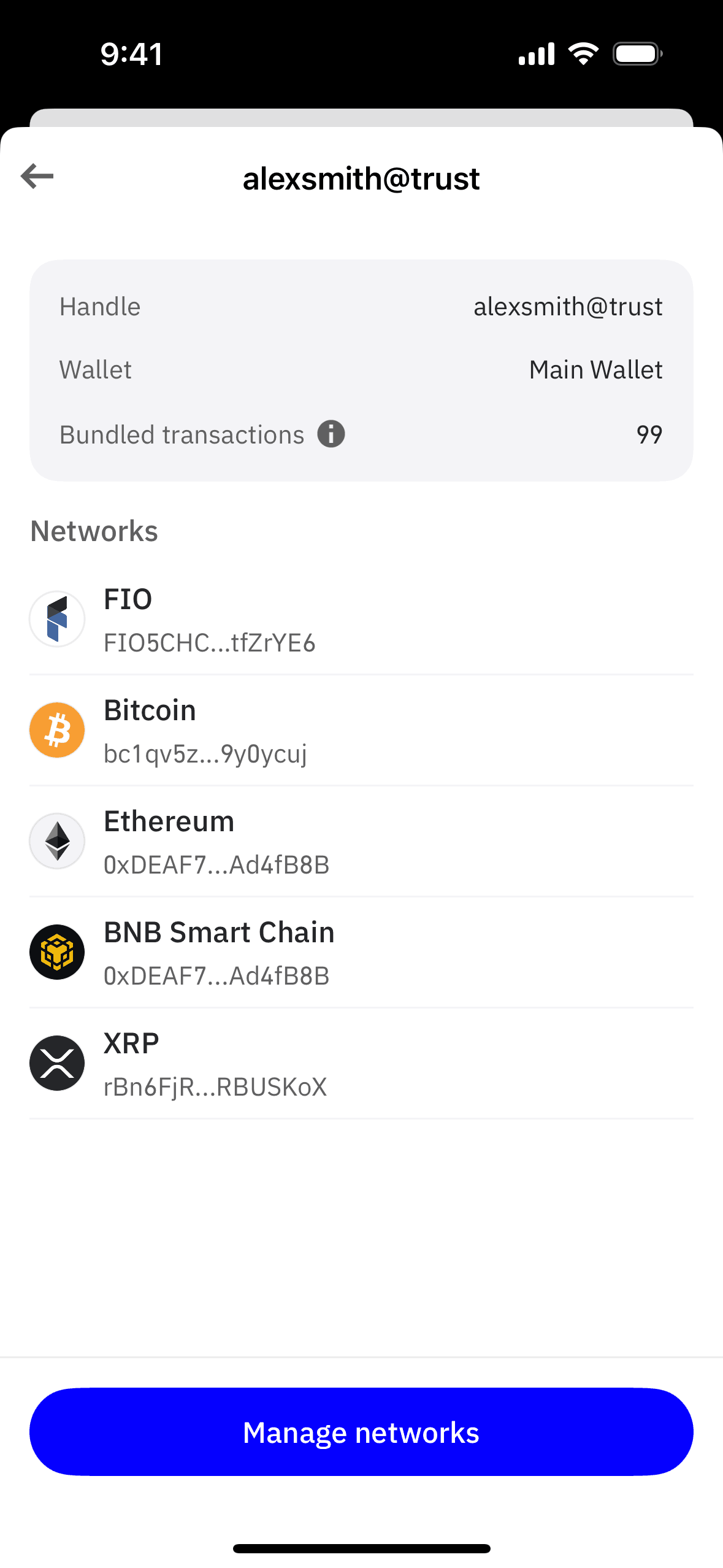 The user flow showcases managing networks for a wallet handle. It involves selecting networks and confirming the changes.