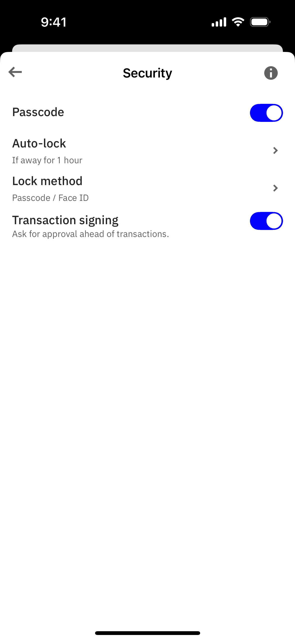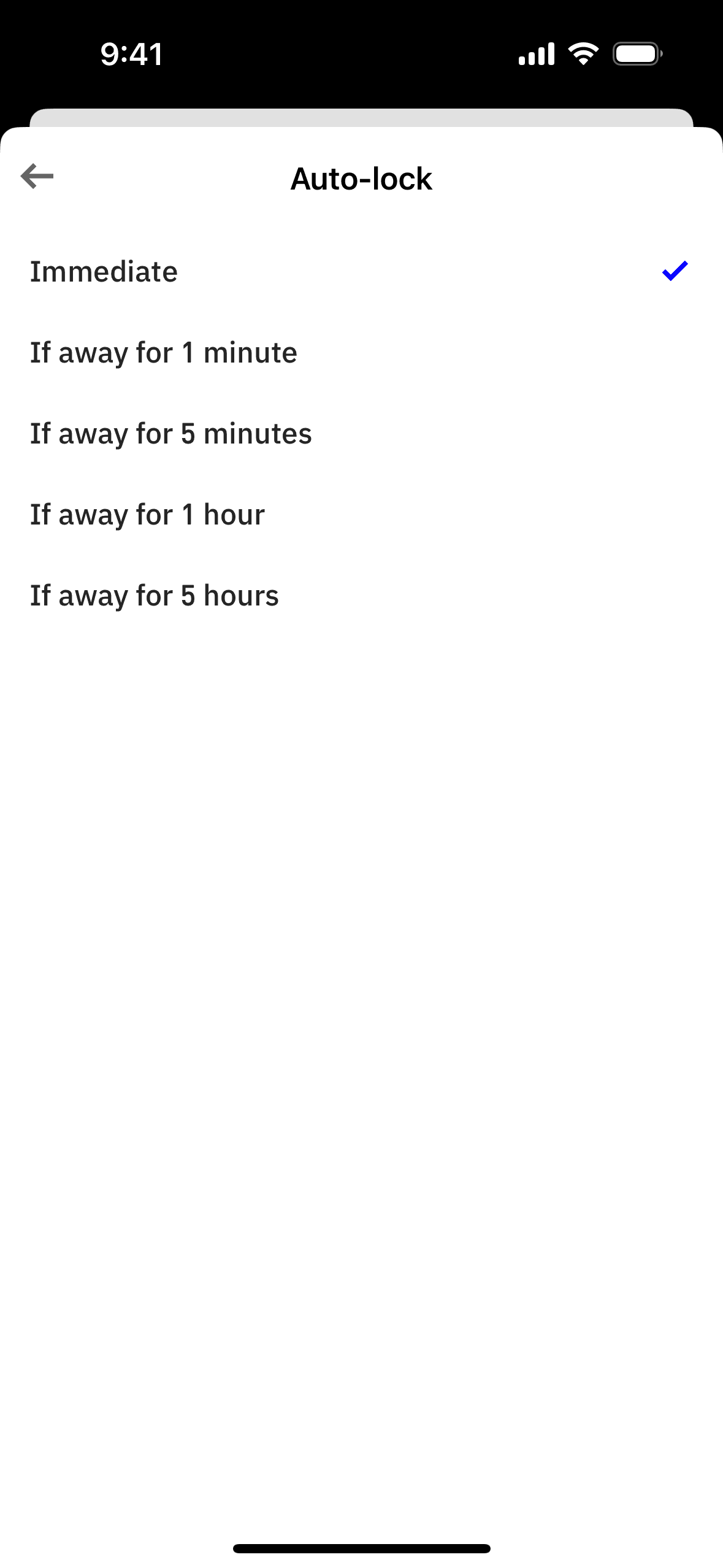 The user navigates through settings to update the auto-lock timer. The flow demonstrates changing the auto-lock setting from immediate to 1 hour.