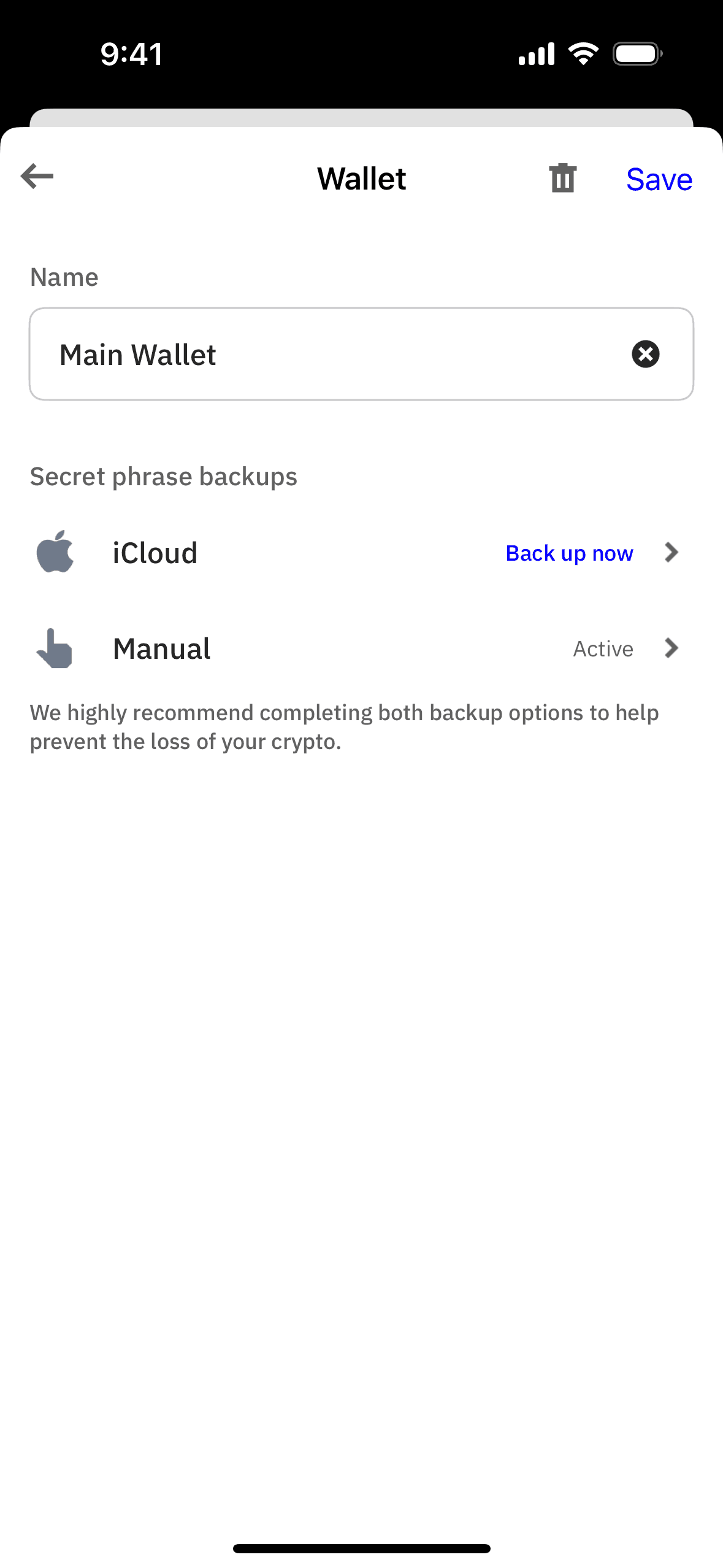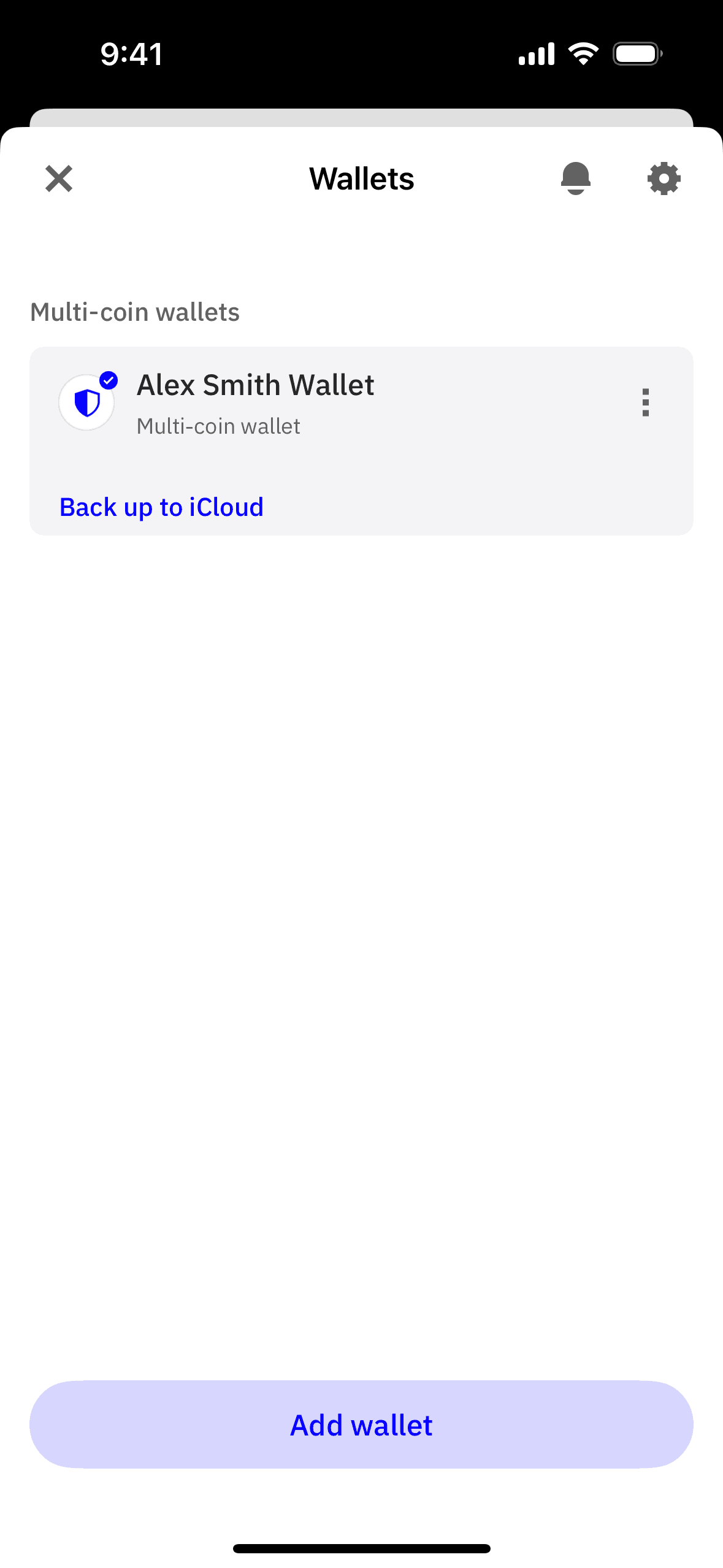 The user edits the wallet name from "Main Wallet" to "Alex Smith Wallet". The updated name is then displayed in the wallets list.