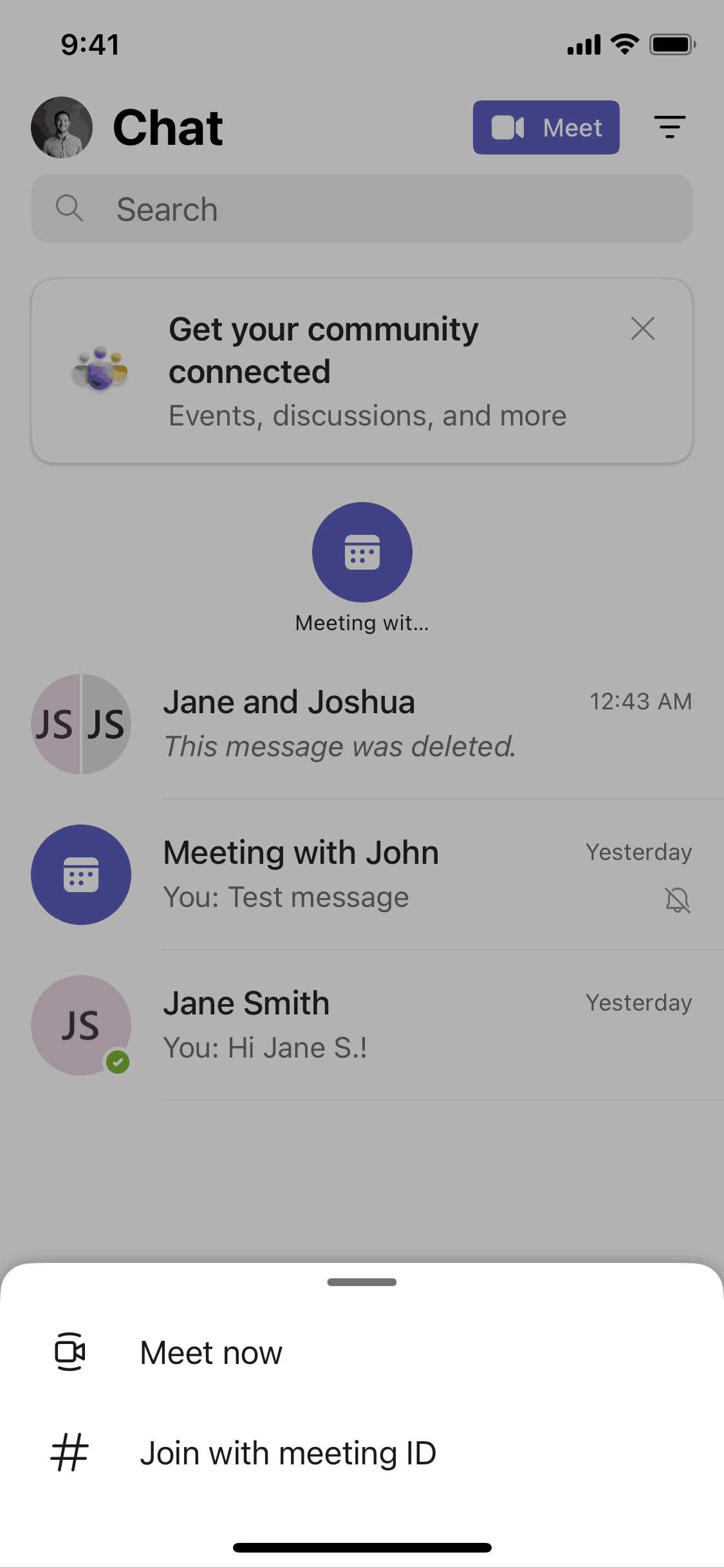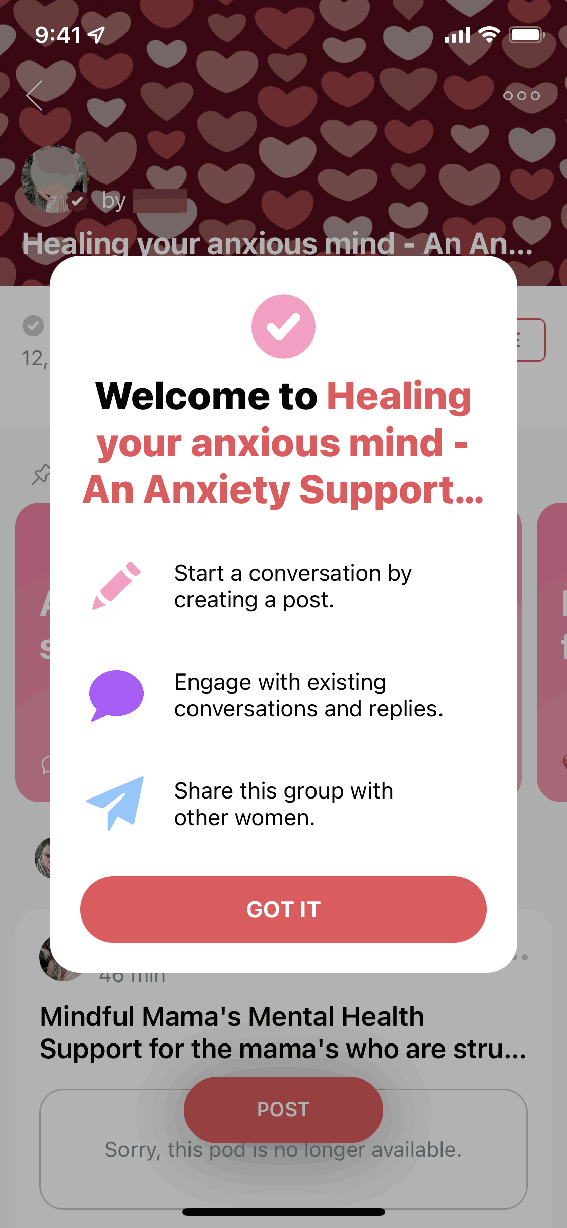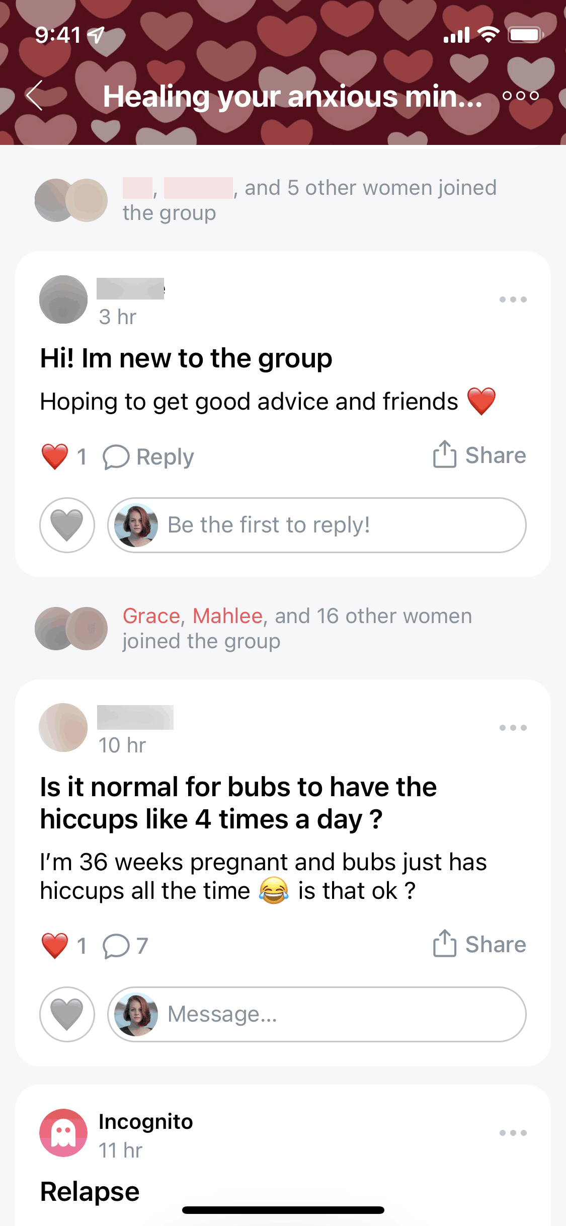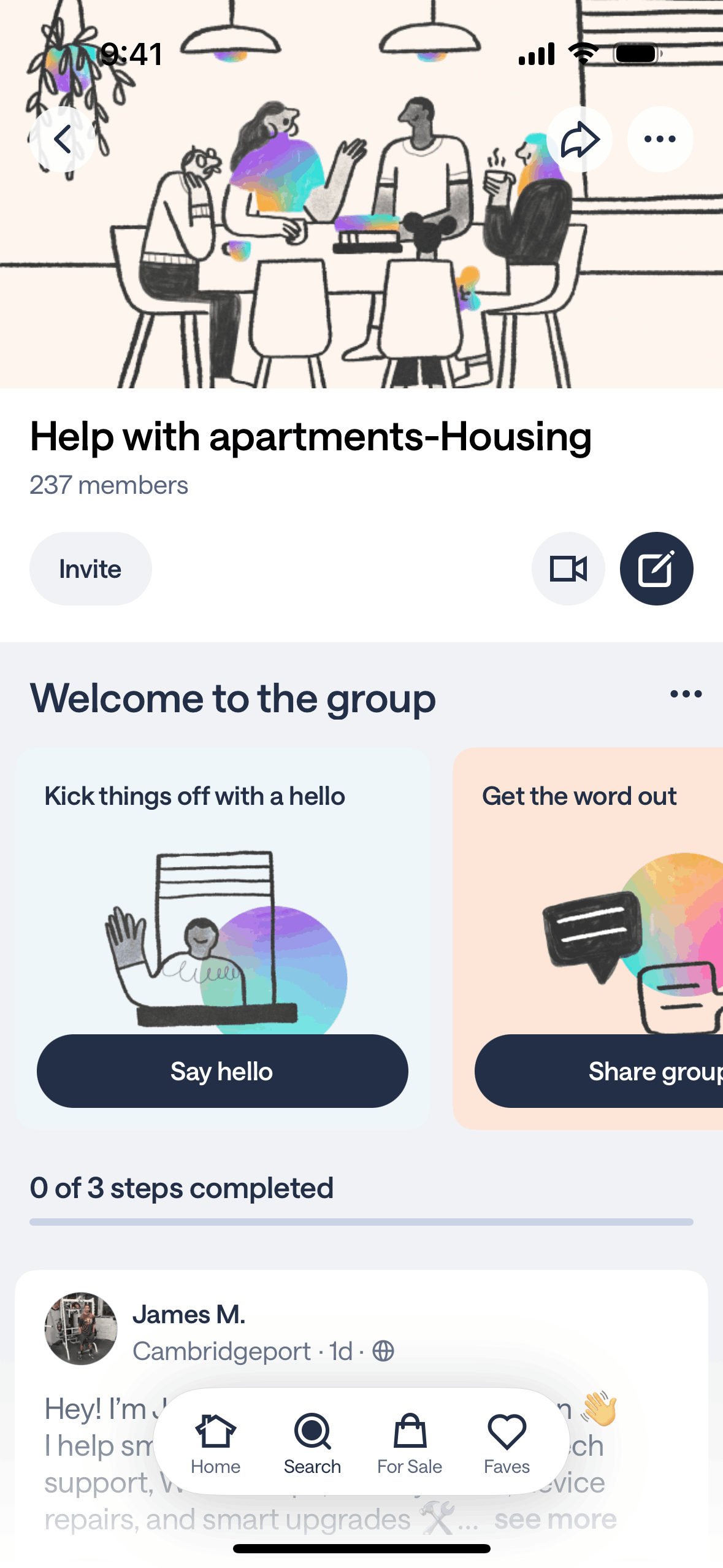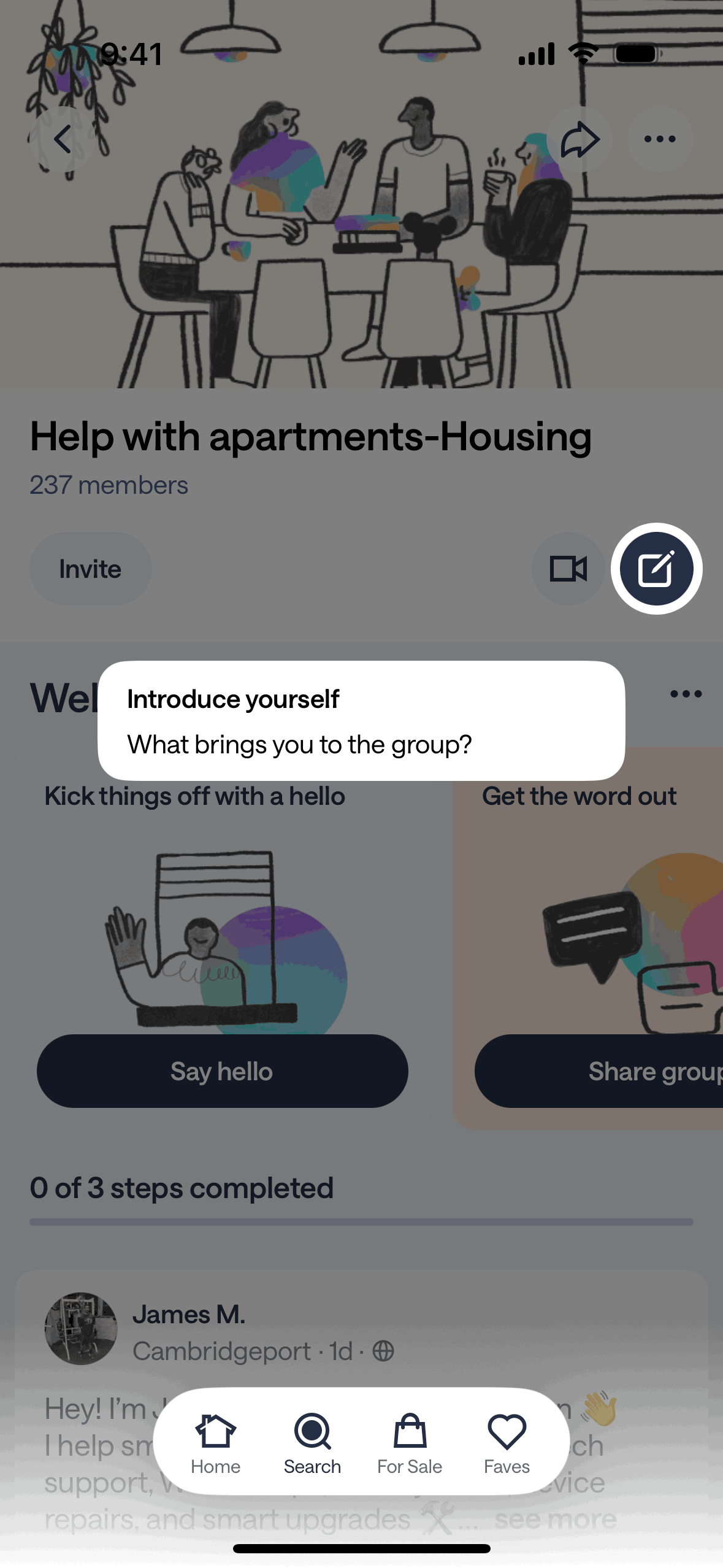 The user joins a group, is prompted to introduce themselves, and is then presented with options to engage with the group. The flow showcases the onboarding process for a new group member.