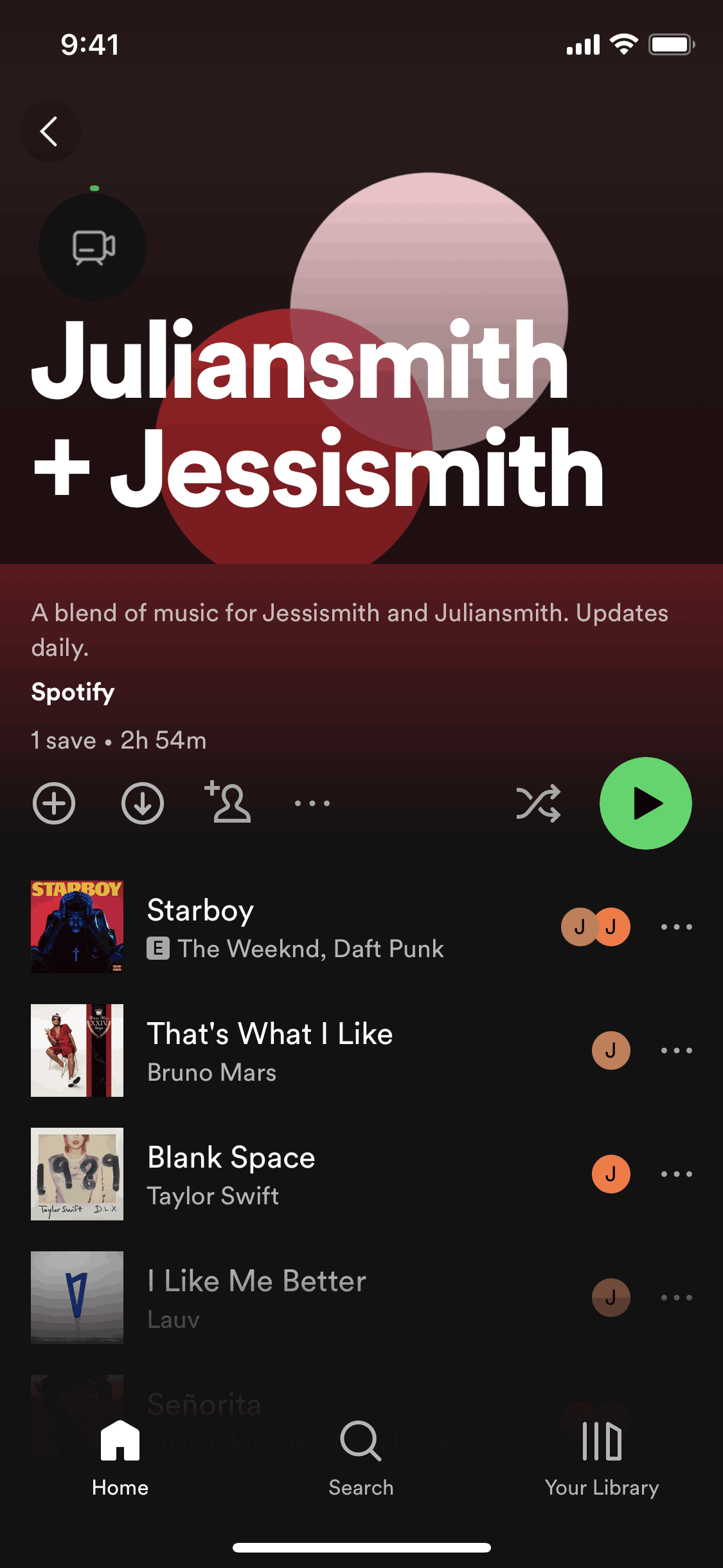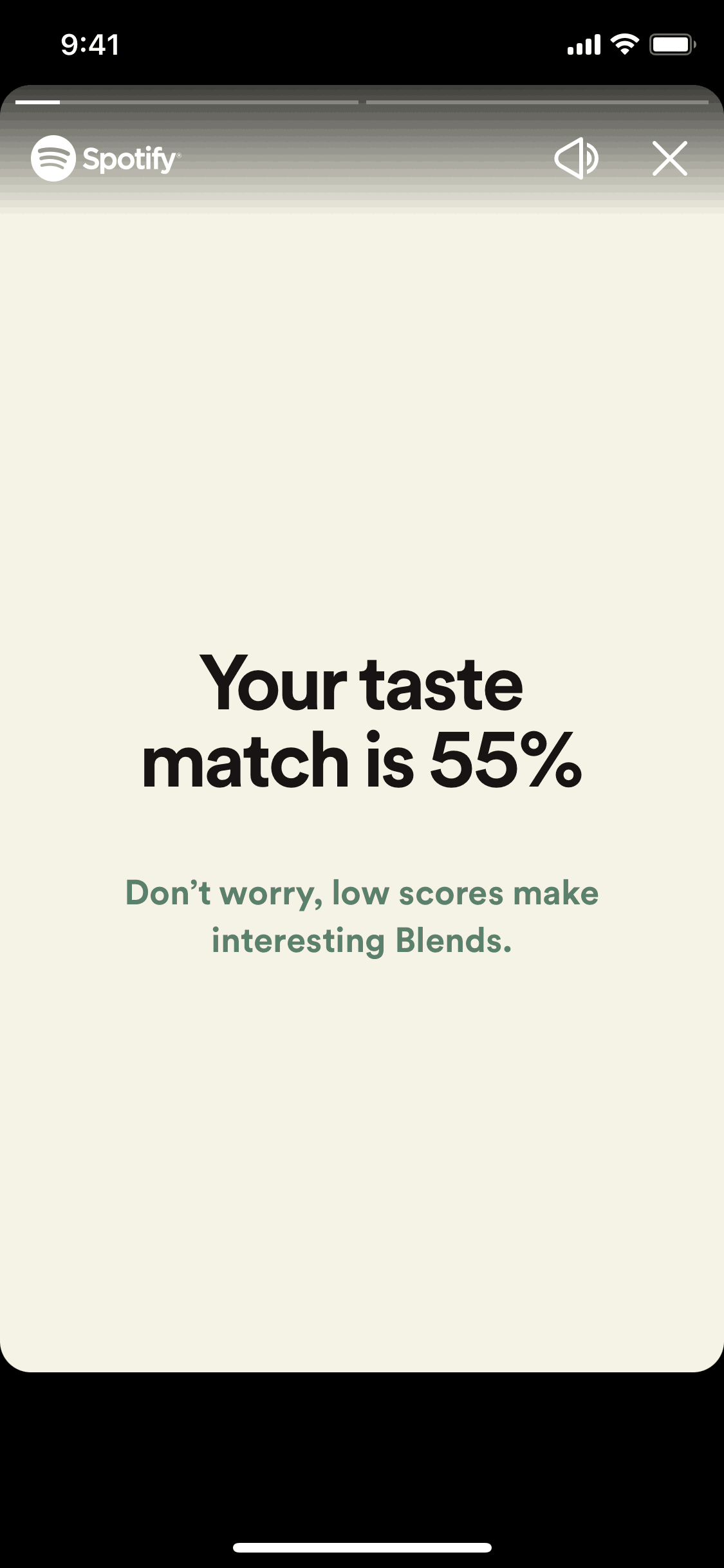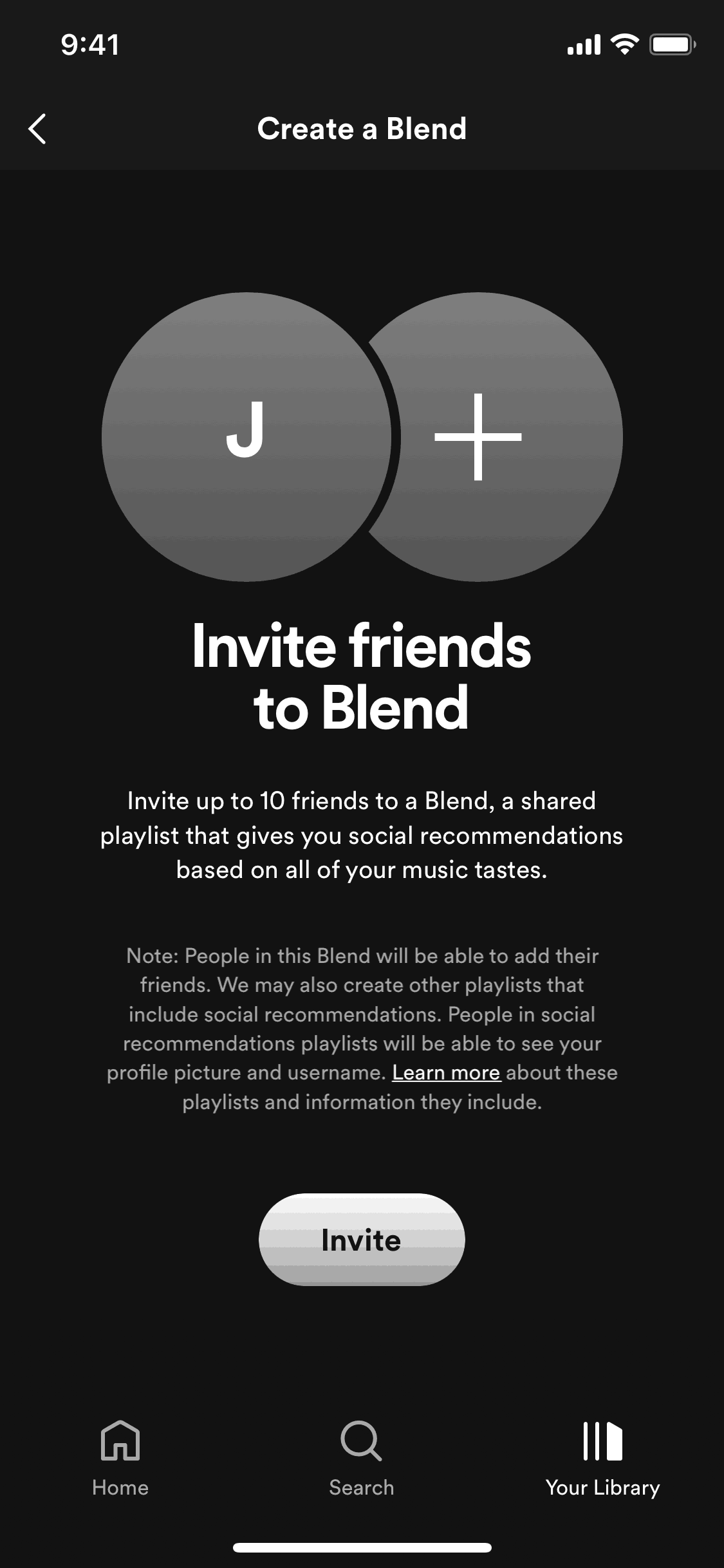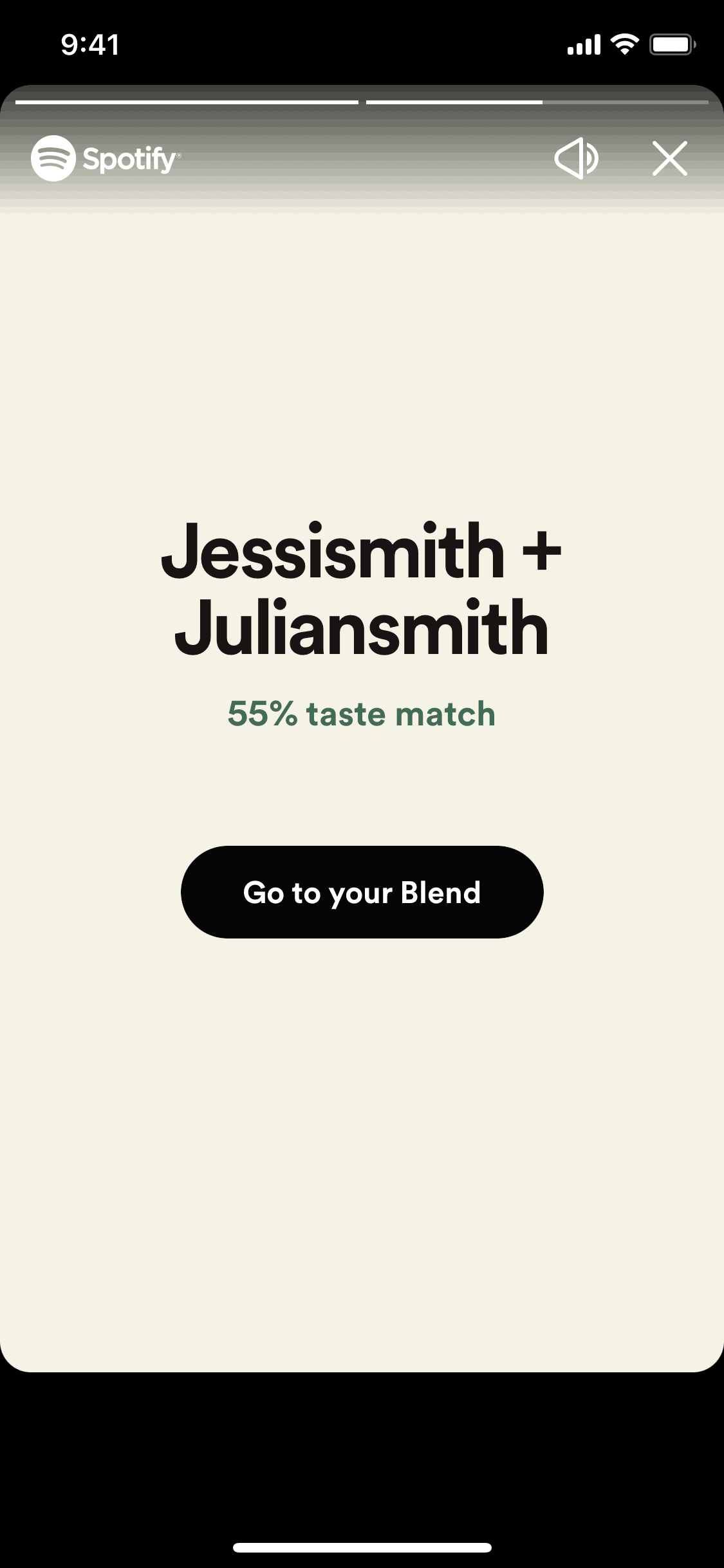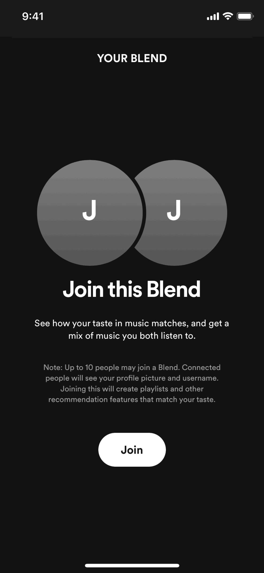 The user creates or joins a music blend with a friend. They view their taste match and then access the combined playlist.
