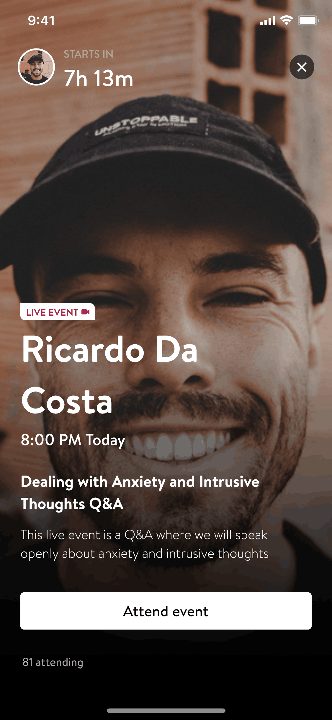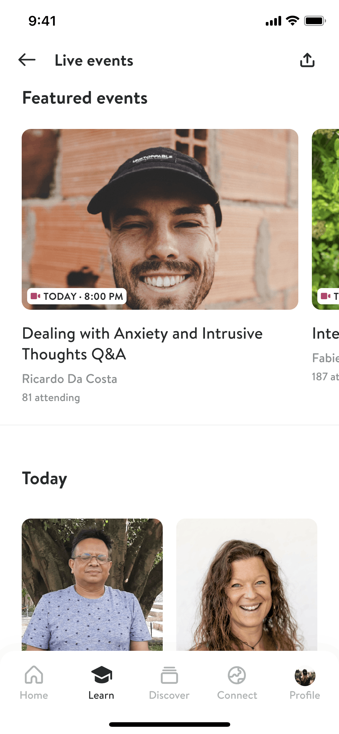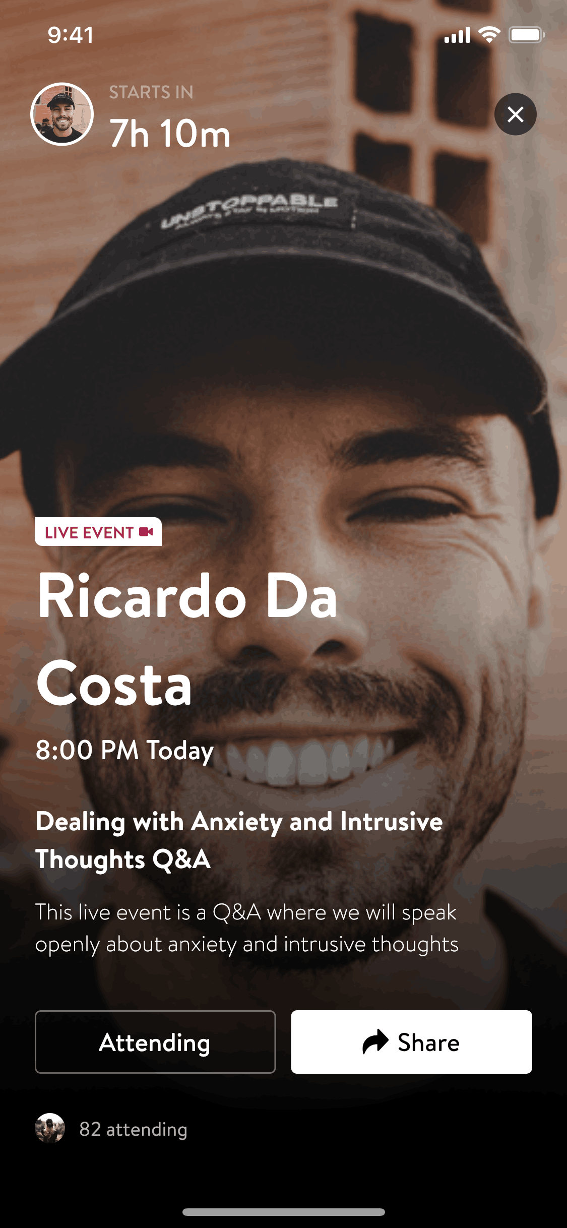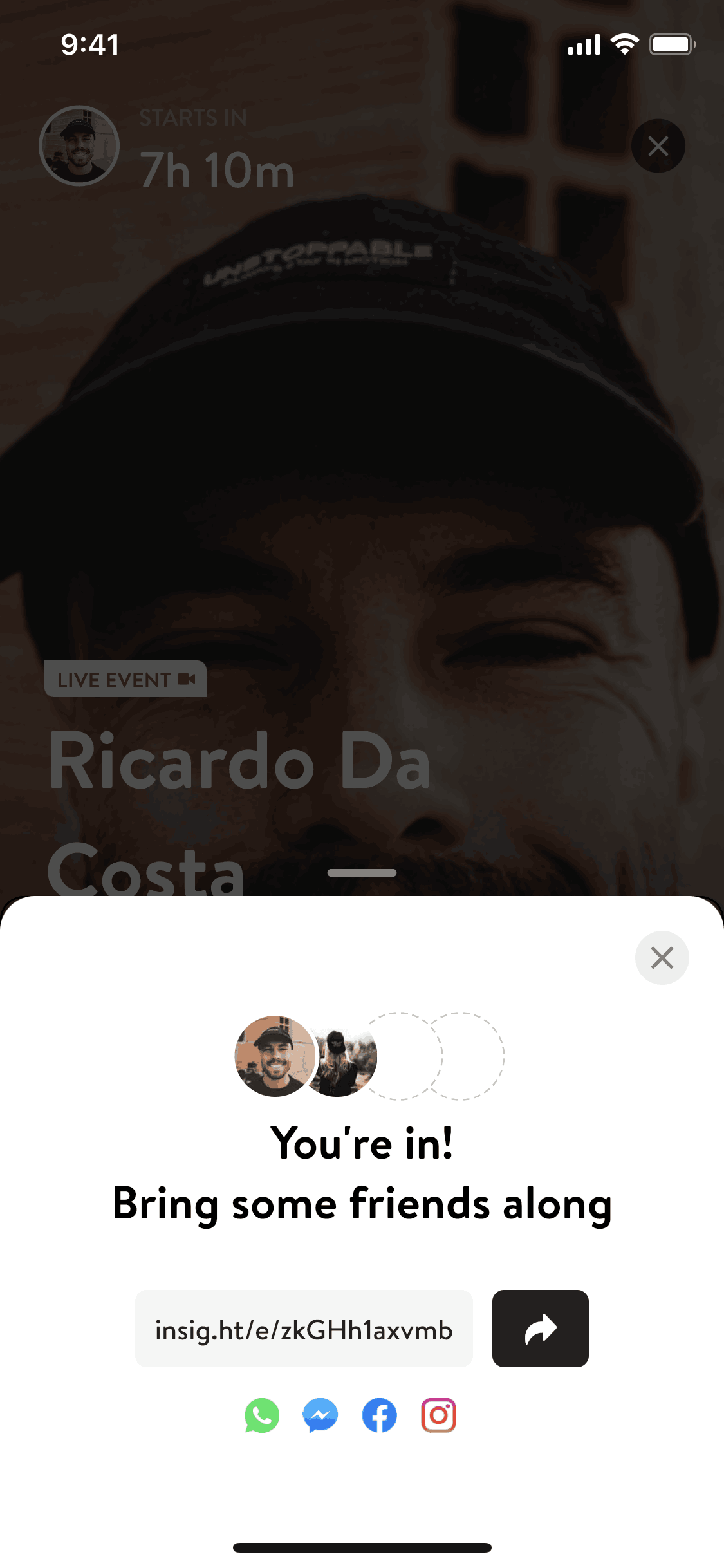 The user browses events, selects one, and confirms attendance. They are then given options to share the event.