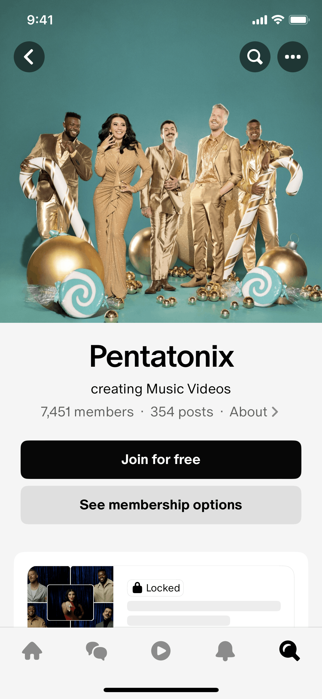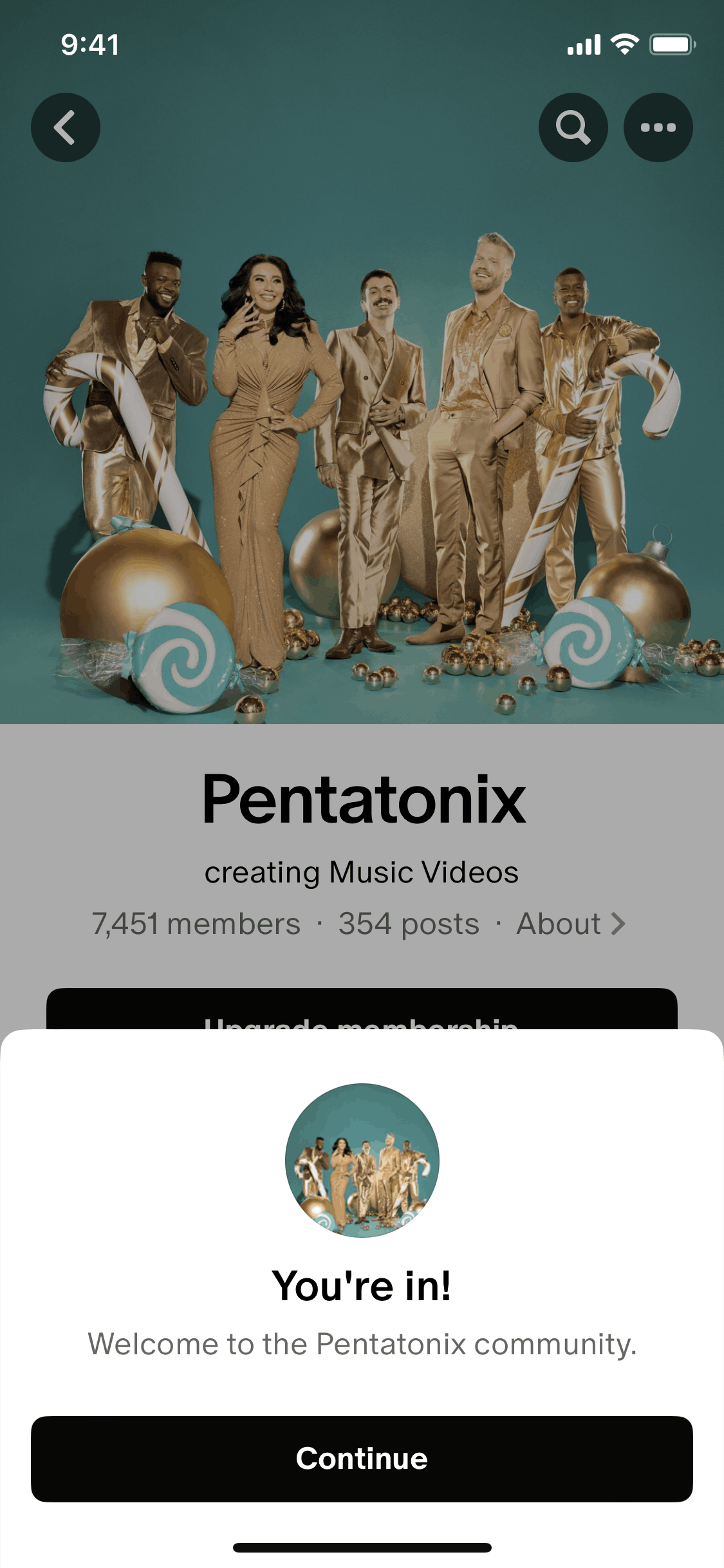 The user joins the Pentatonix community for free. They click the "Join for free" button and see a confirmation modal.