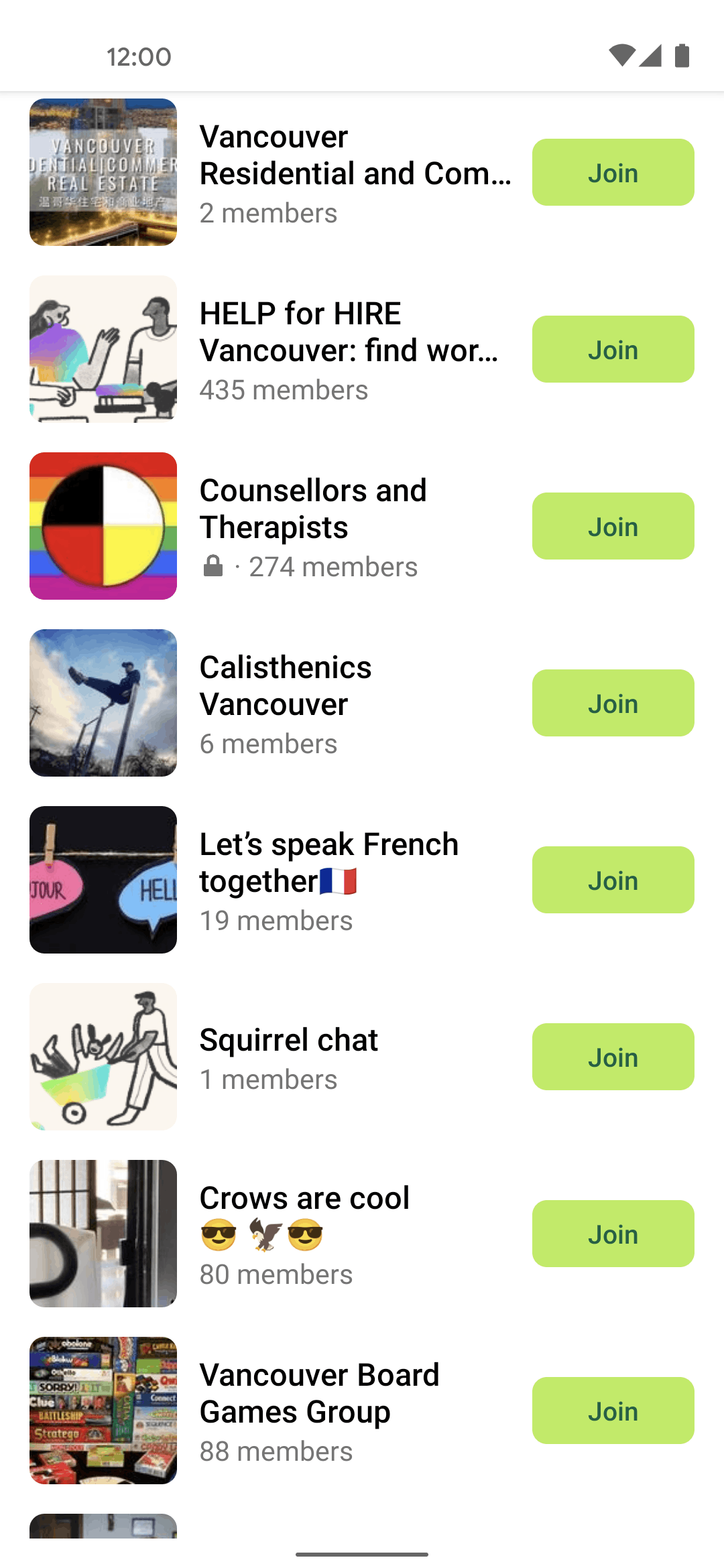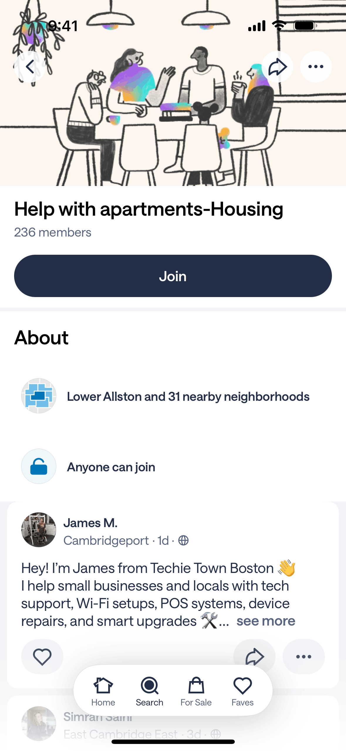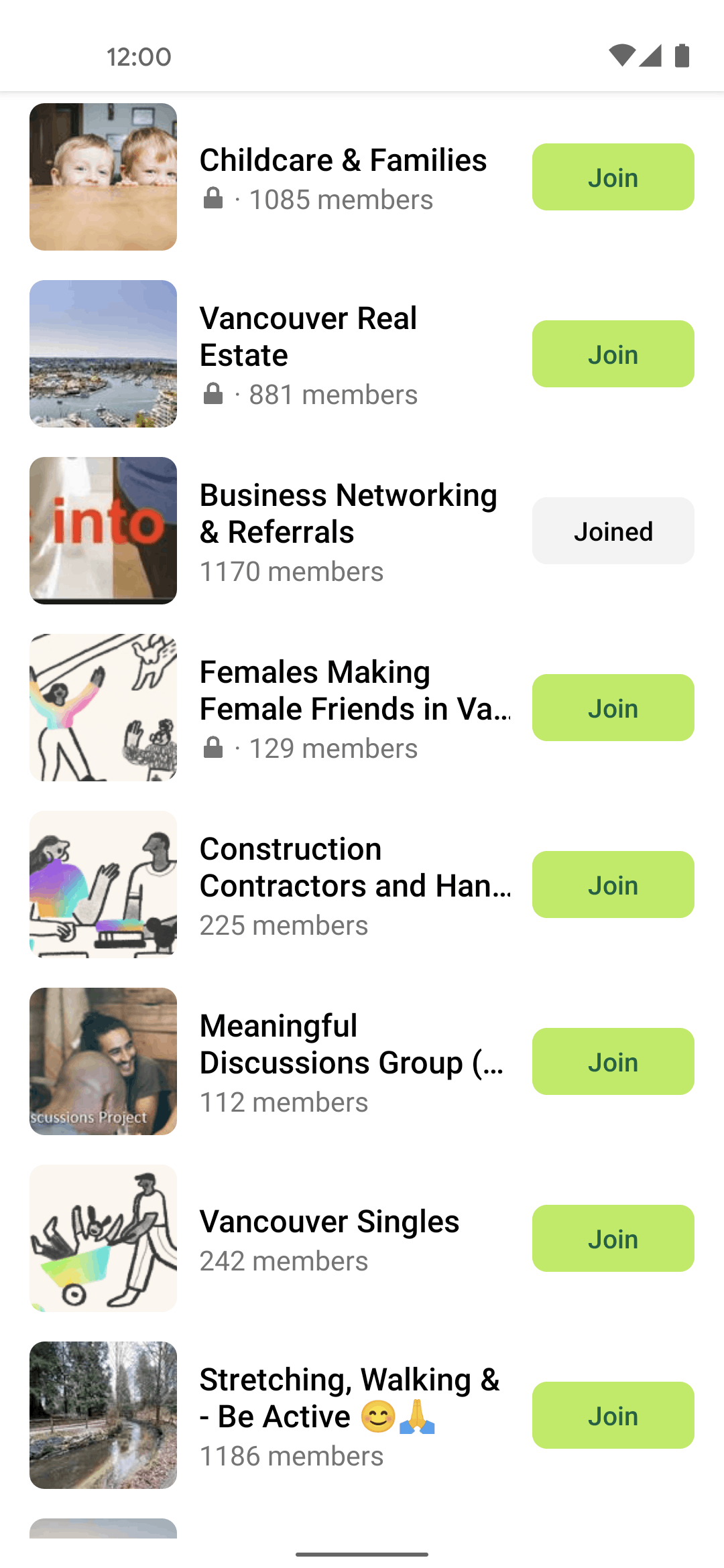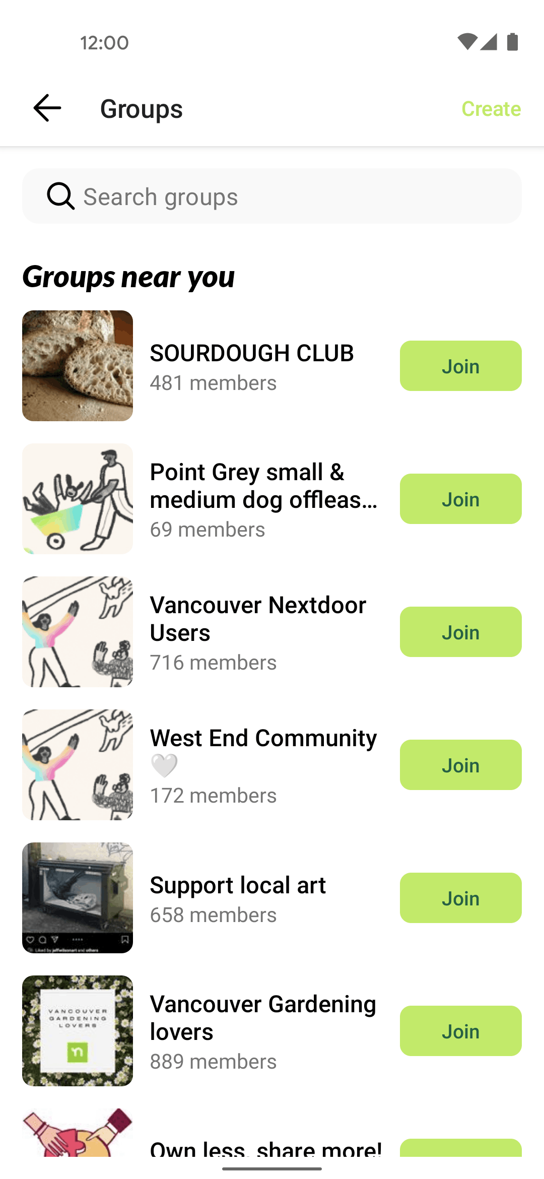 The user browses a list of local groups and joins one. The flow concludes with a confirmation of the user successfully joining the group.