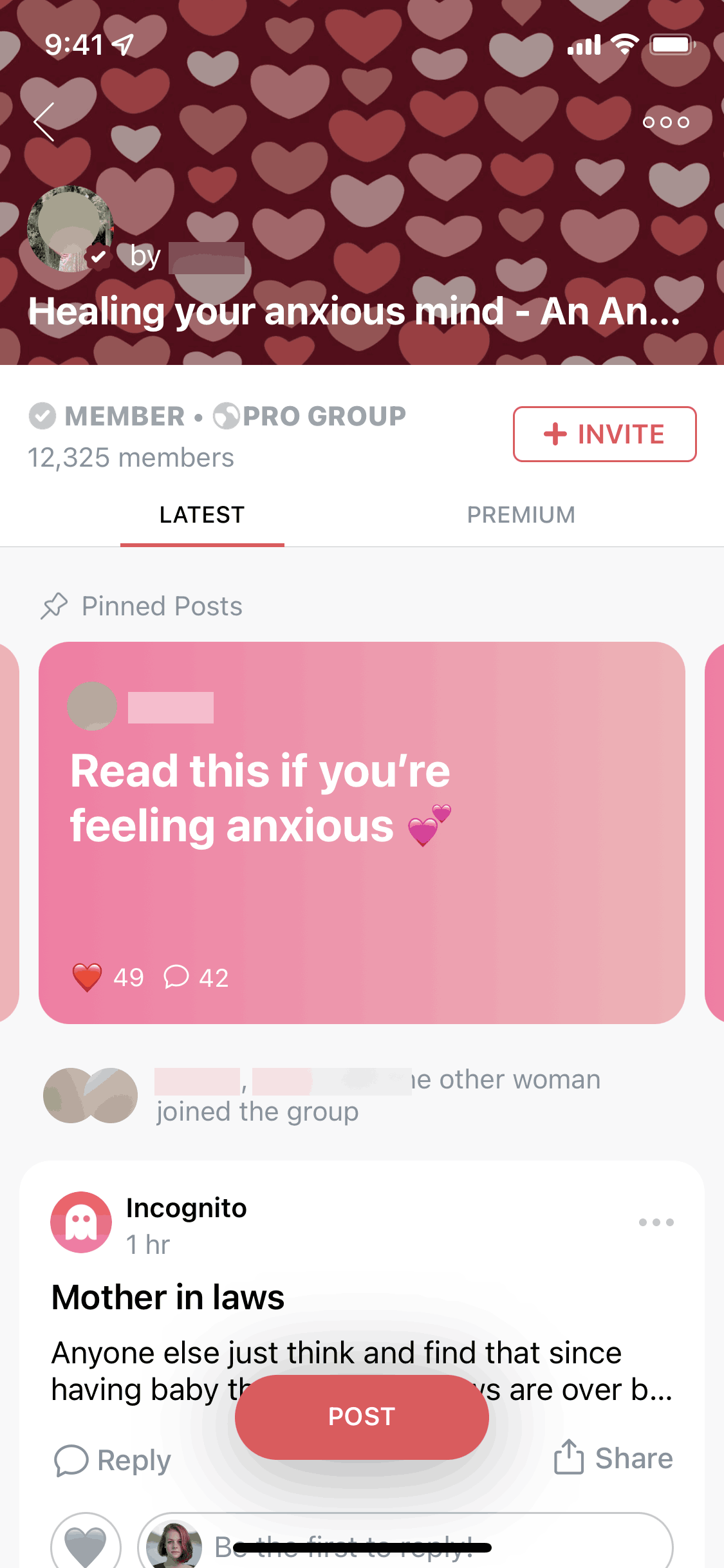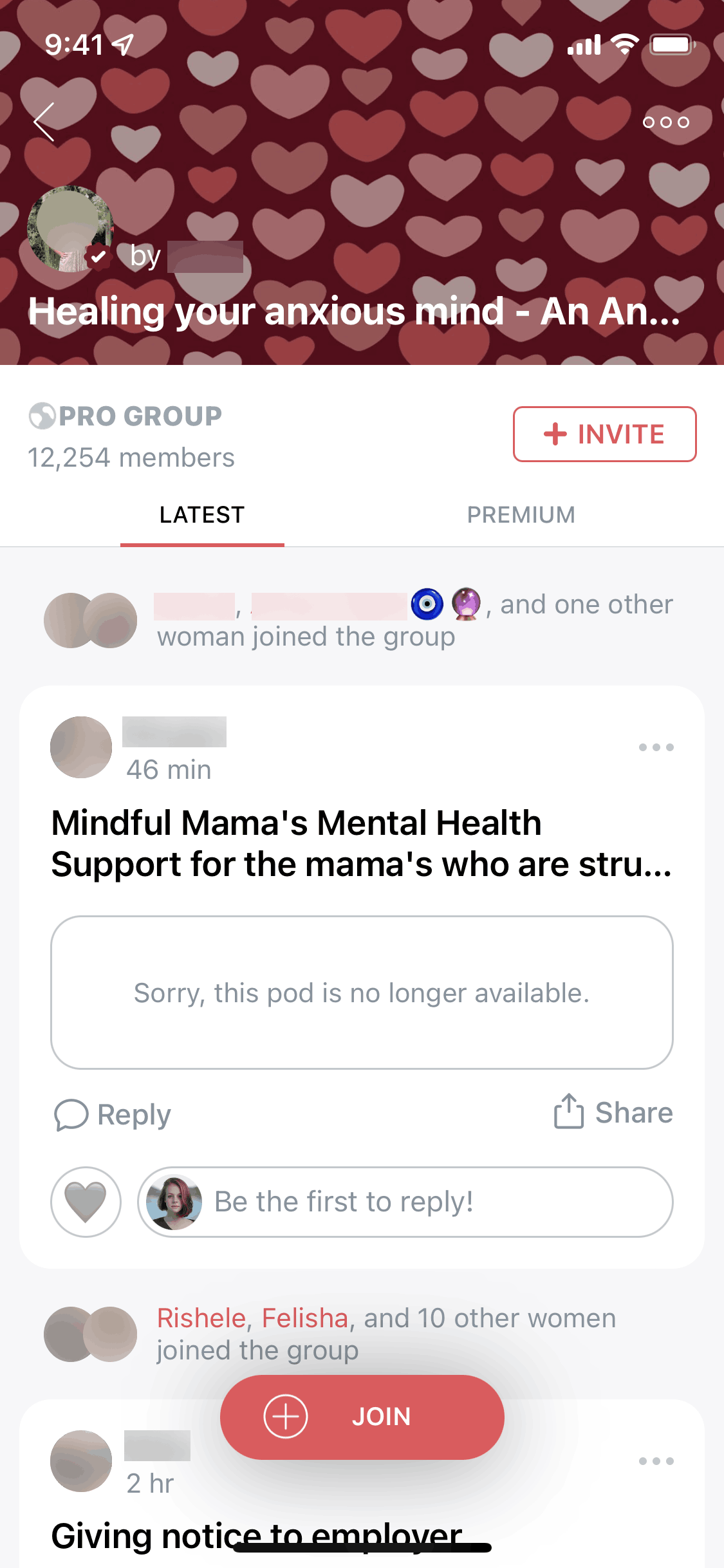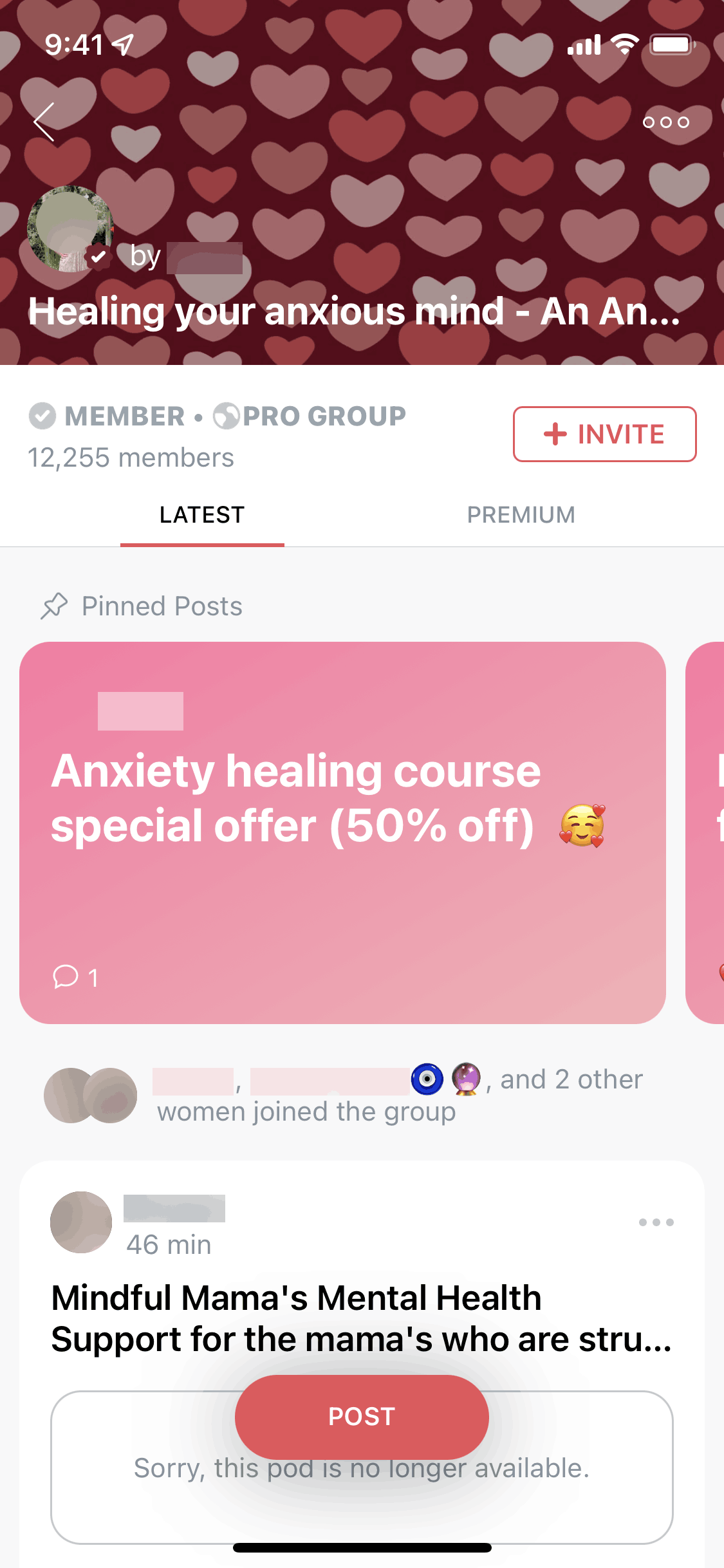 The user joins a "Pro Group", views the welcome message, and explores the group's content in the "Latest" and "Premium" tabs.