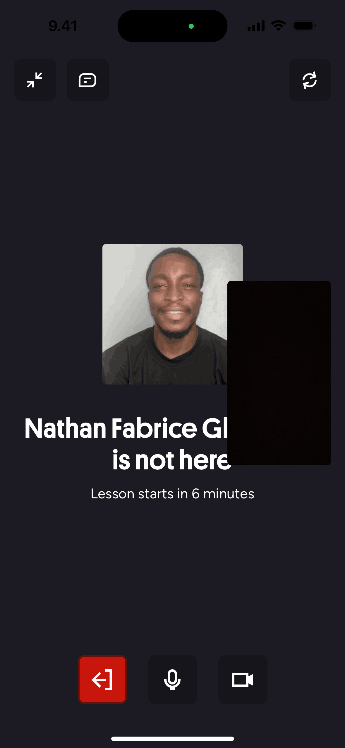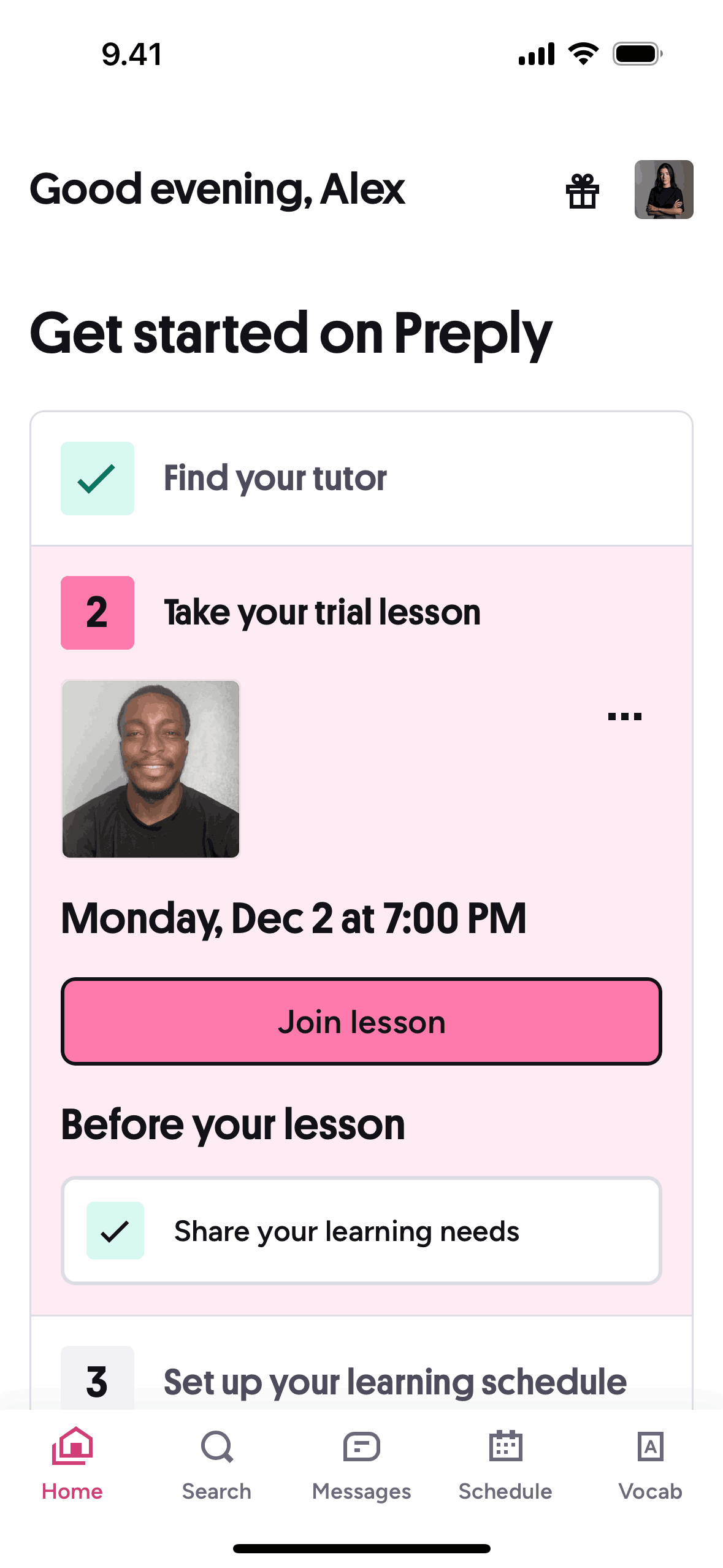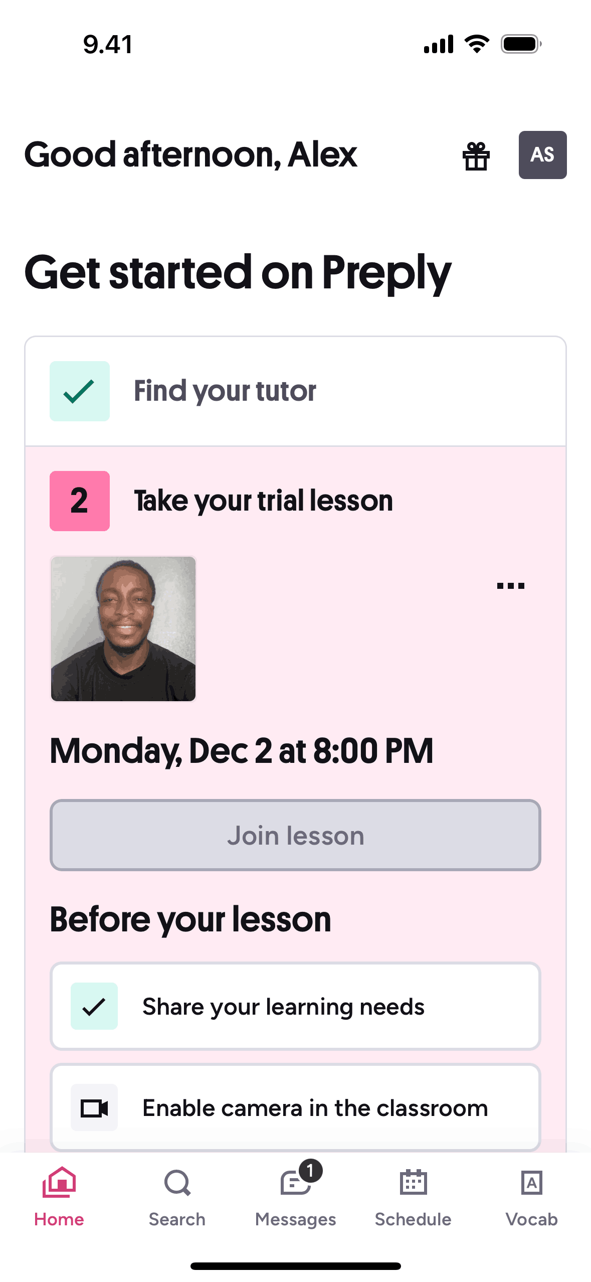 The user joins a scheduled lesson from the homepage. They are taken to a video call interface where they can interact with the tutor.