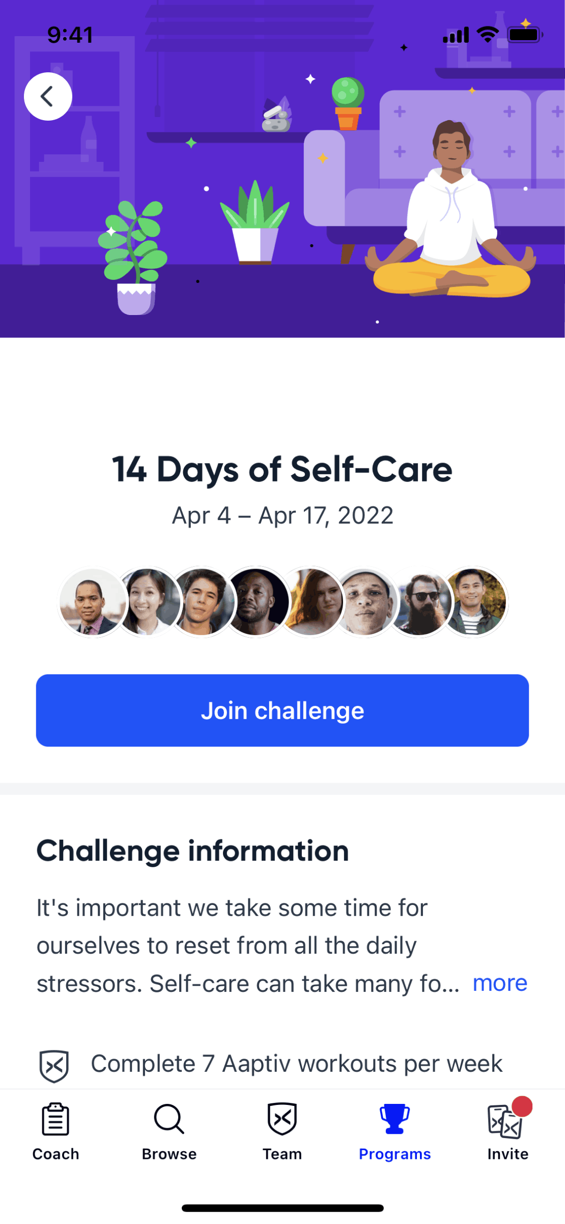 The user flow shows the process of joining a challenge. The user views the challenge details and then joins, which updates the UI.