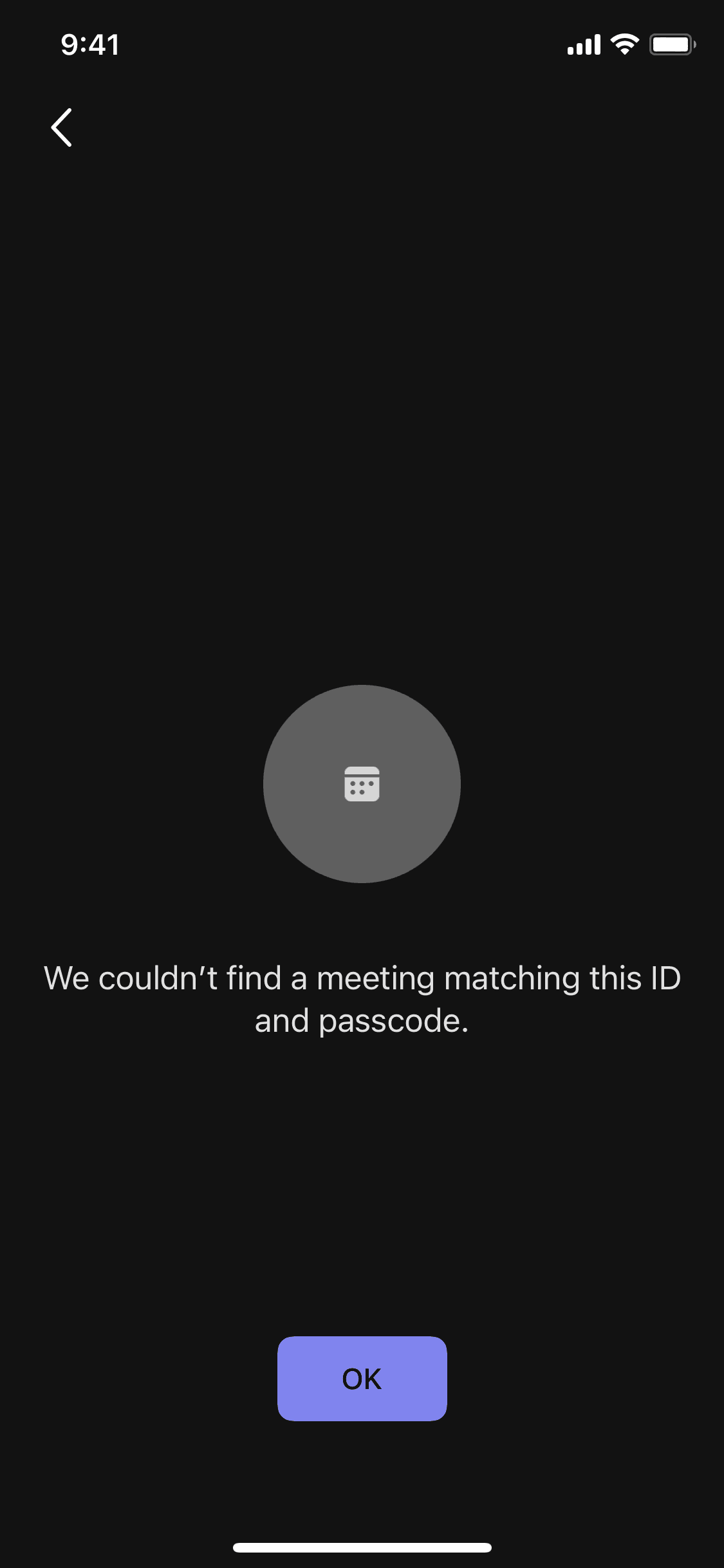 The user attempts to join a meeting using a meeting ID and passcode, but the connection fails. An error message is displayed.