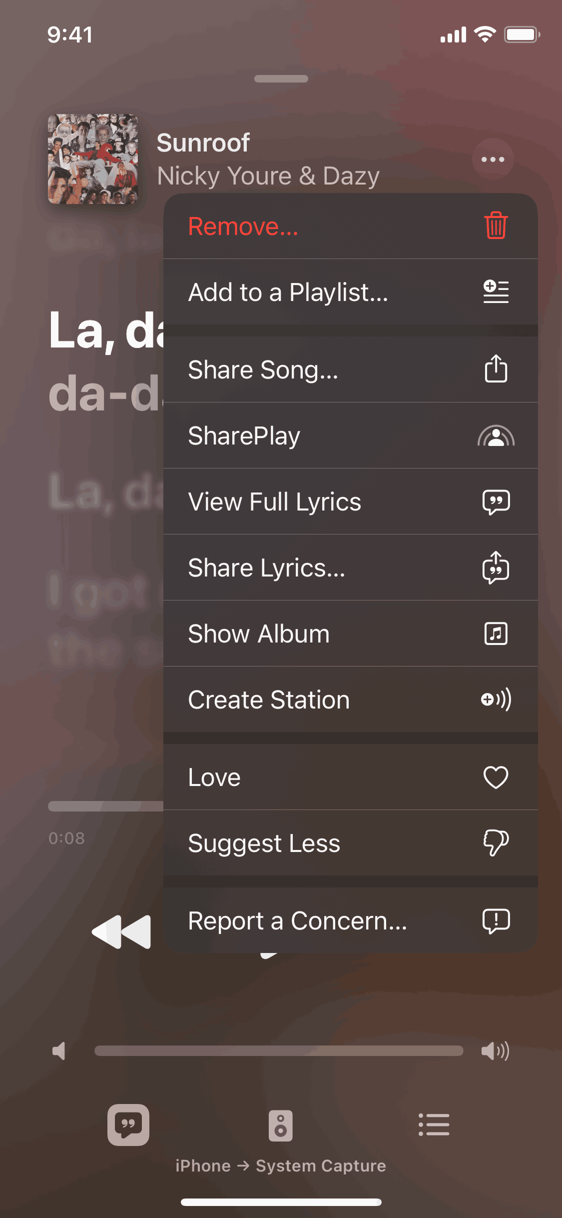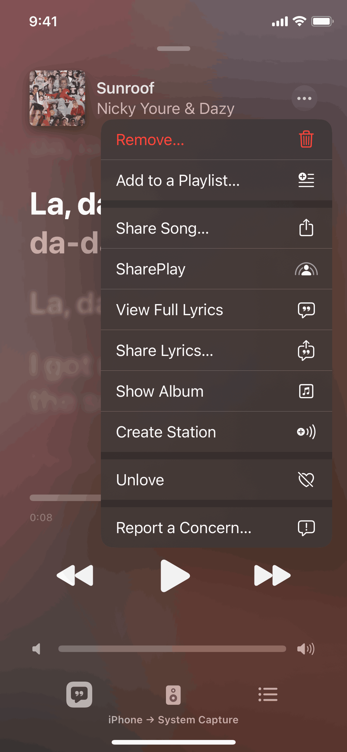 The user likes a song via the context menu. The music player interface confirms the action, and the context menu updates to allow unliking.