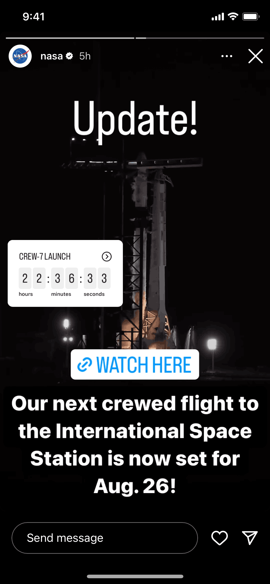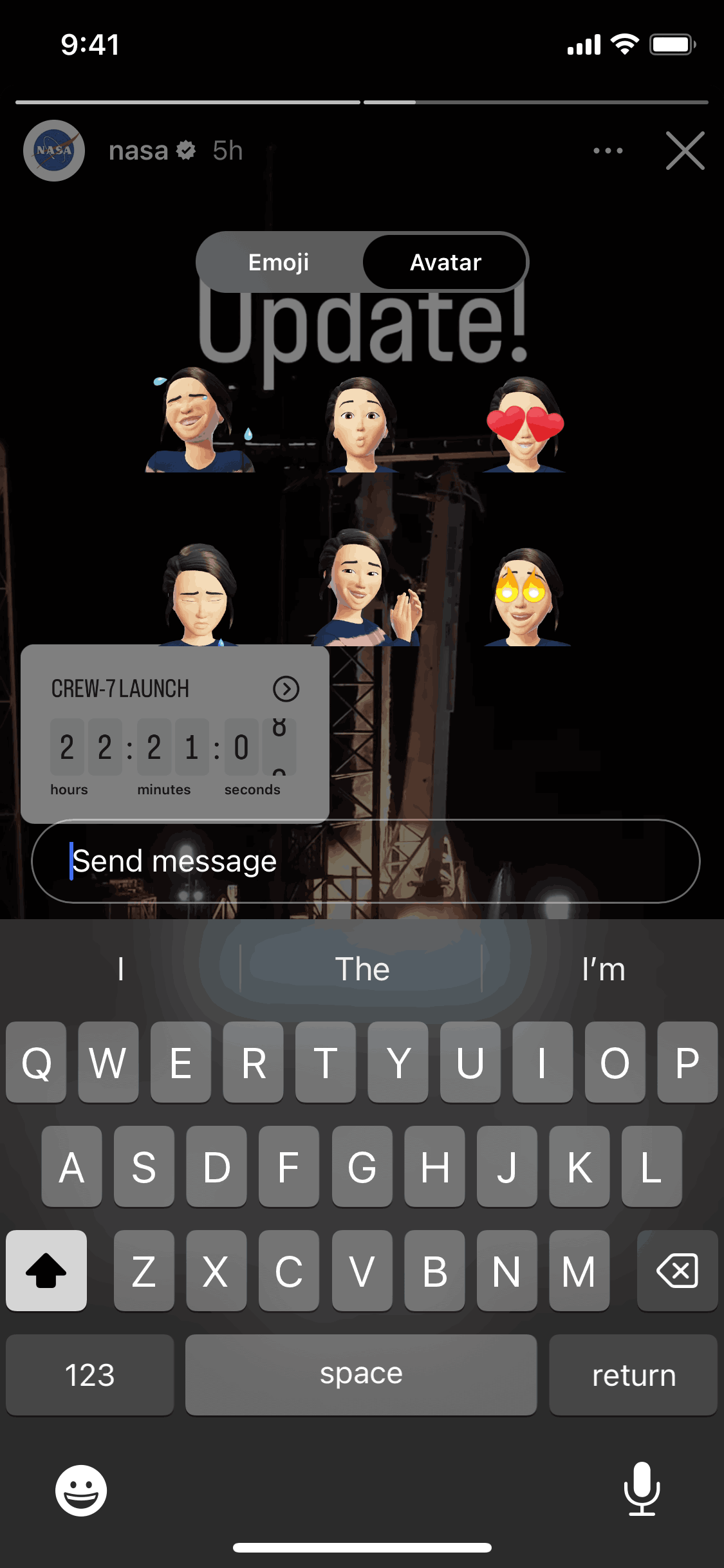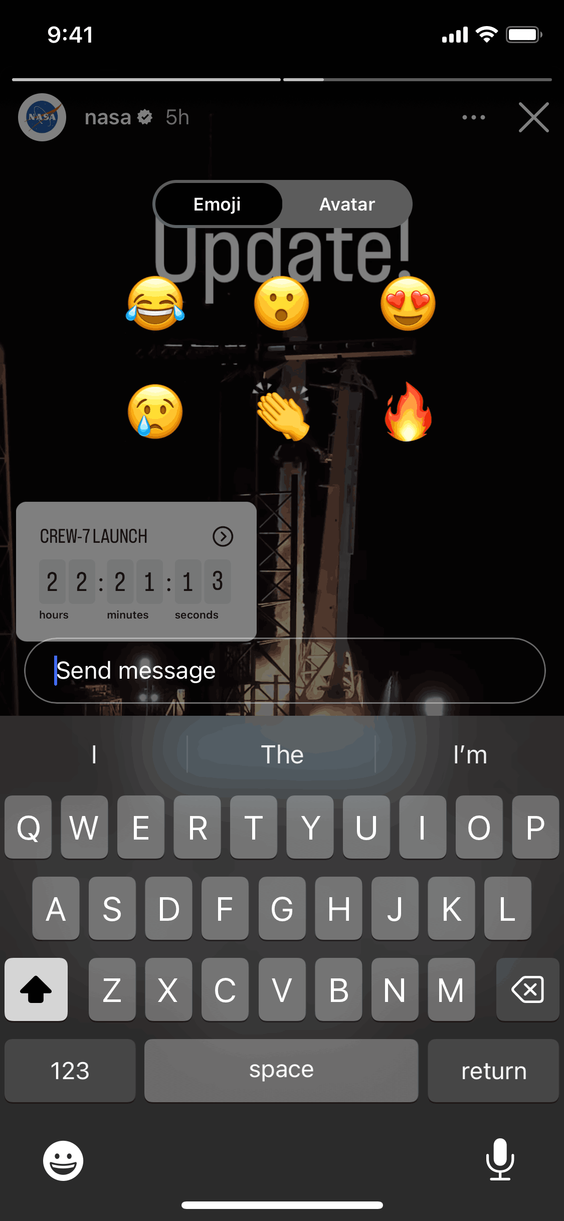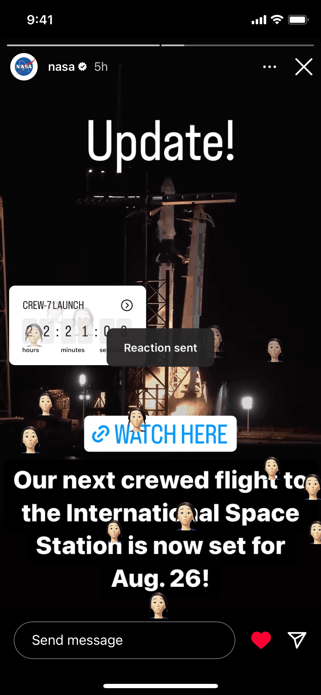 The user views a story and reacts to it with a personalized avatar. A confirmation message appears after the reaction is sent.