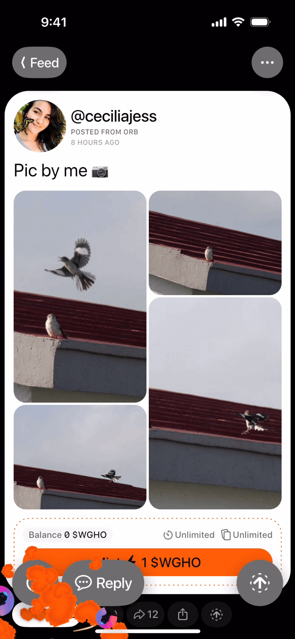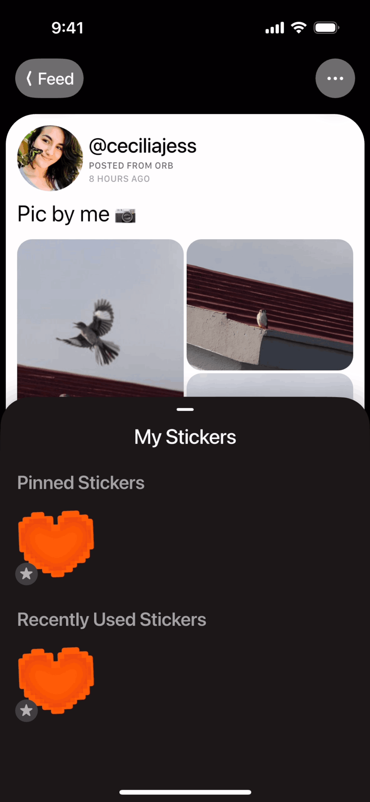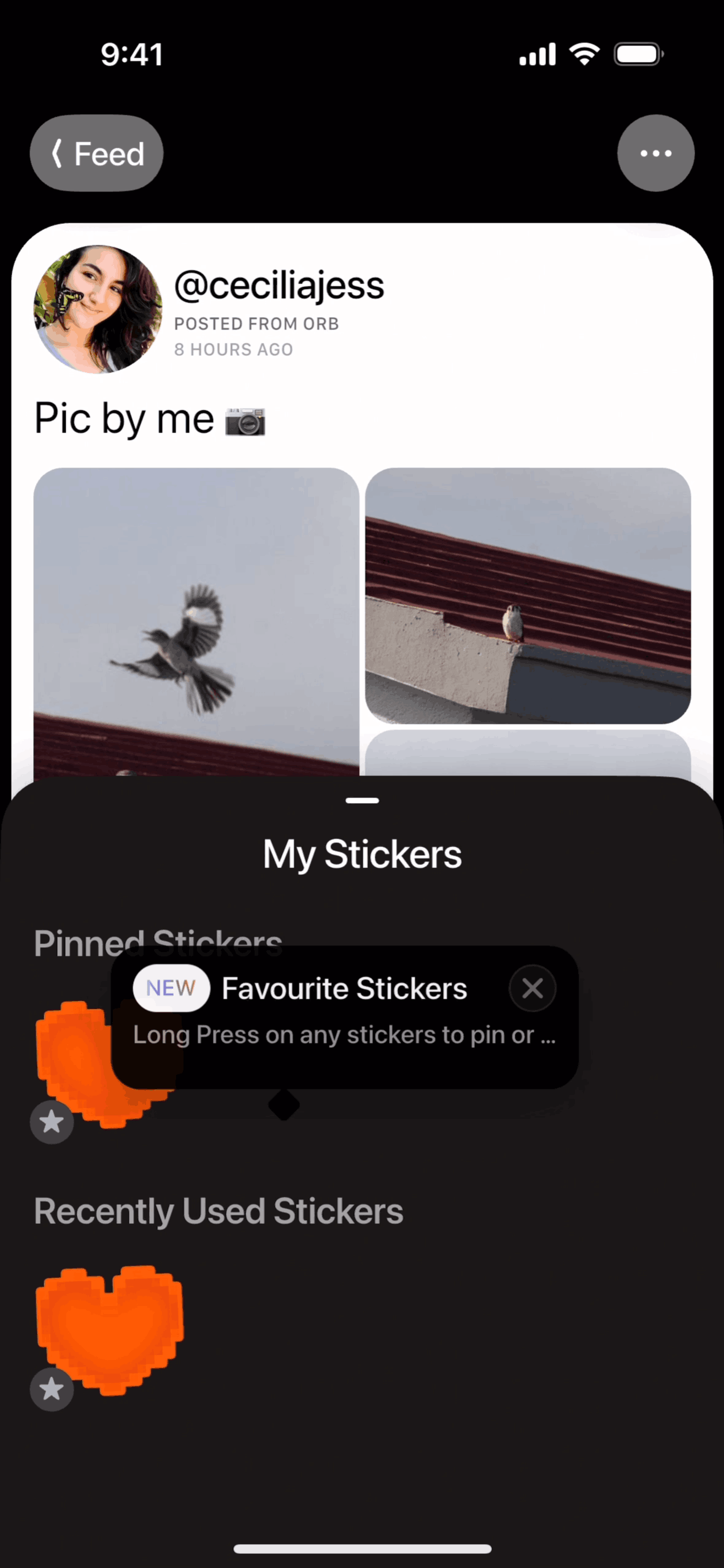 The user interacts with a social media post by adding a sticker to the like button, resulting in an updated like count.