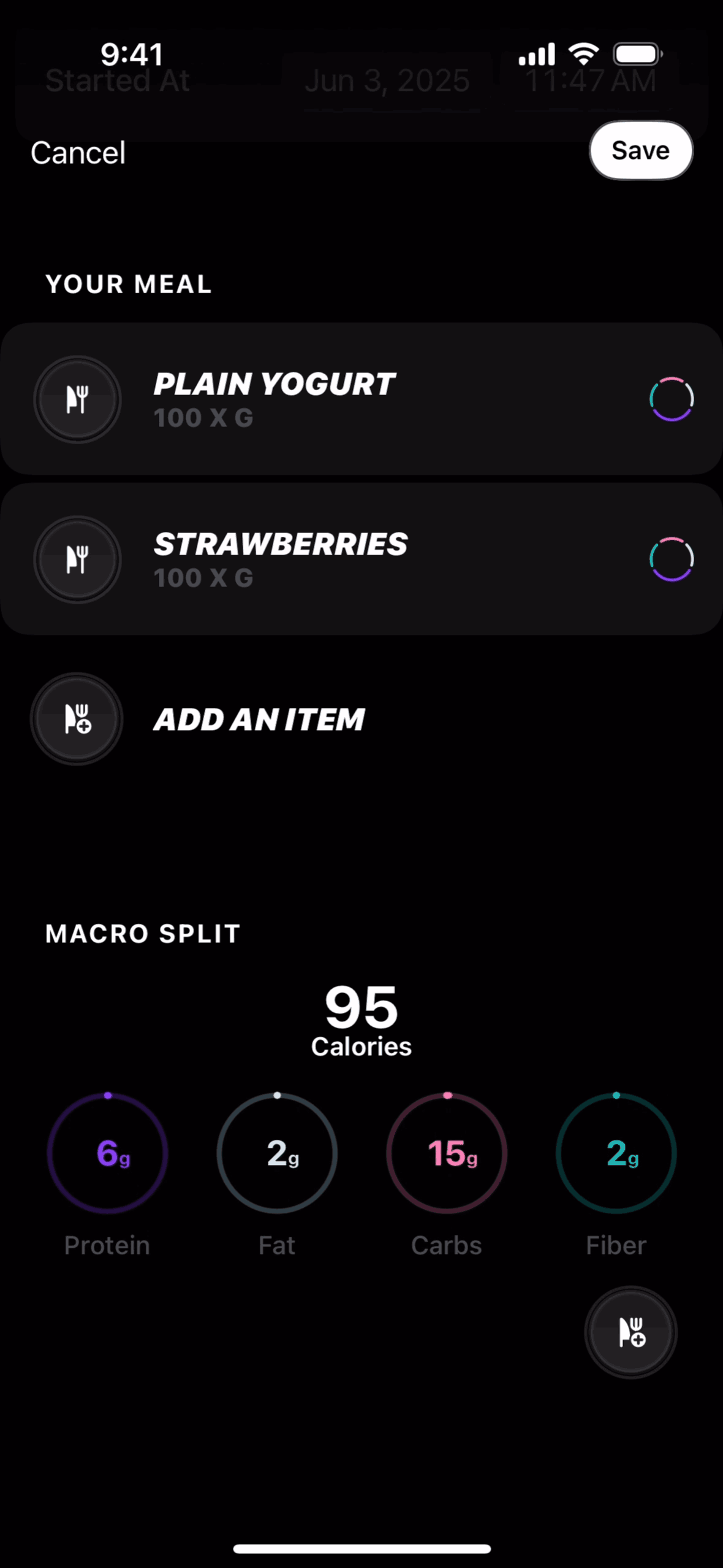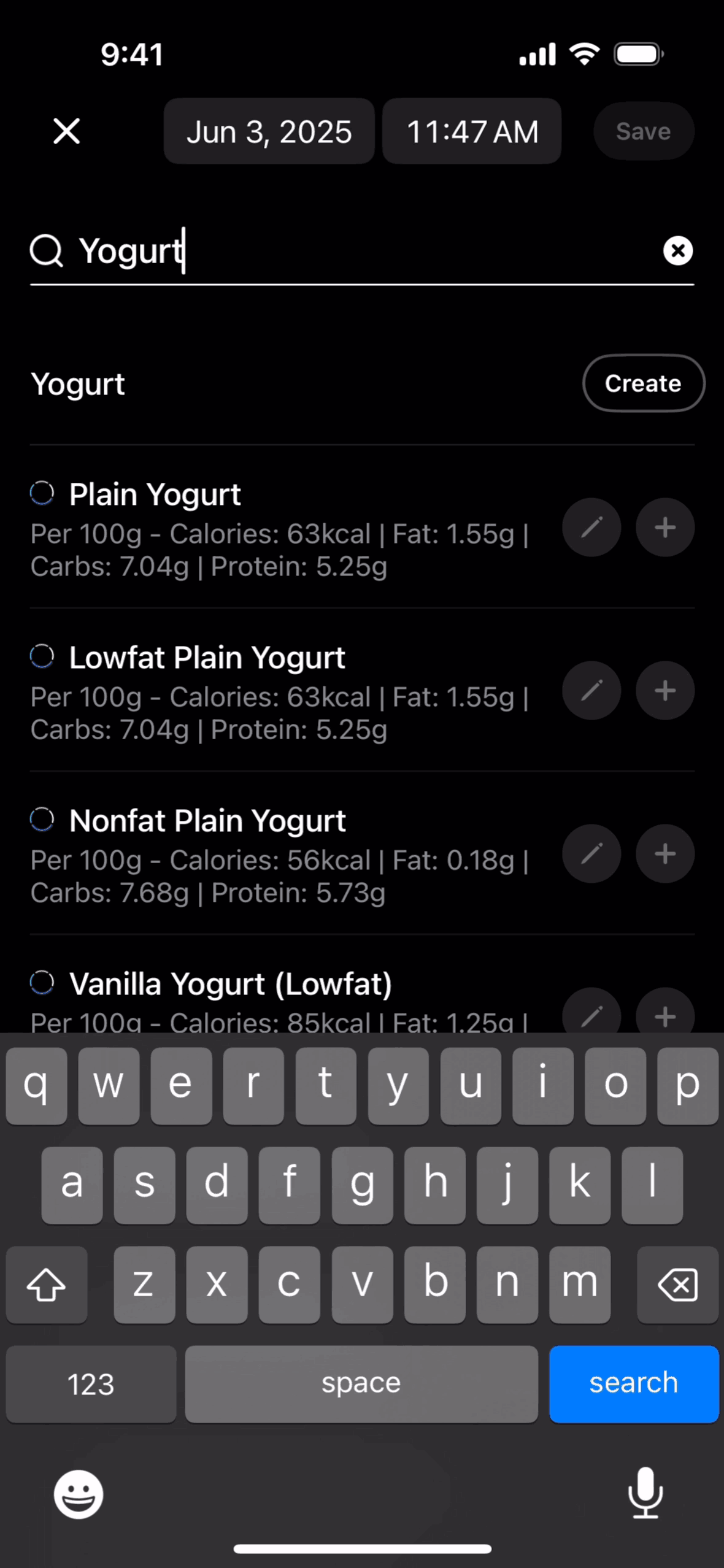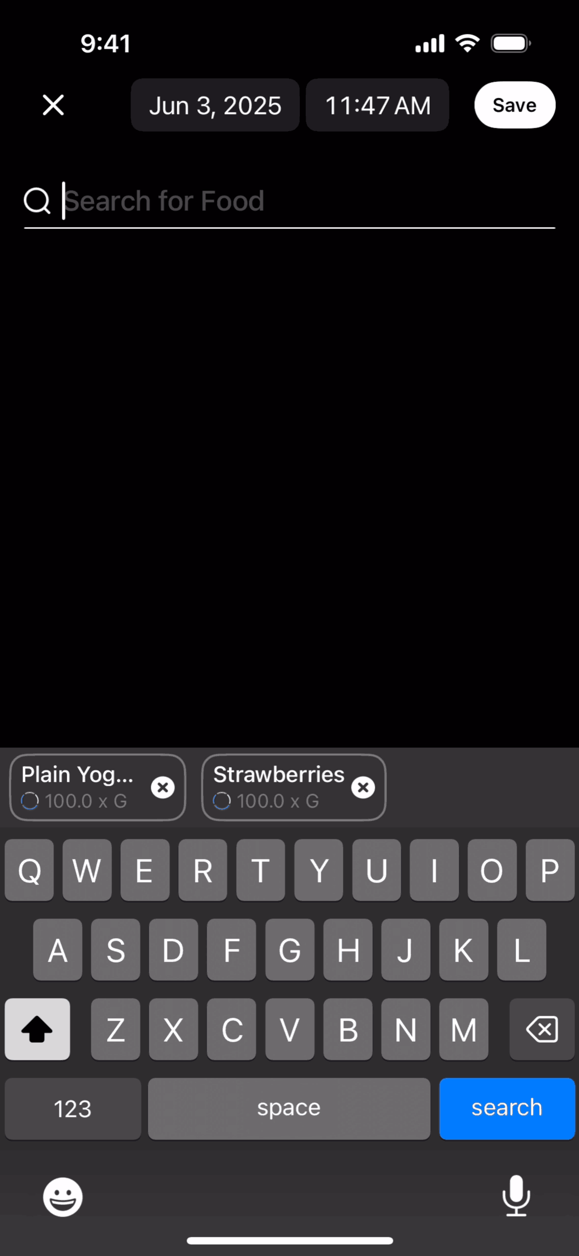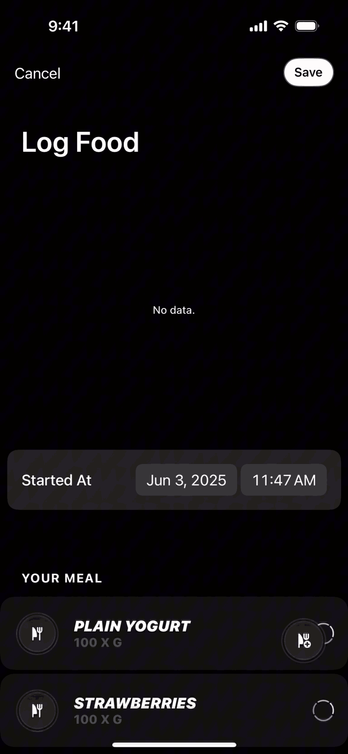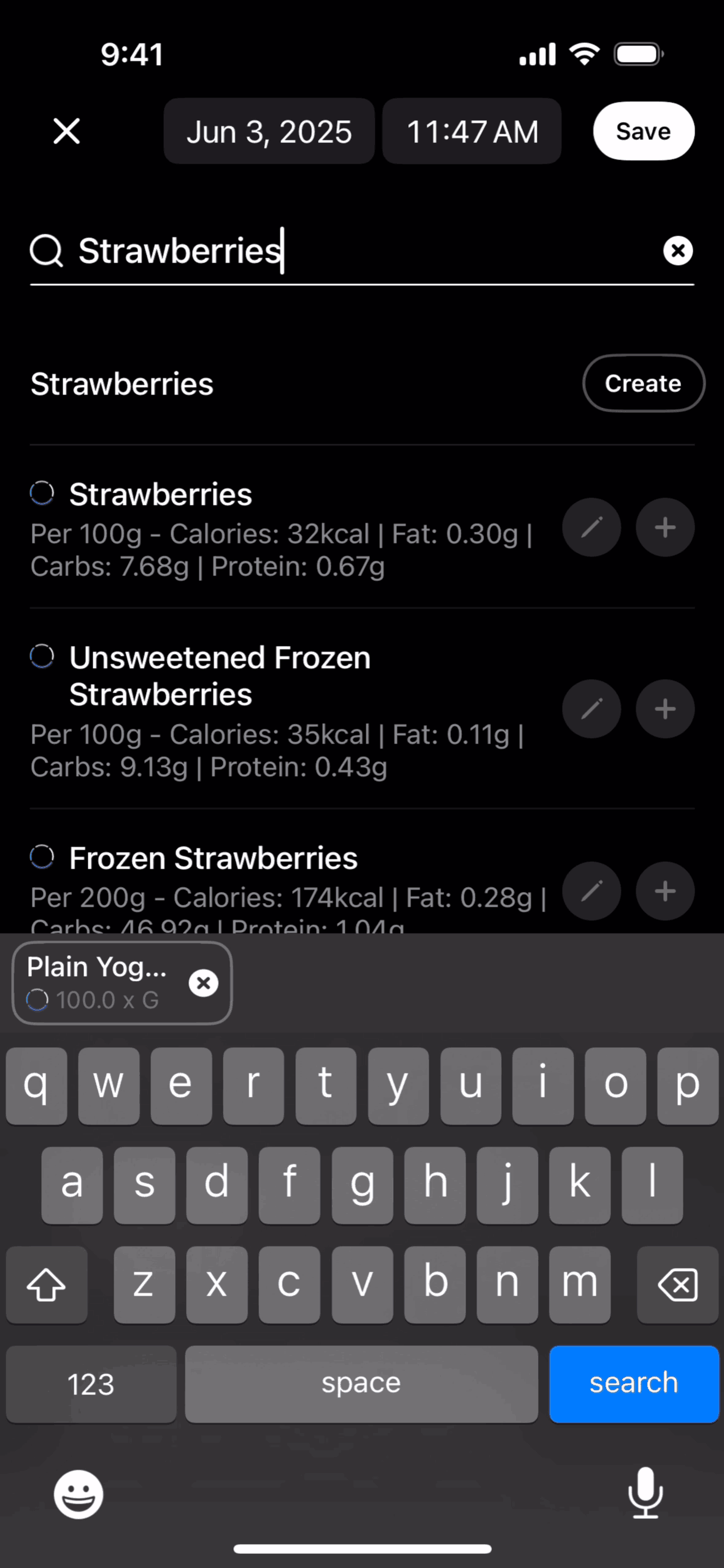 The user logs a meal by searching for food items and saving them to their timeline. The flow showcases adding "Plain Yogurt" and "Strawberries".