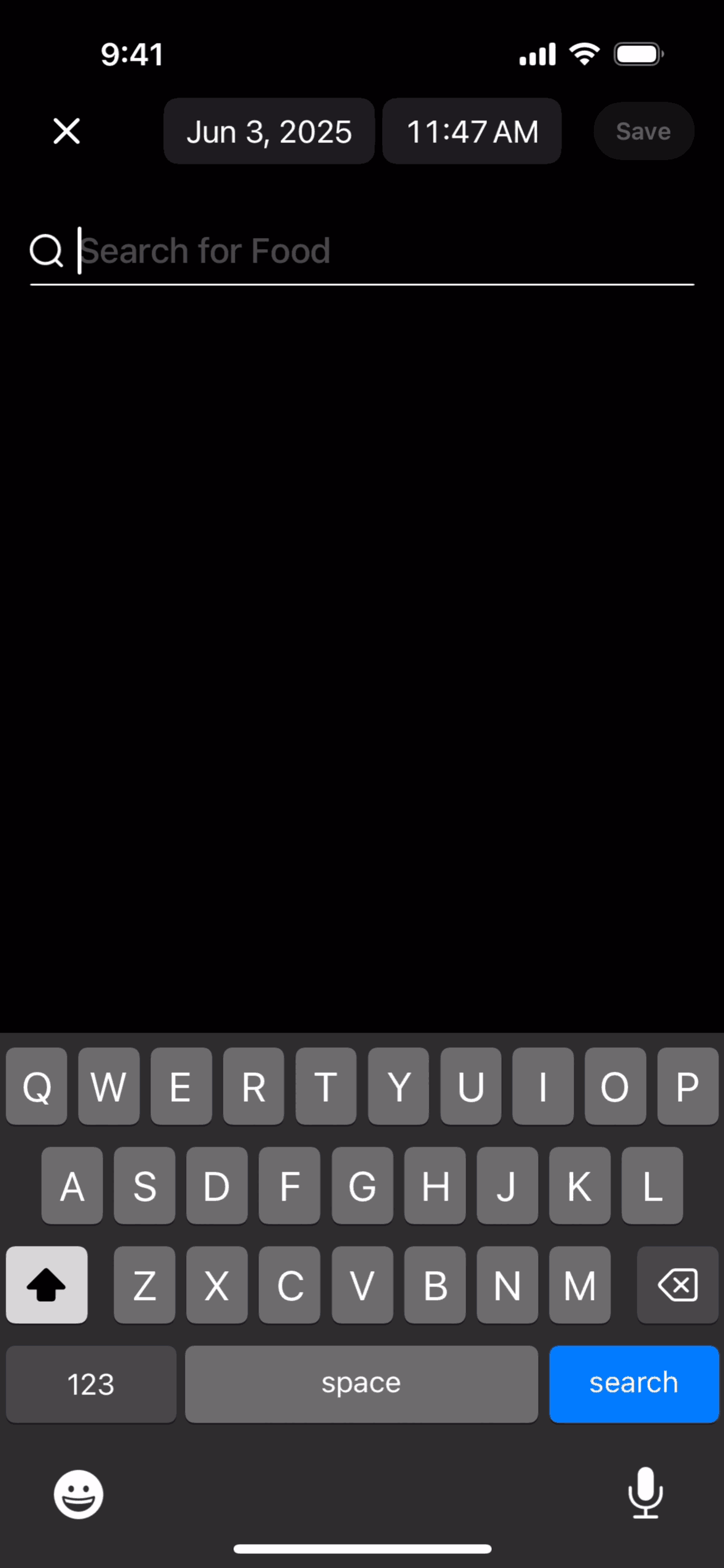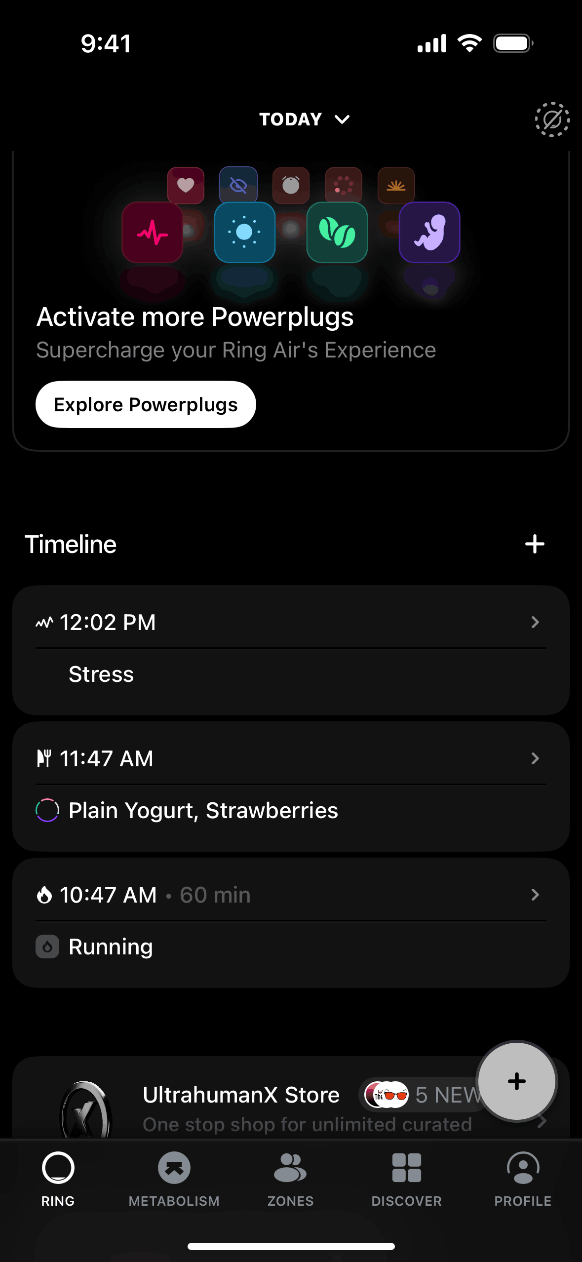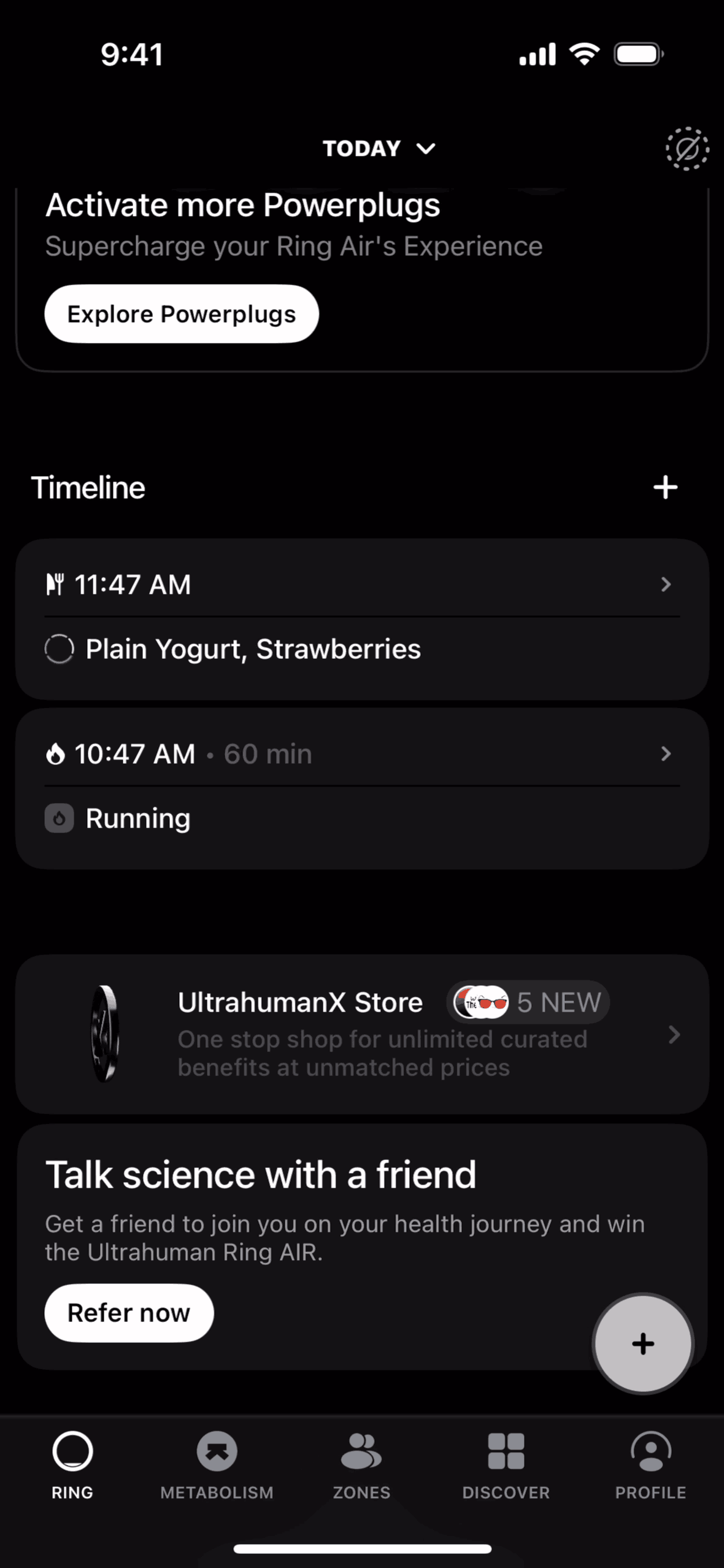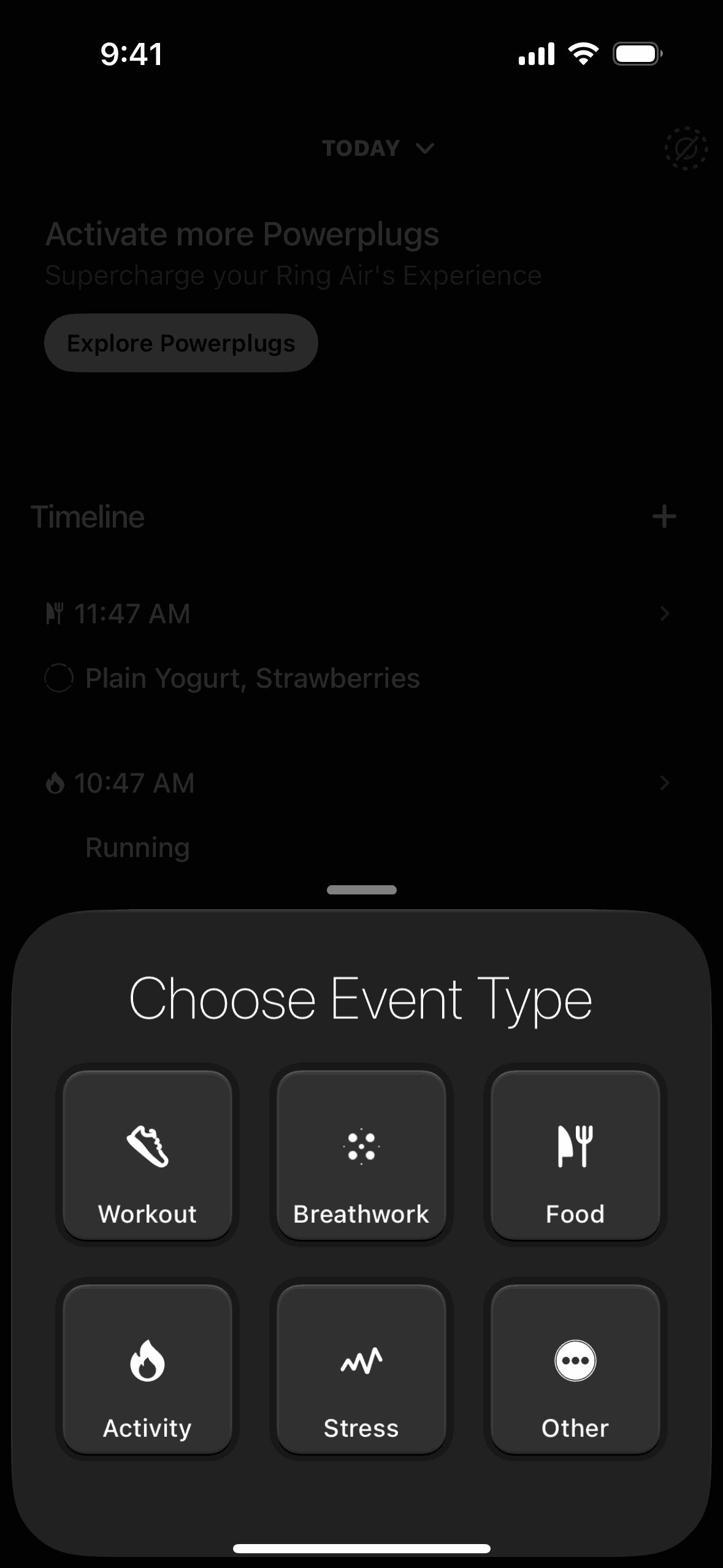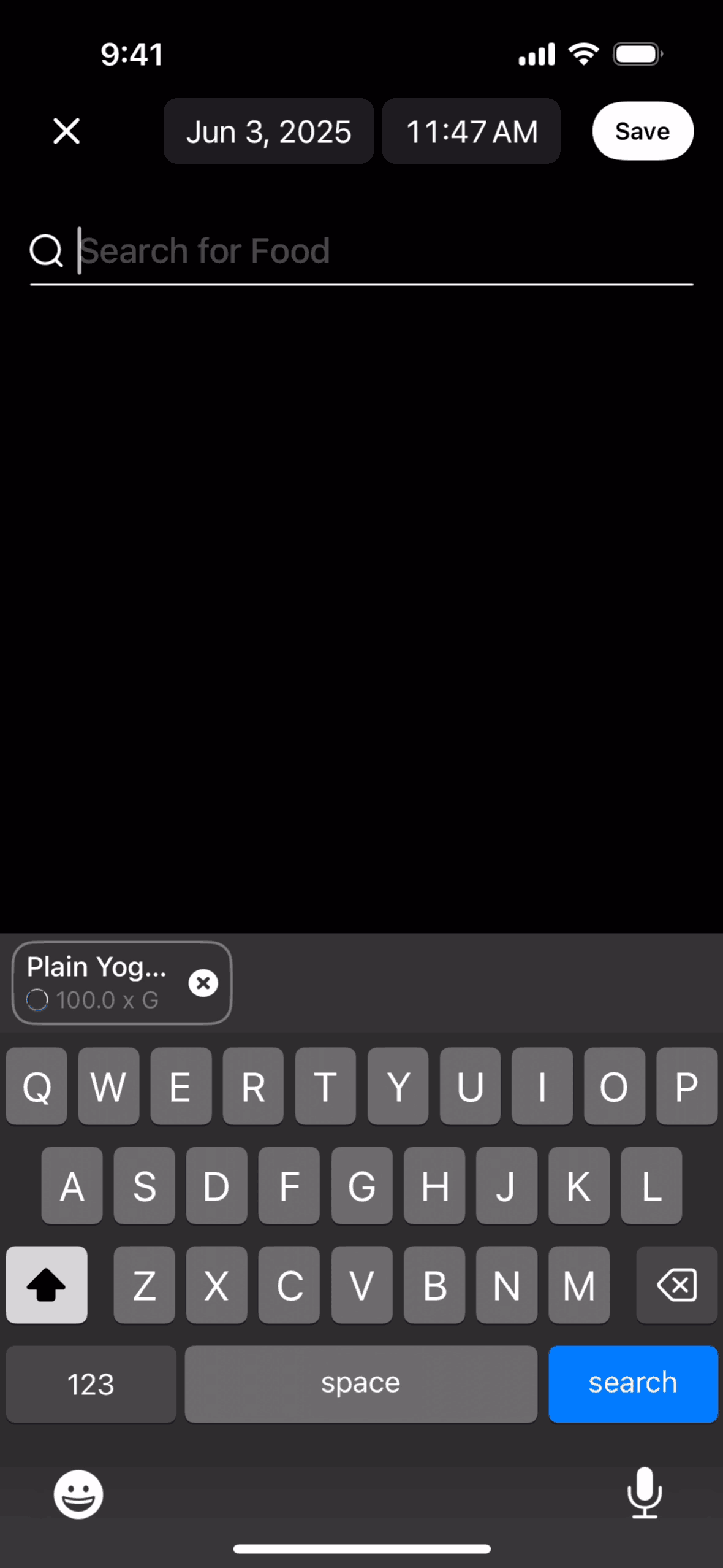 The user logs a meal by searching for food items and saving them to their timeline. The flow showcases adding "Plain Yogurt" and "Strawberries".