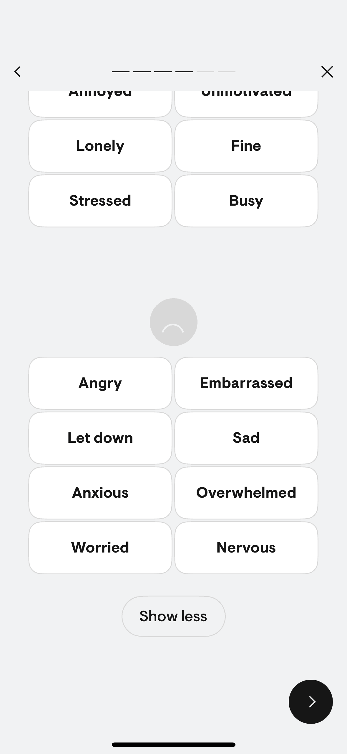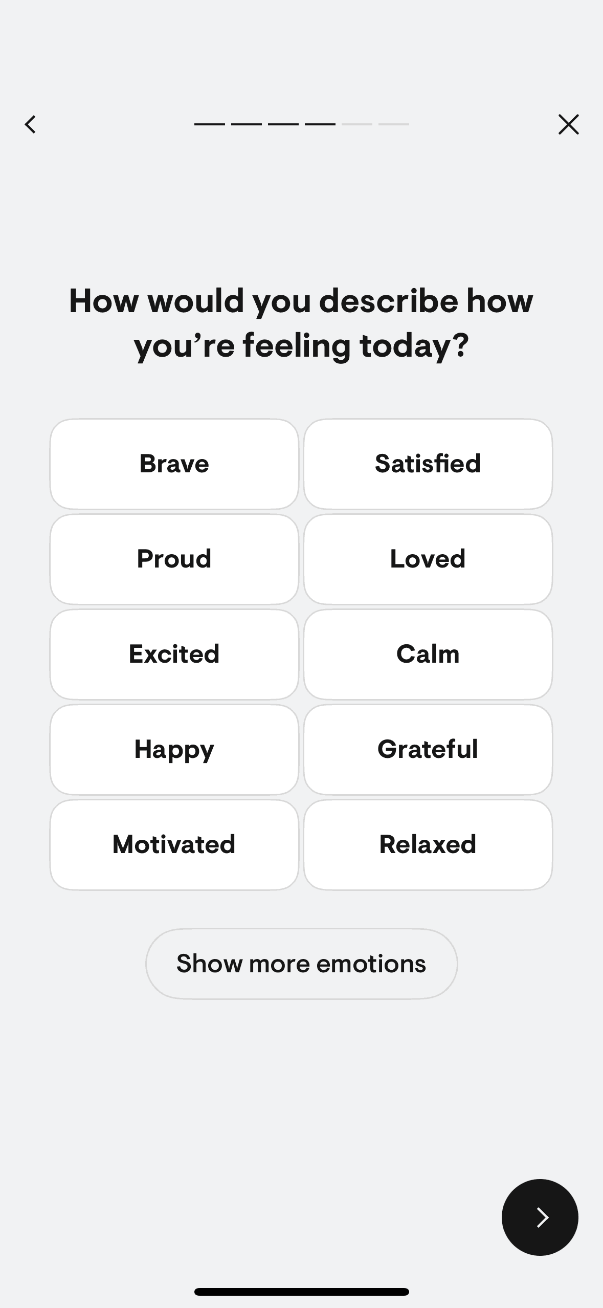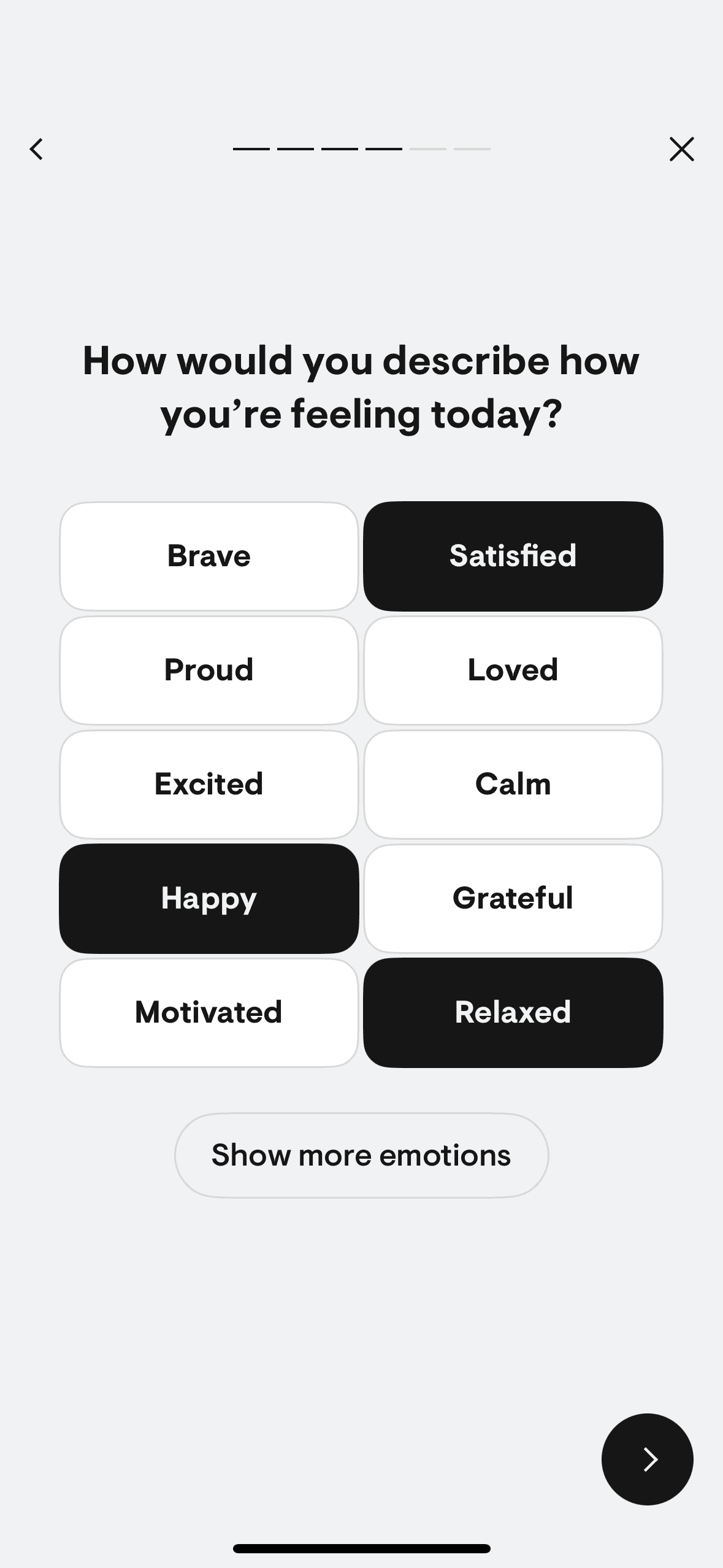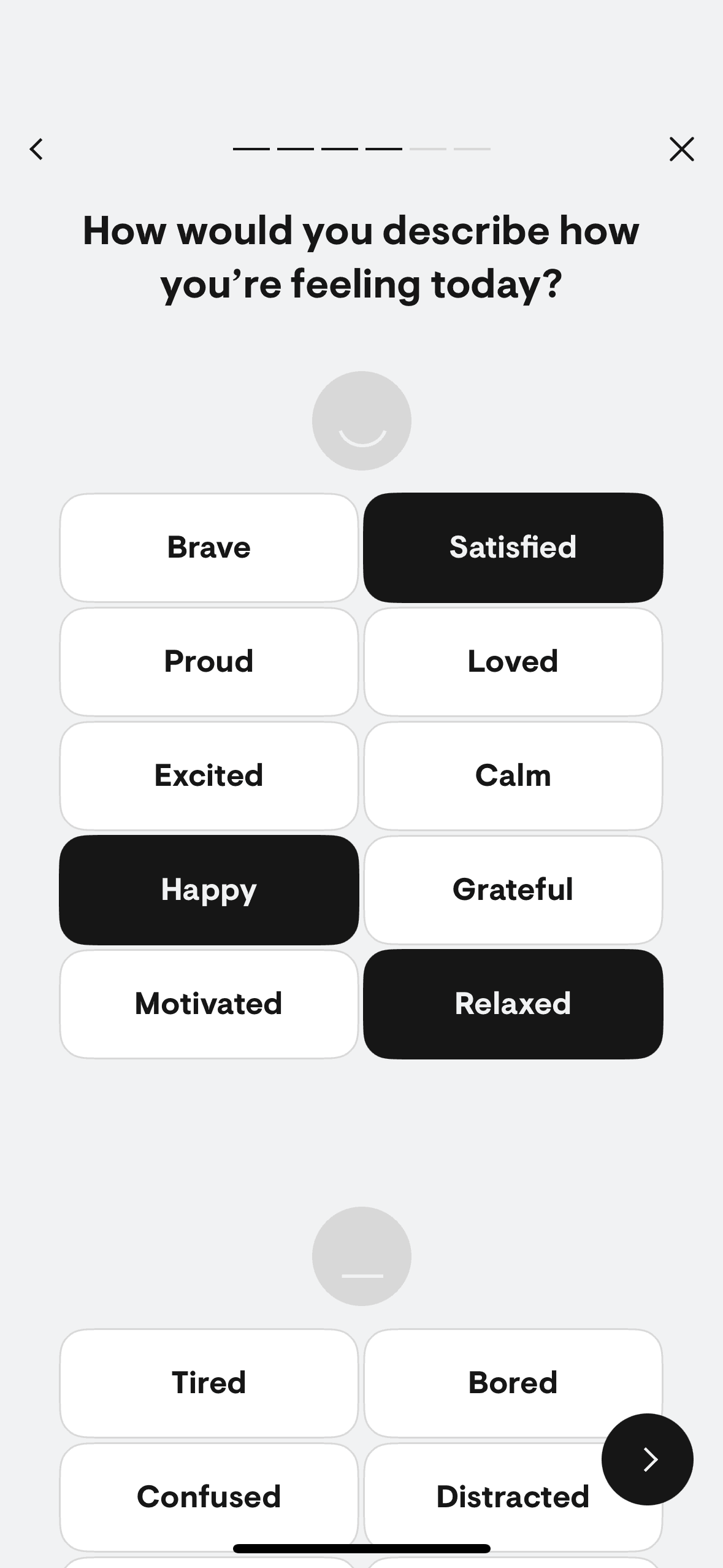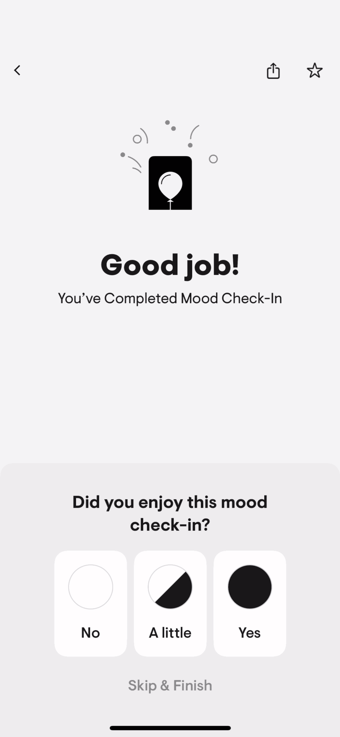 The user logs a mood check-in by selecting their mood, providing context, and setting goals. The flow concludes with a completion screen.