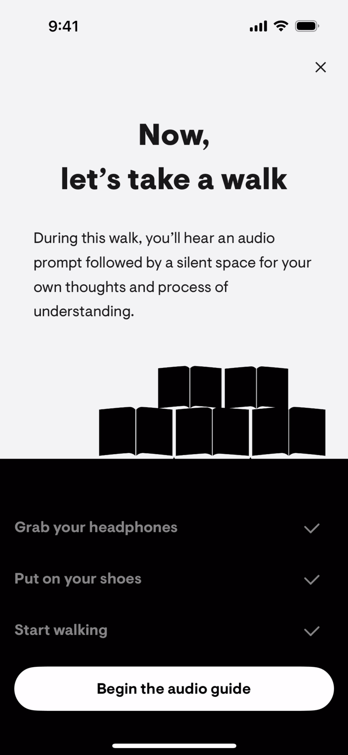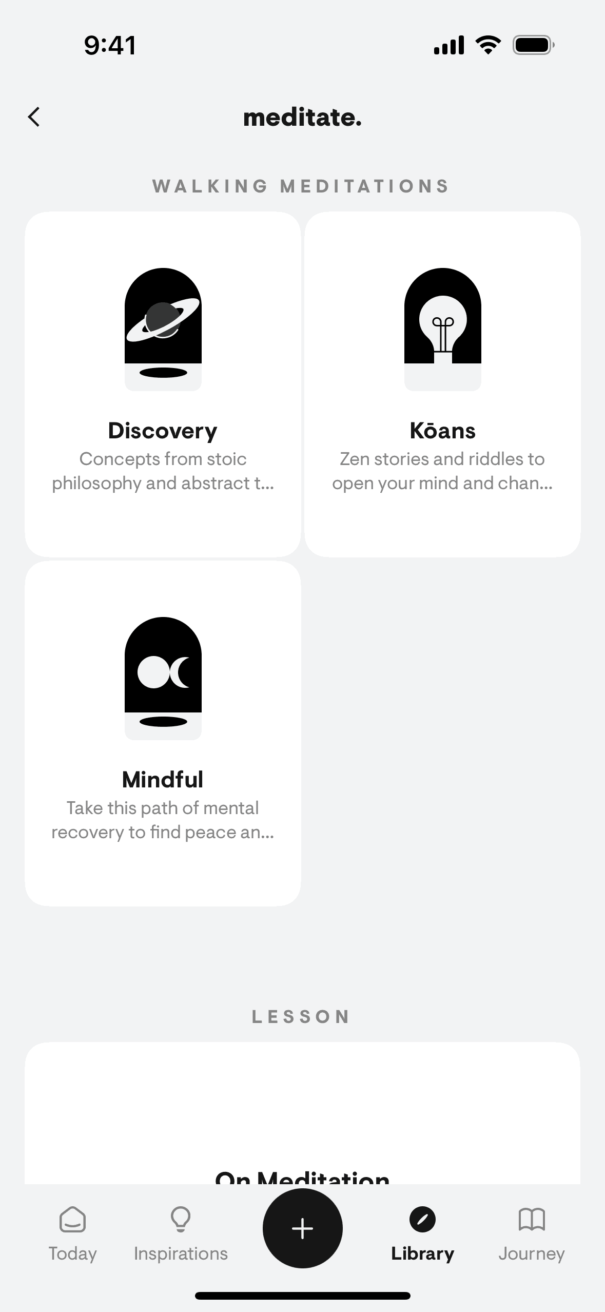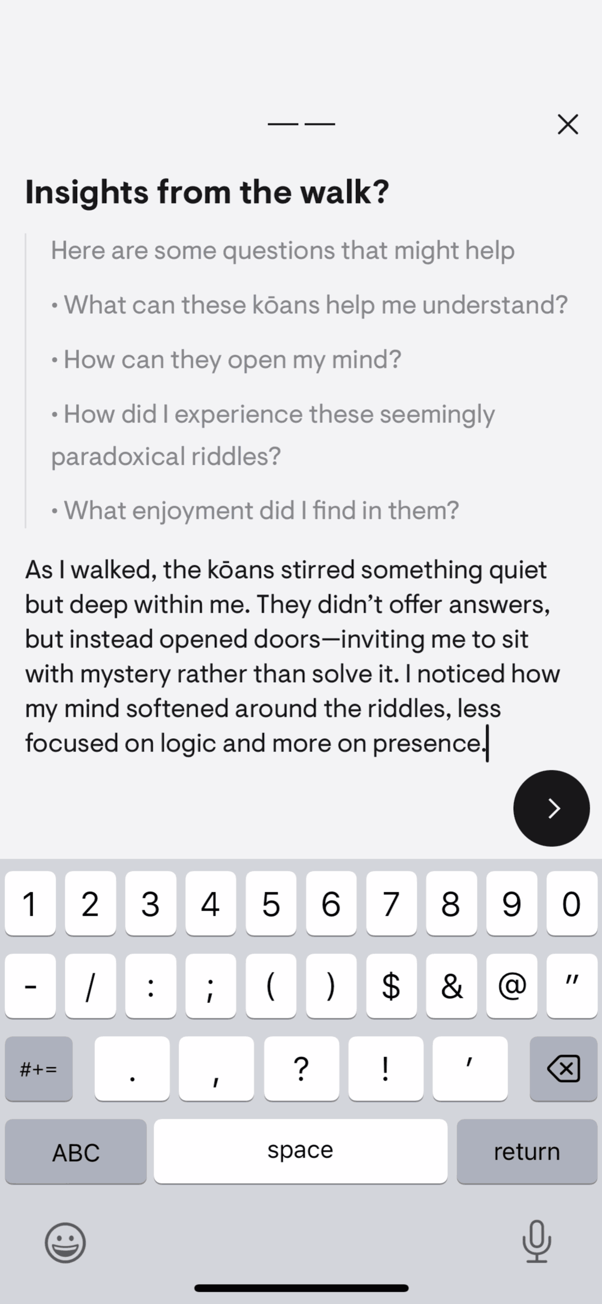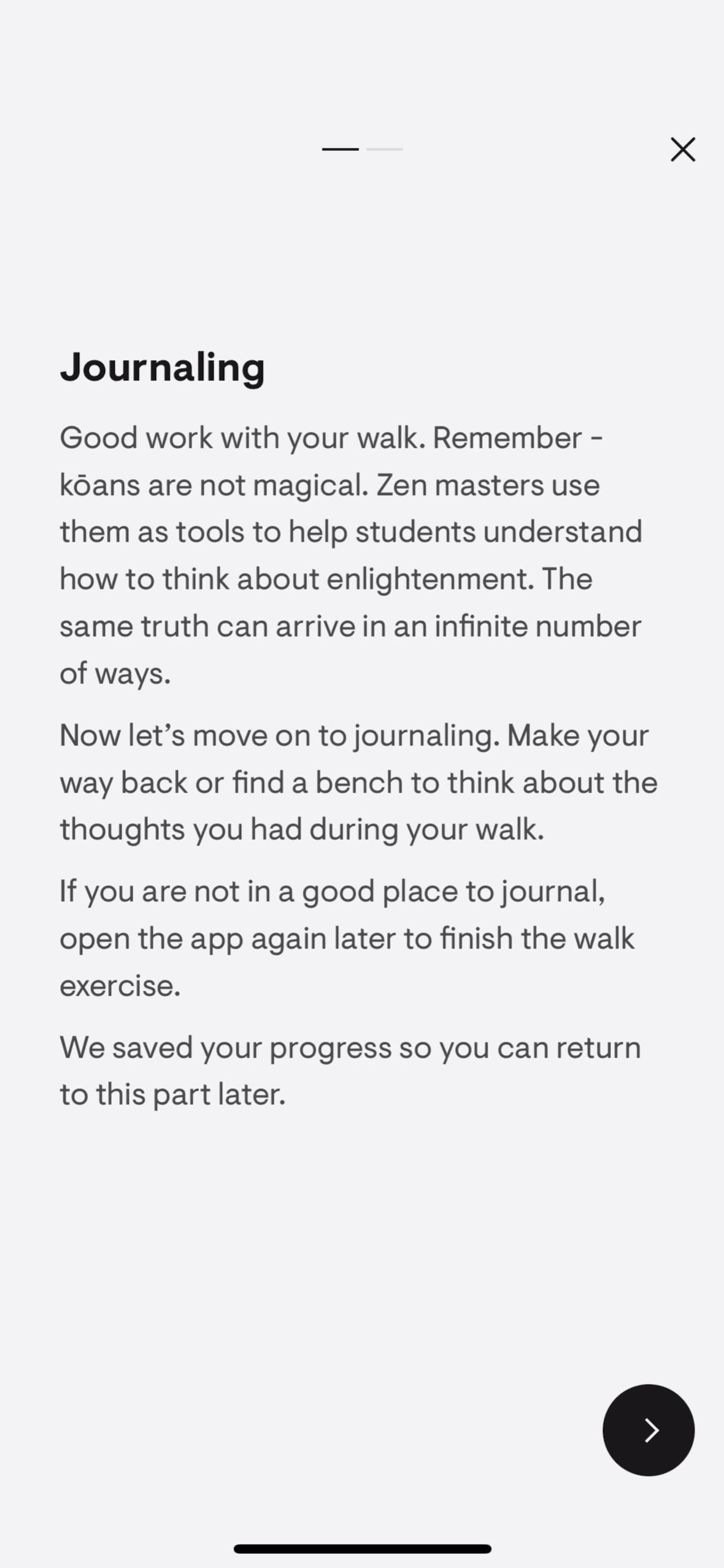 The user selects a walking meditation, completes the exercise with audio prompts and journaling, and then rates the experience. The flow guides the user through a structured meditation walk.