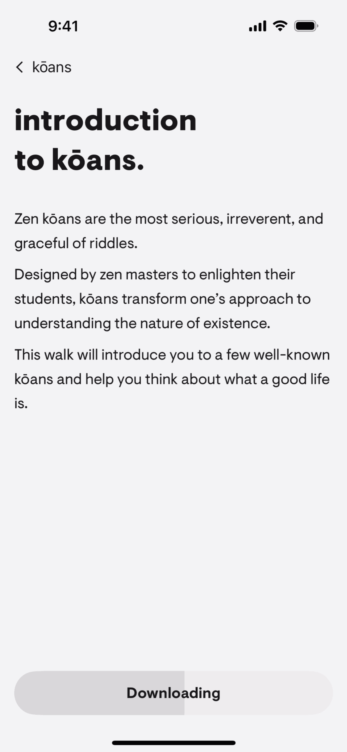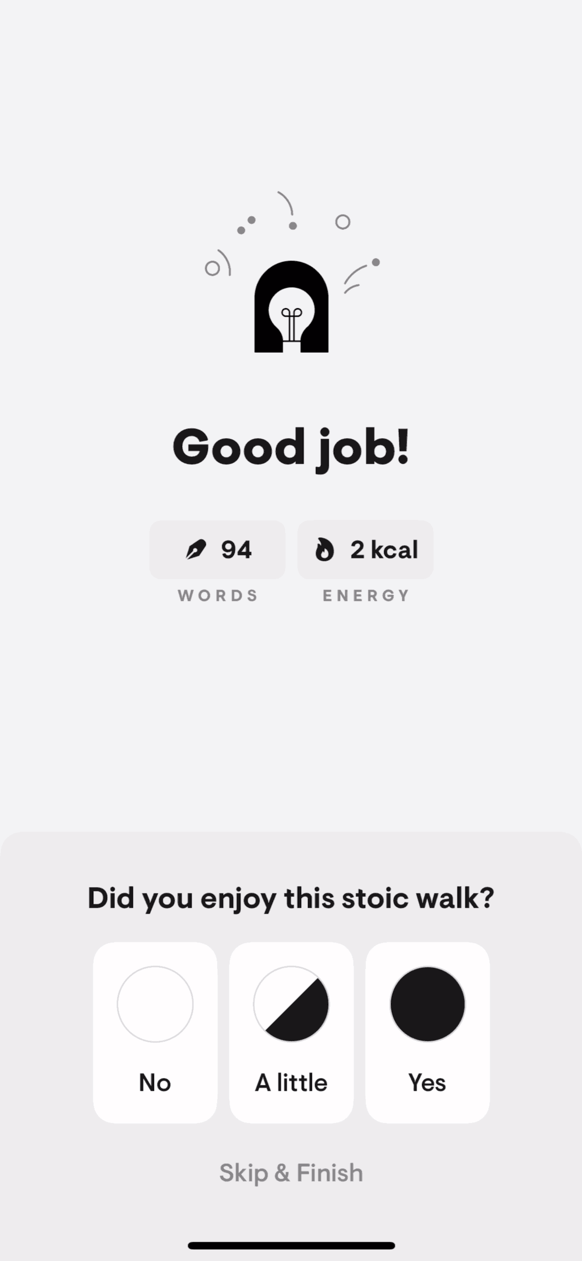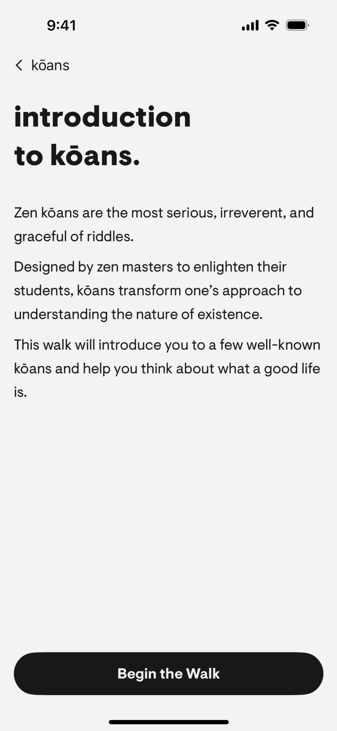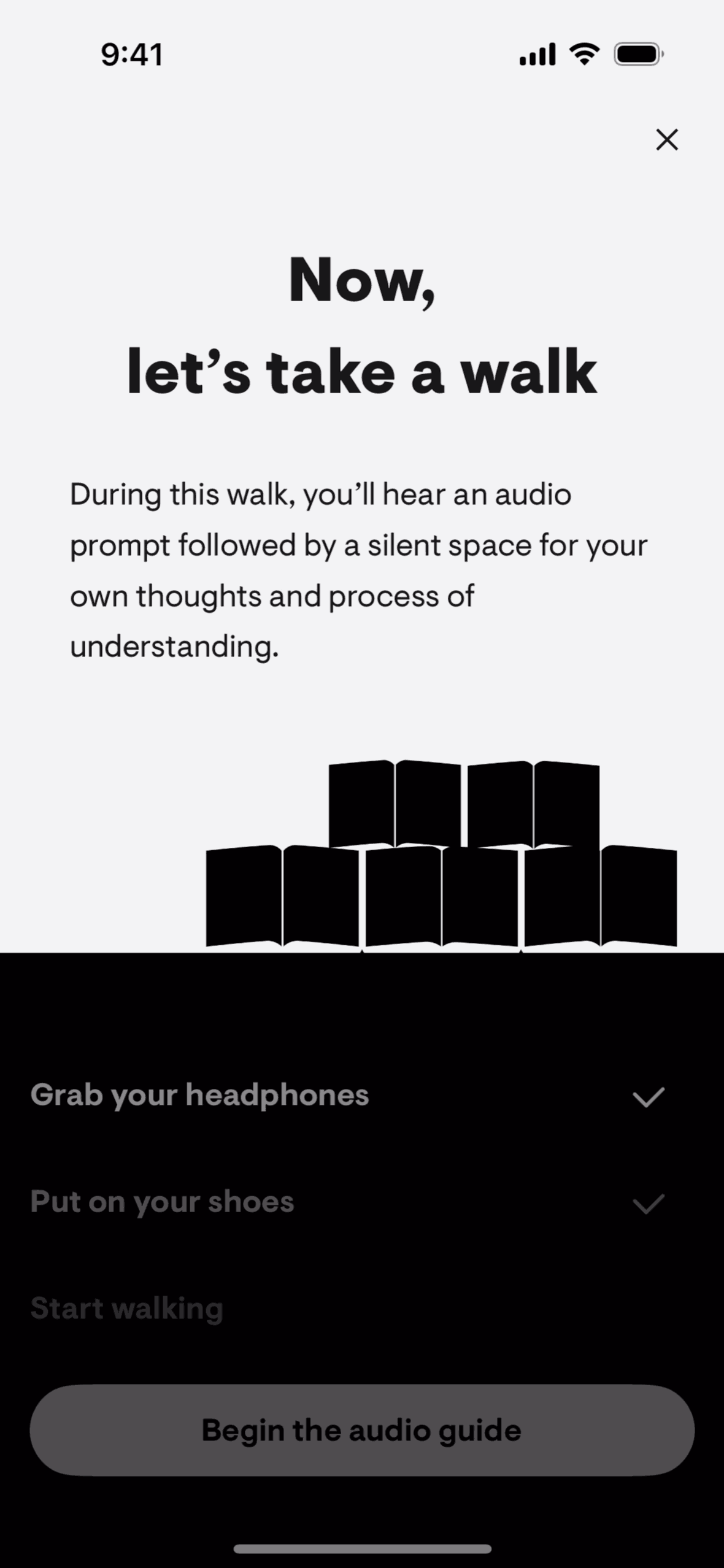The user selects a walking meditation, completes the exercise with audio prompts and journaling, and then rates the experience. The flow guides the user through a structured meditation walk.