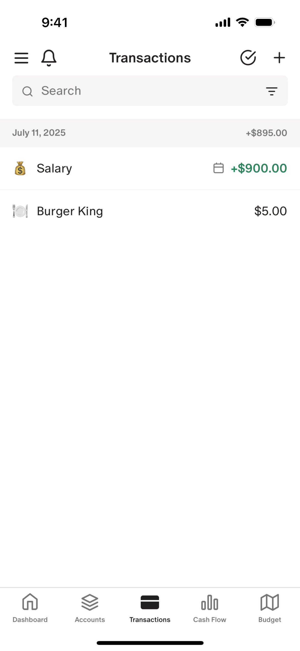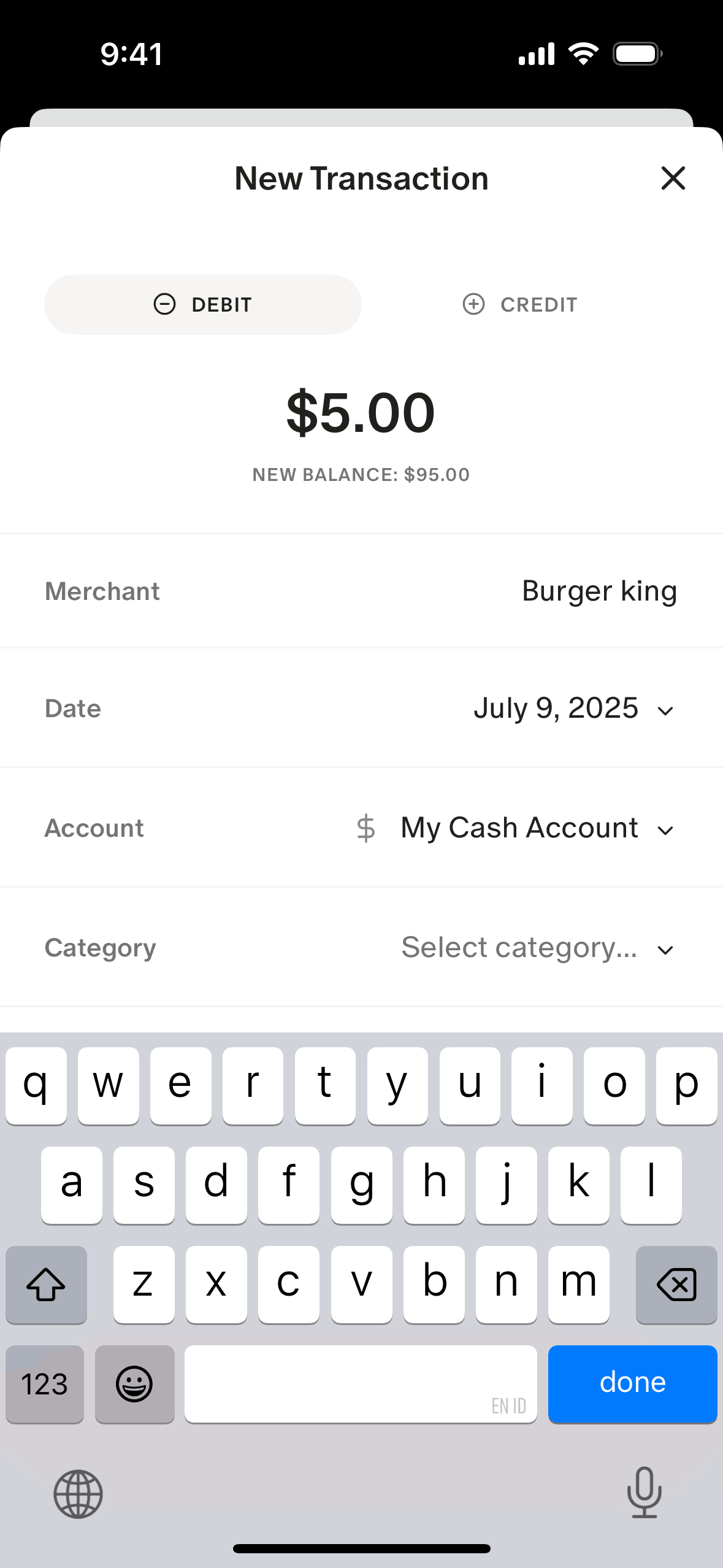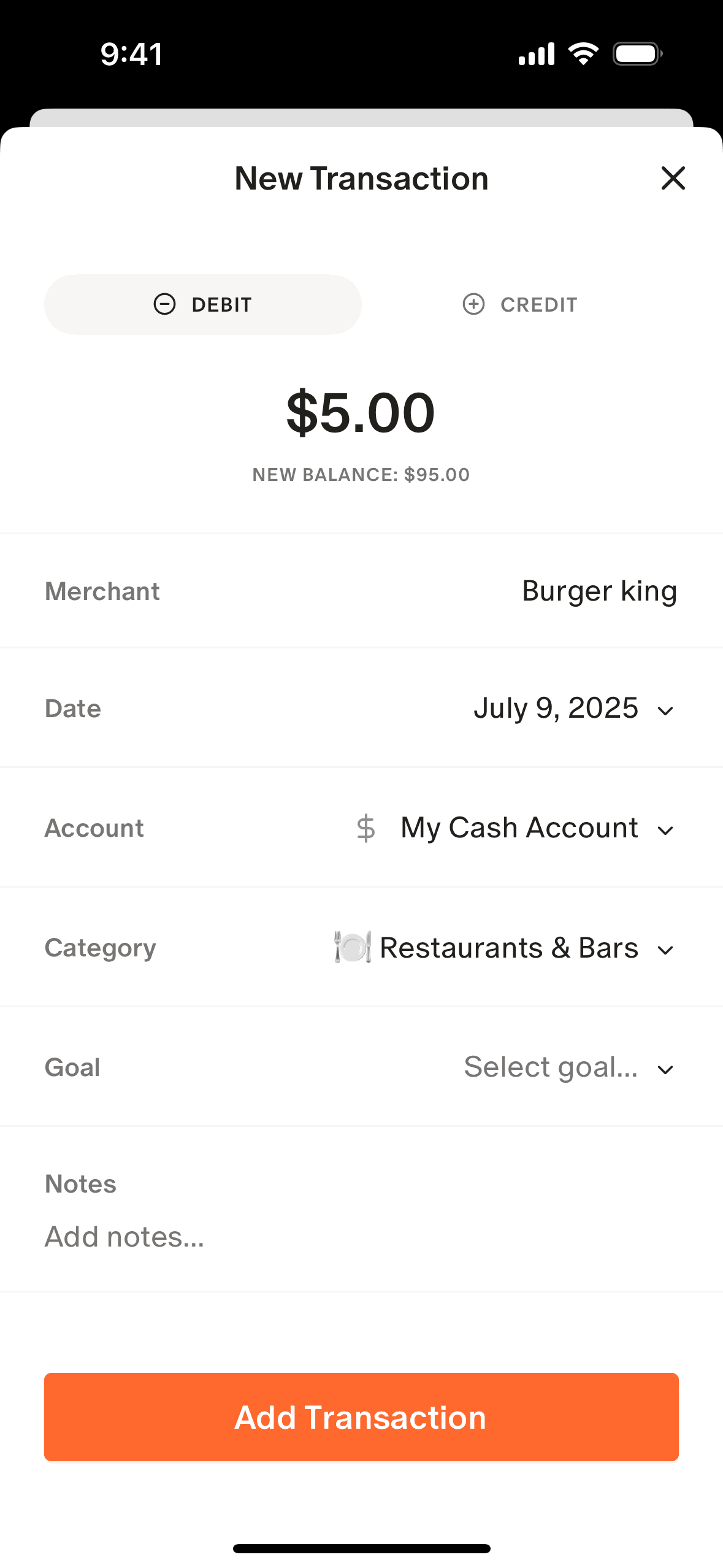 The user adds a new transaction by filling out a form. The new transaction is then displayed in the transaction list.