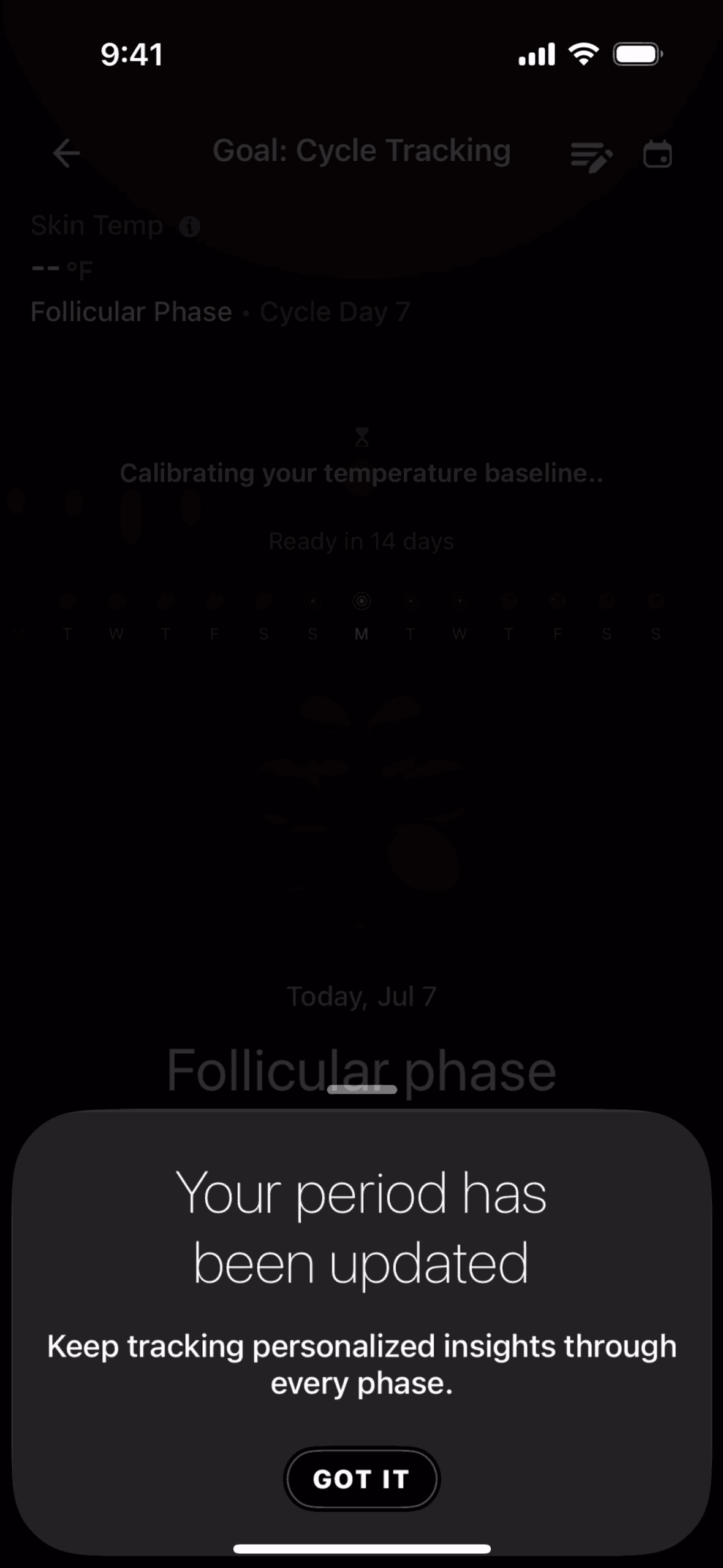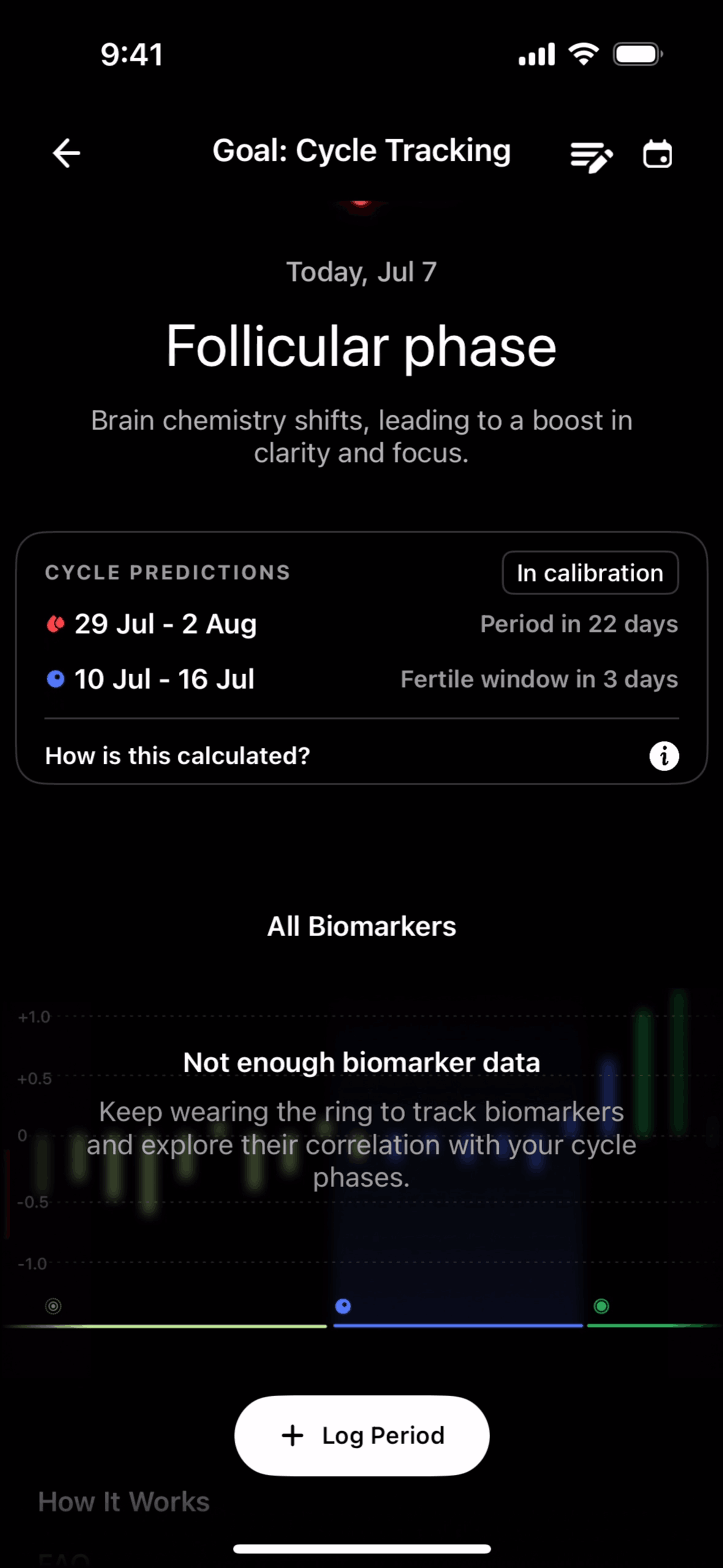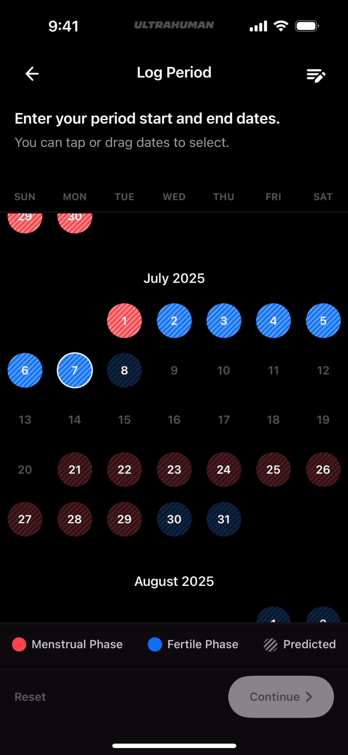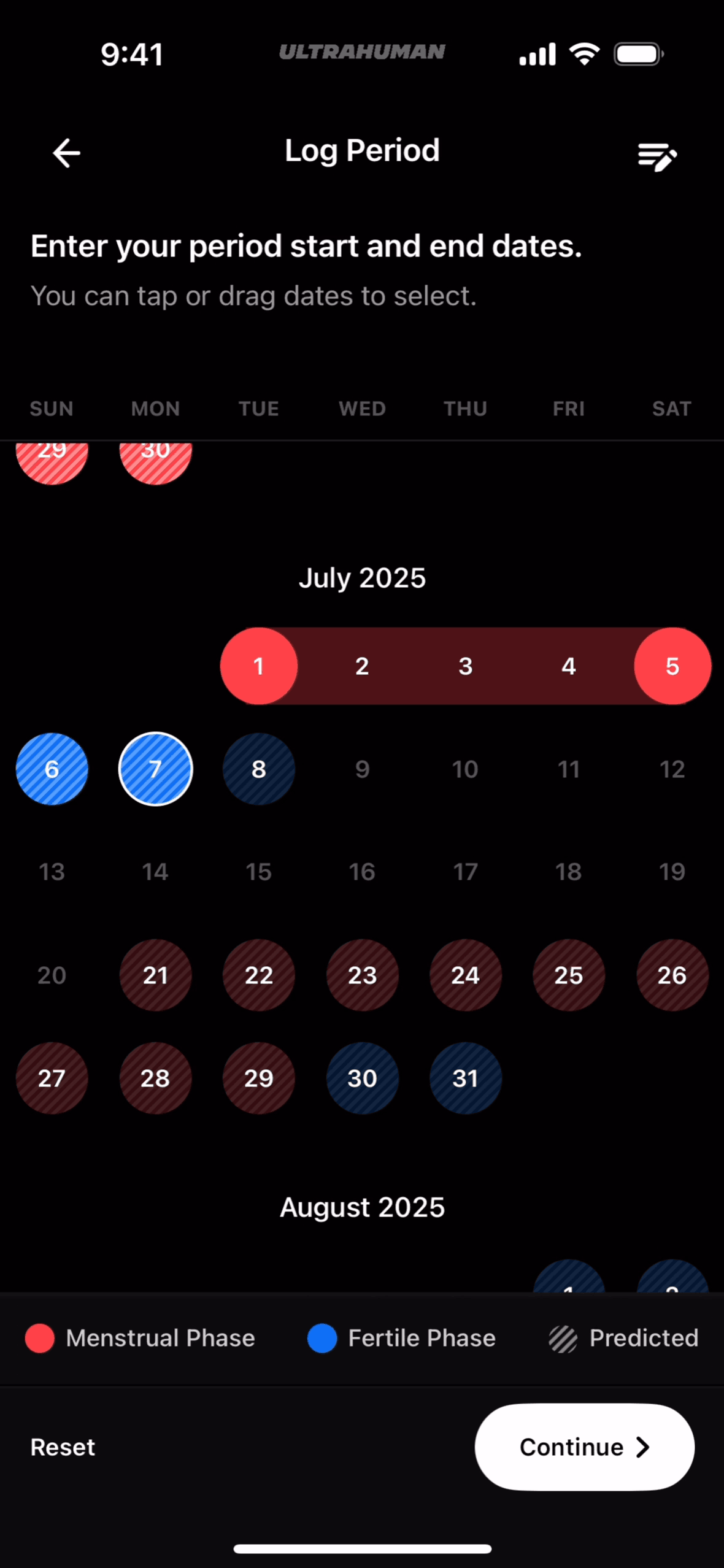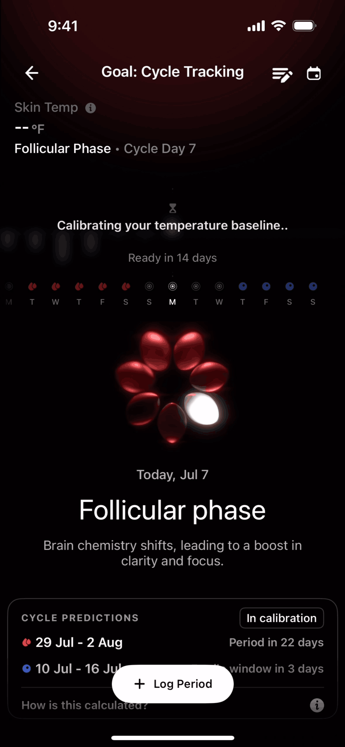 The user logs a period by selecting dates and specifying flow type, then views cycle tracking information. The flow showcases period logging and cycle tracking.