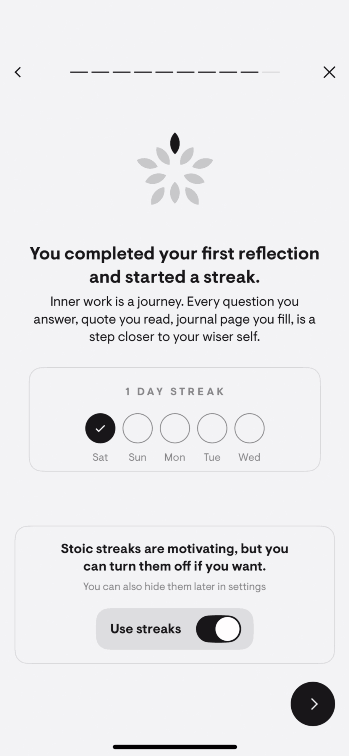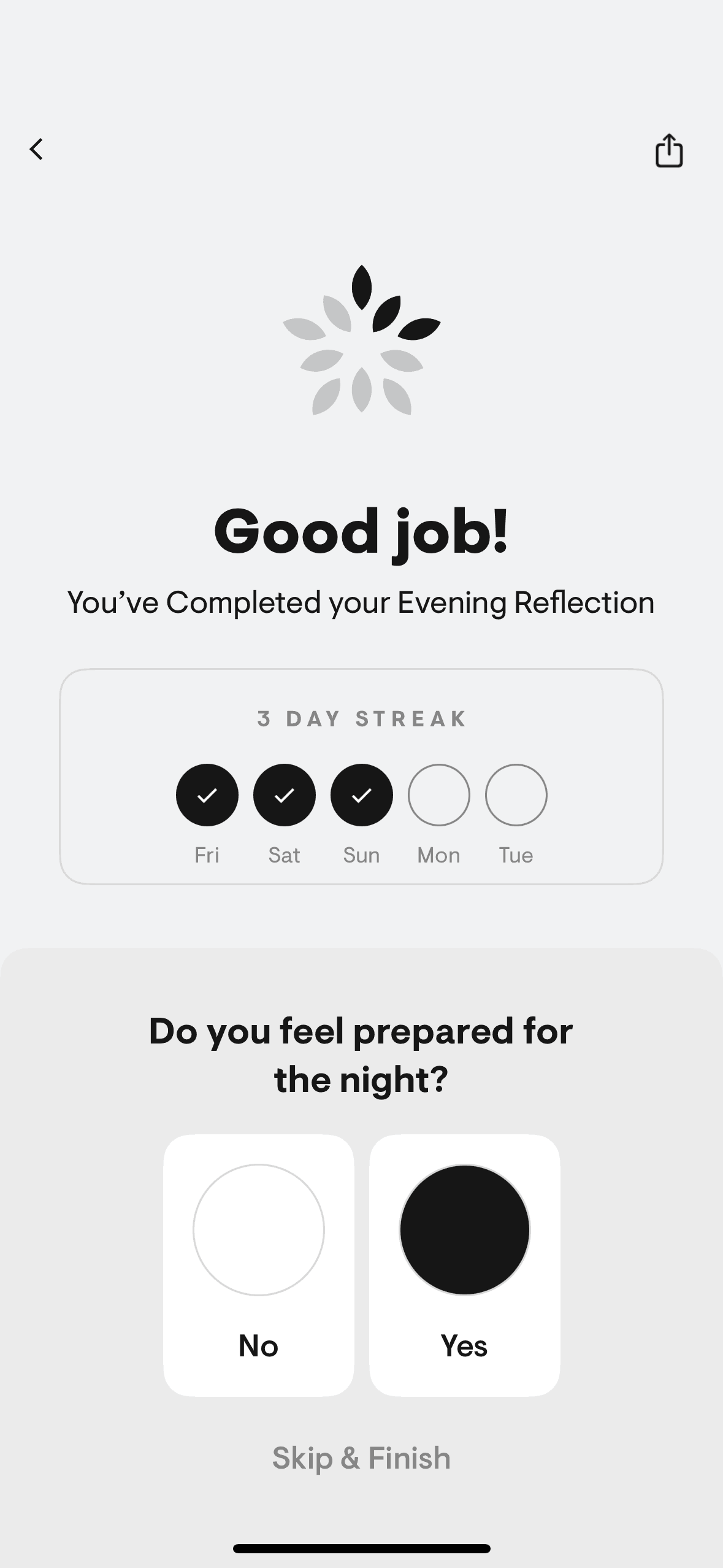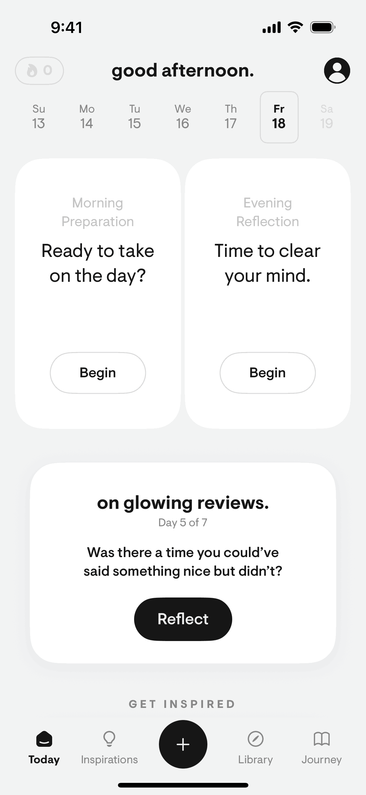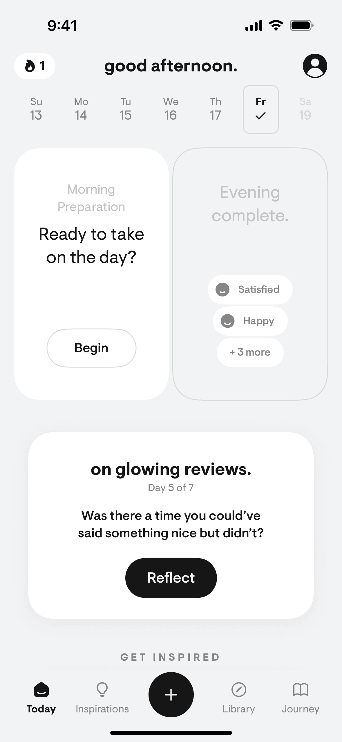 The user logs a daily reflection by rating sleep, selecting focus areas, writing plans, and engaging with reflection prompts. The flow culminates in a streak and completion confirmation.