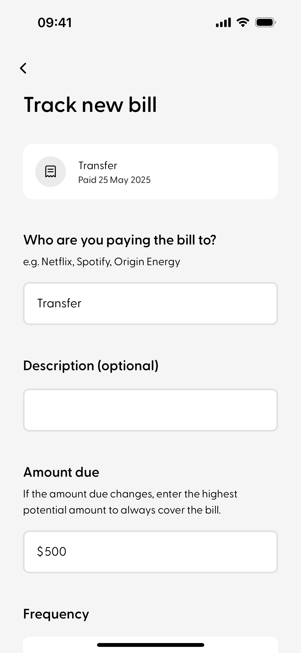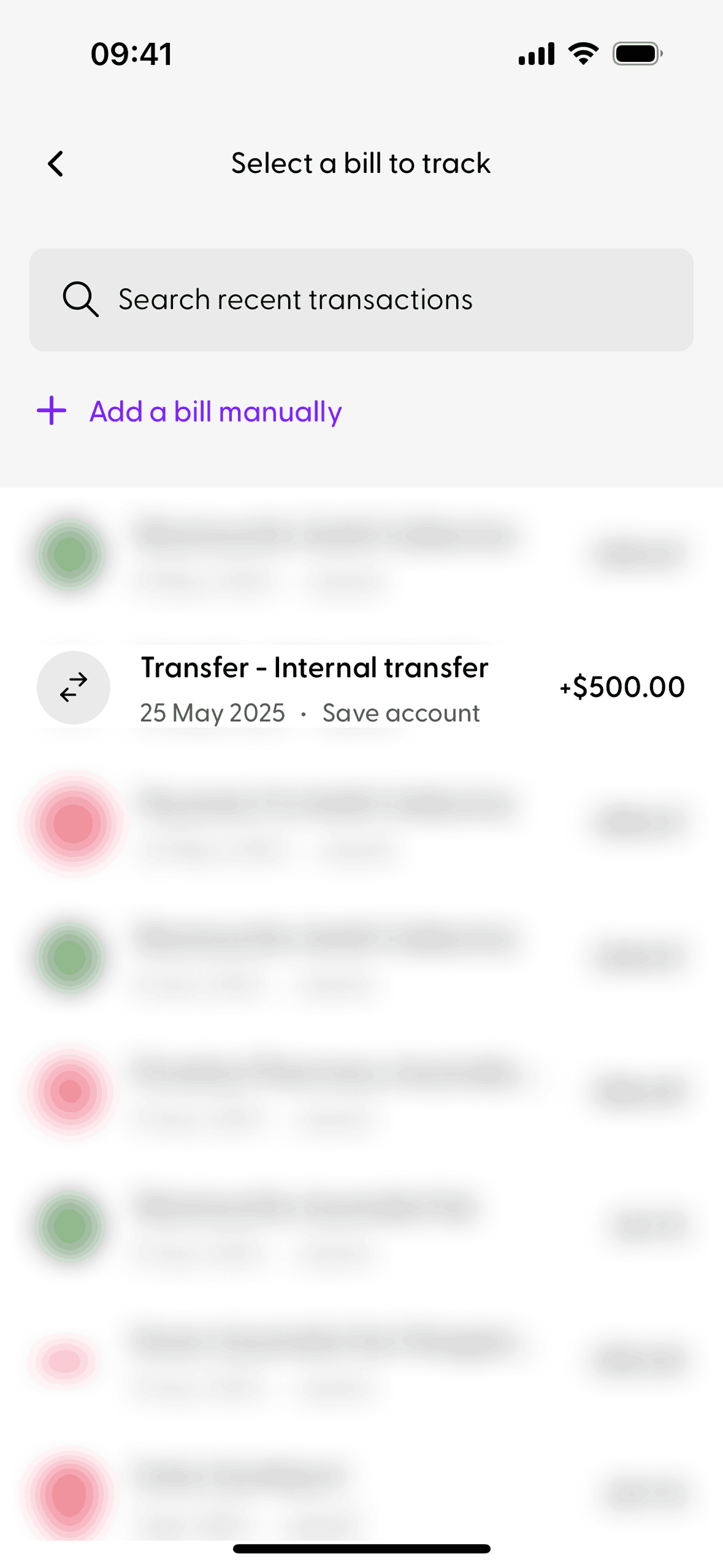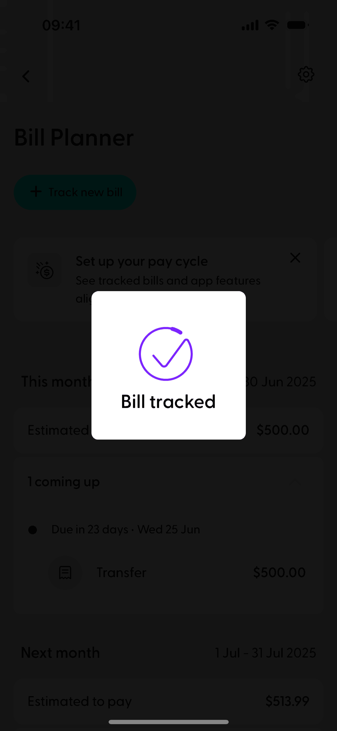 The user tracks a past transaction by selecting it from a list and then confirming the bill details. A confirmation message appears upon successful tracking.