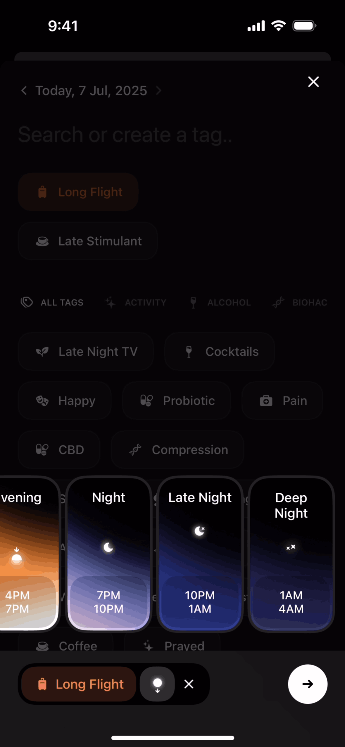 The user adds a tag to their profile by selecting a tag and a time. The flow confirms the tag has been added.