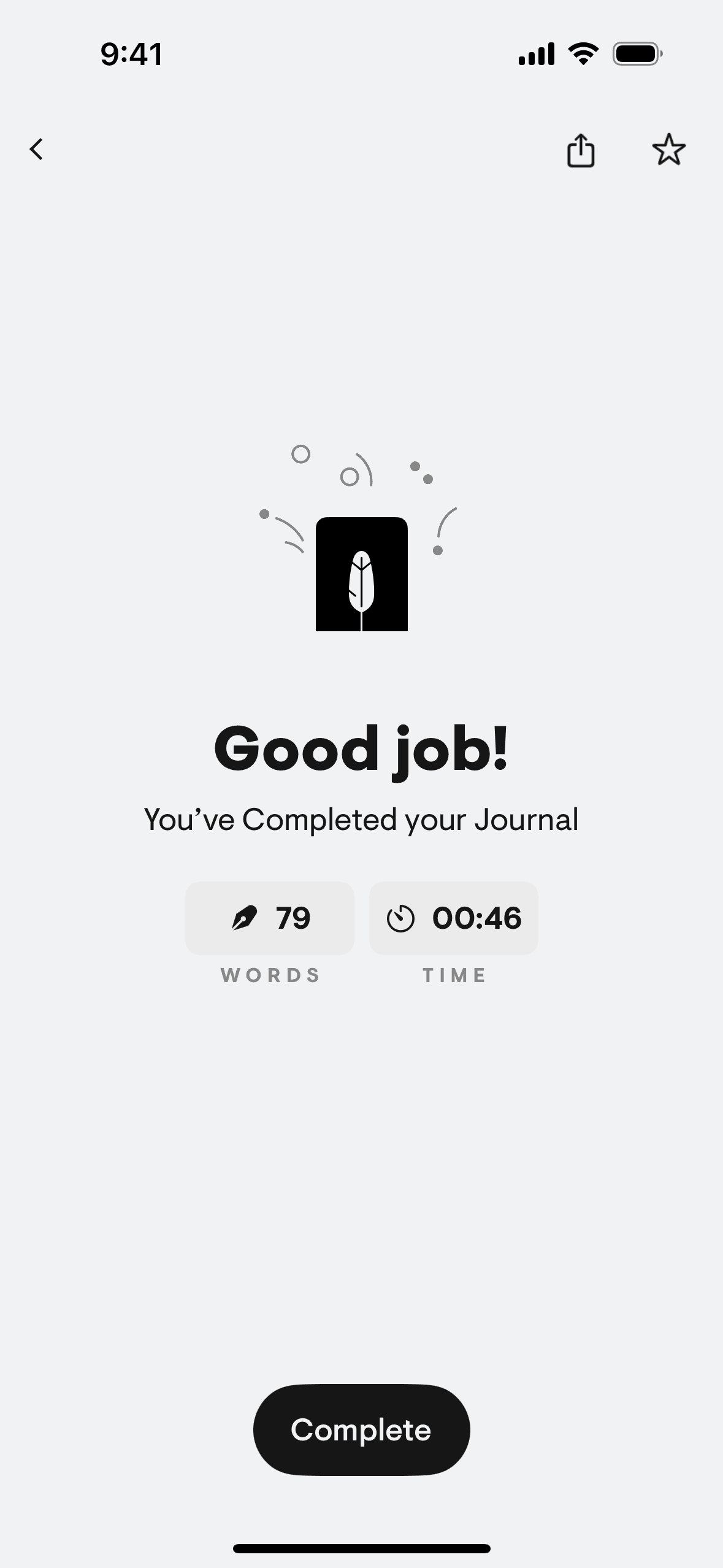 The user flow demonstrates logging a journal entry by selecting a suggested prompt, writing the entry, and viewing the completion summary.