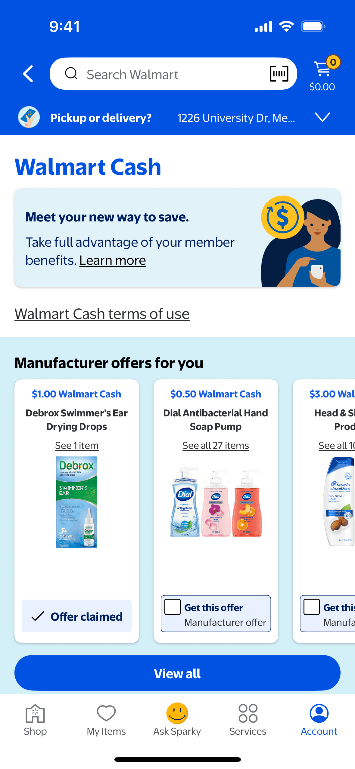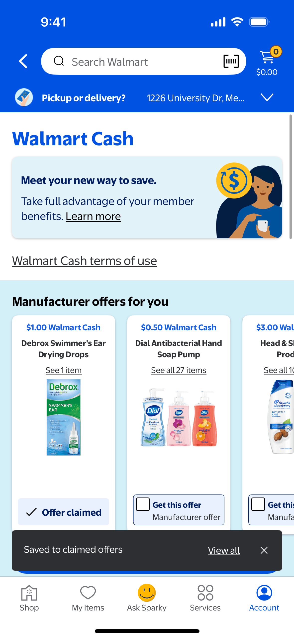 The user flow shows claiming an offer on the Walmart Cash page. The user selects an offer, which is then confirmed on the screen.
