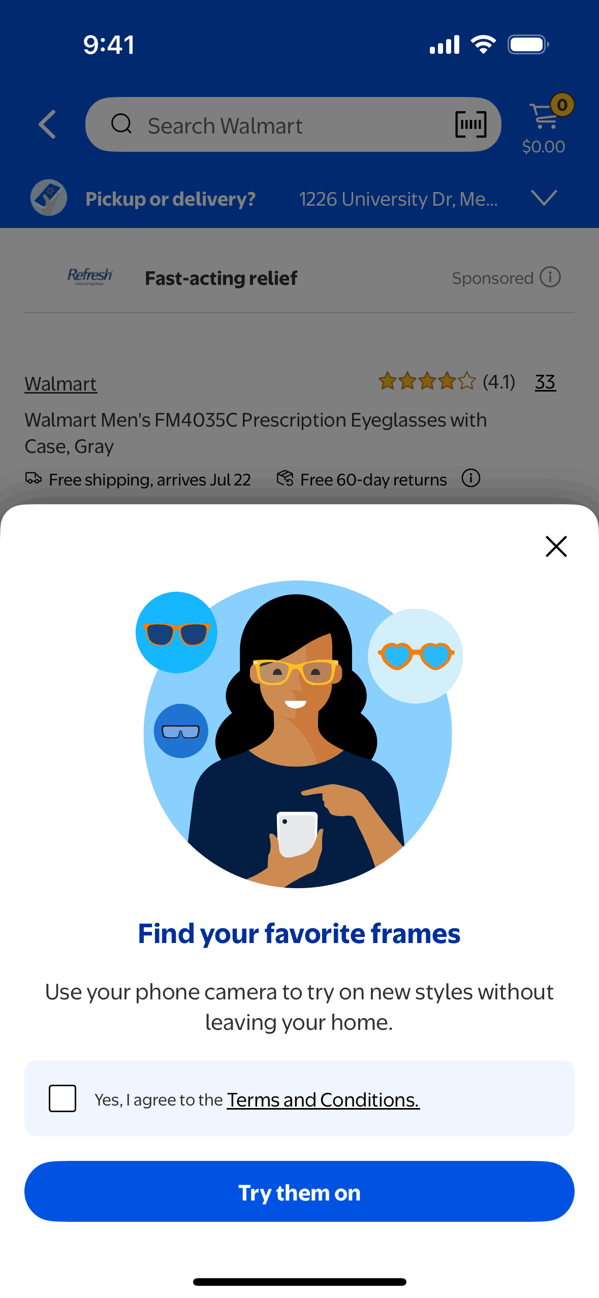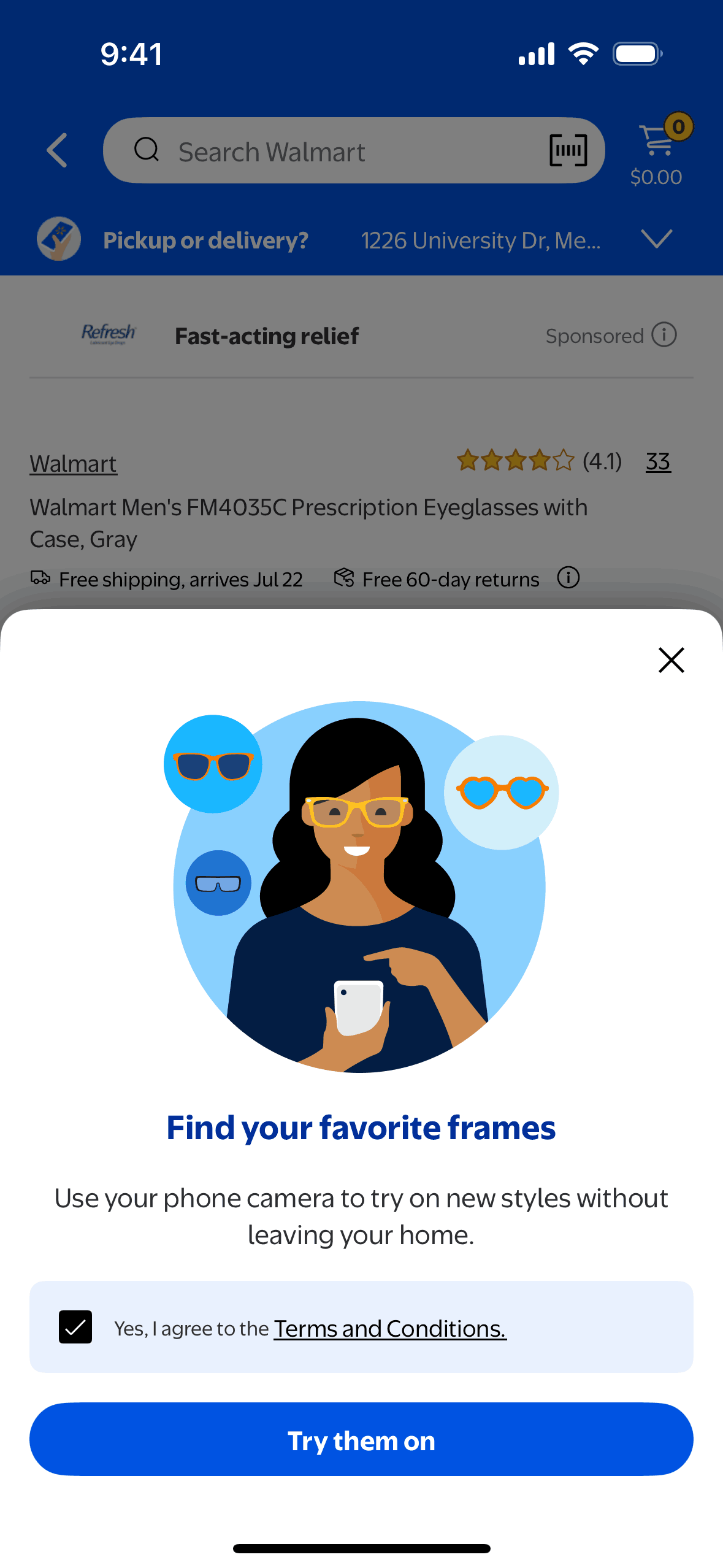 The user flow showcases the process of trying on eyeglasses virtually. It involves agreeing to terms and then accessing the virtual try-on interface.