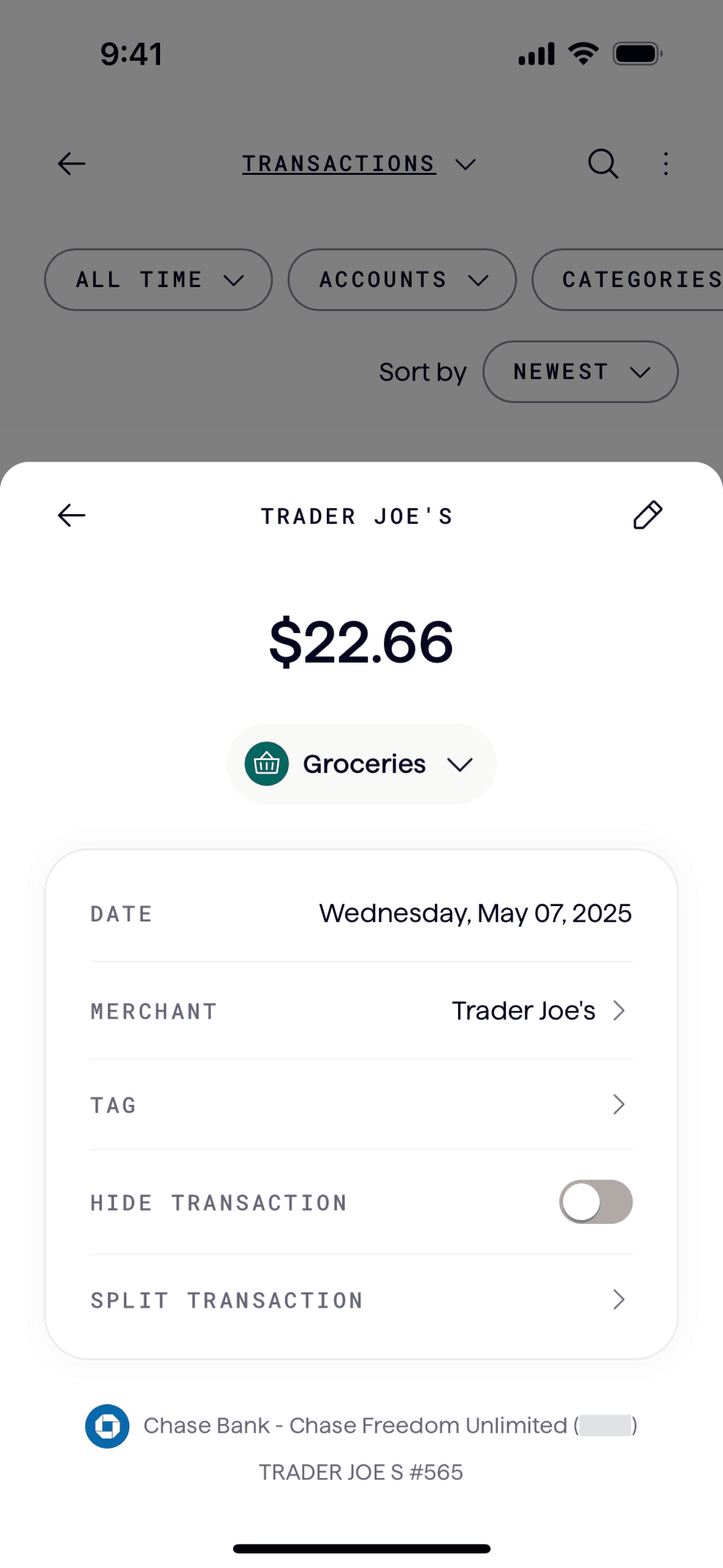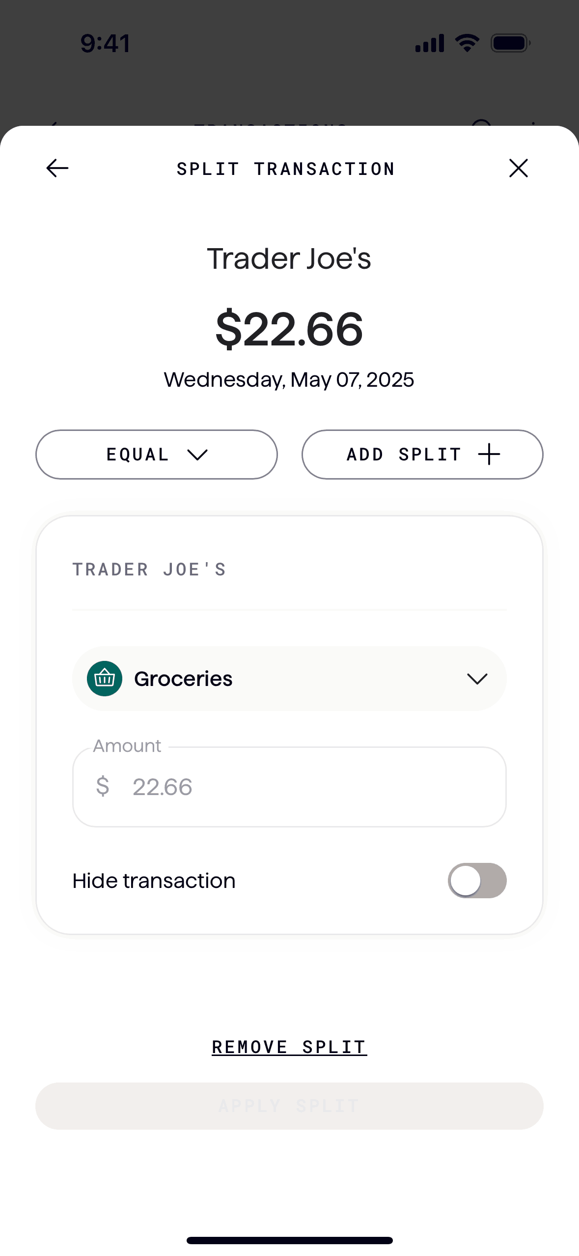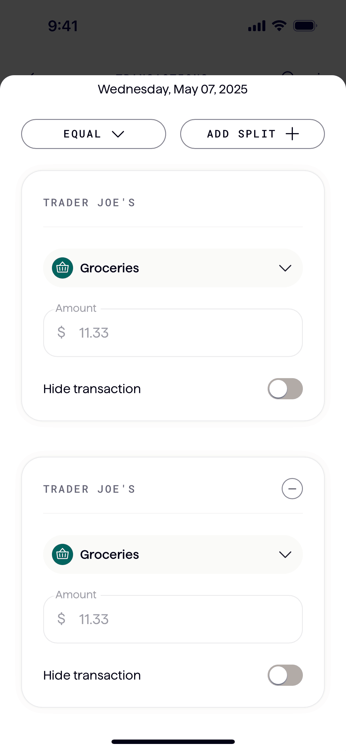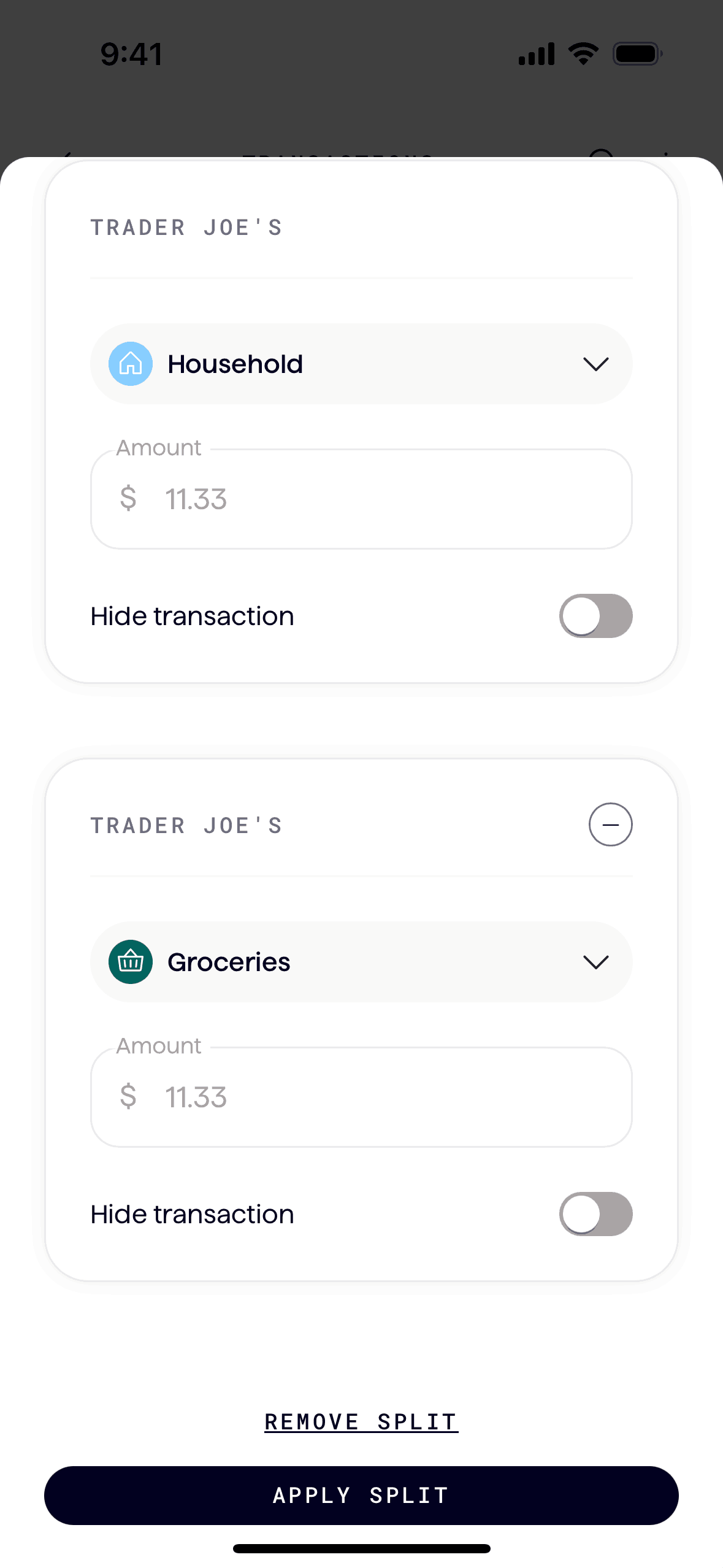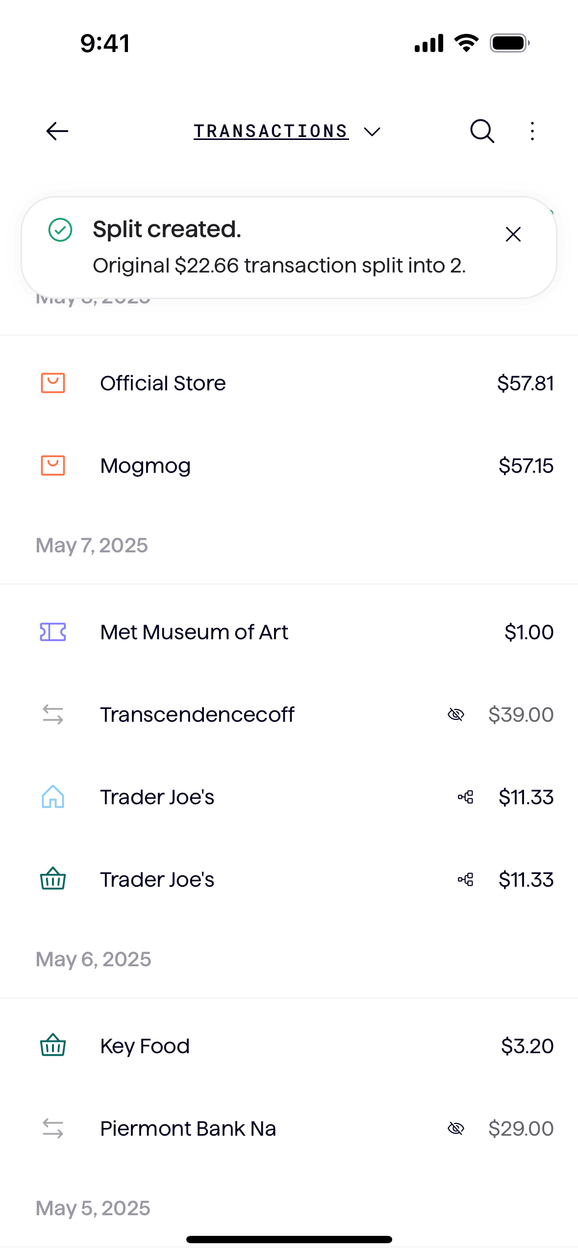 The user splits a transaction into multiple parts and categorizes each split. The updated transaction list reflects the split transactions.