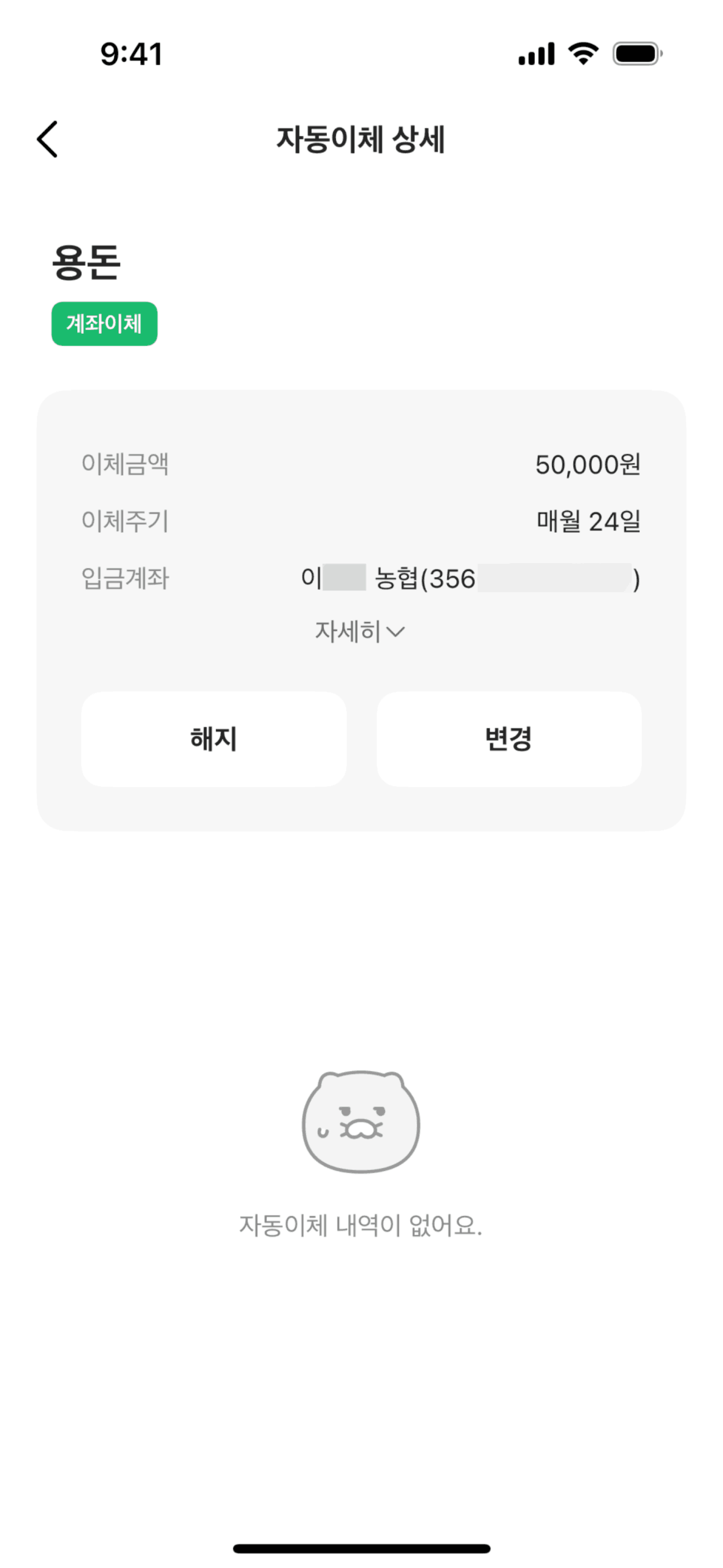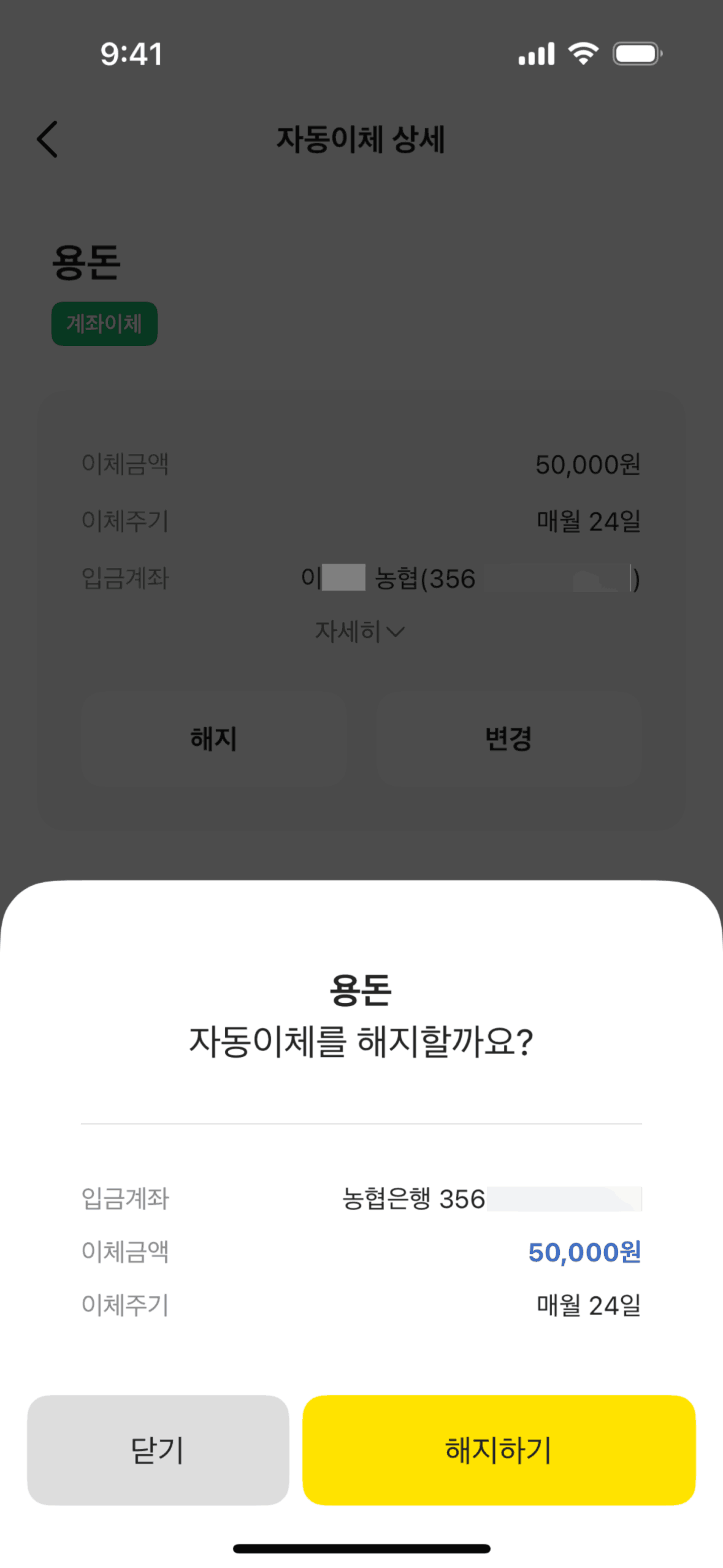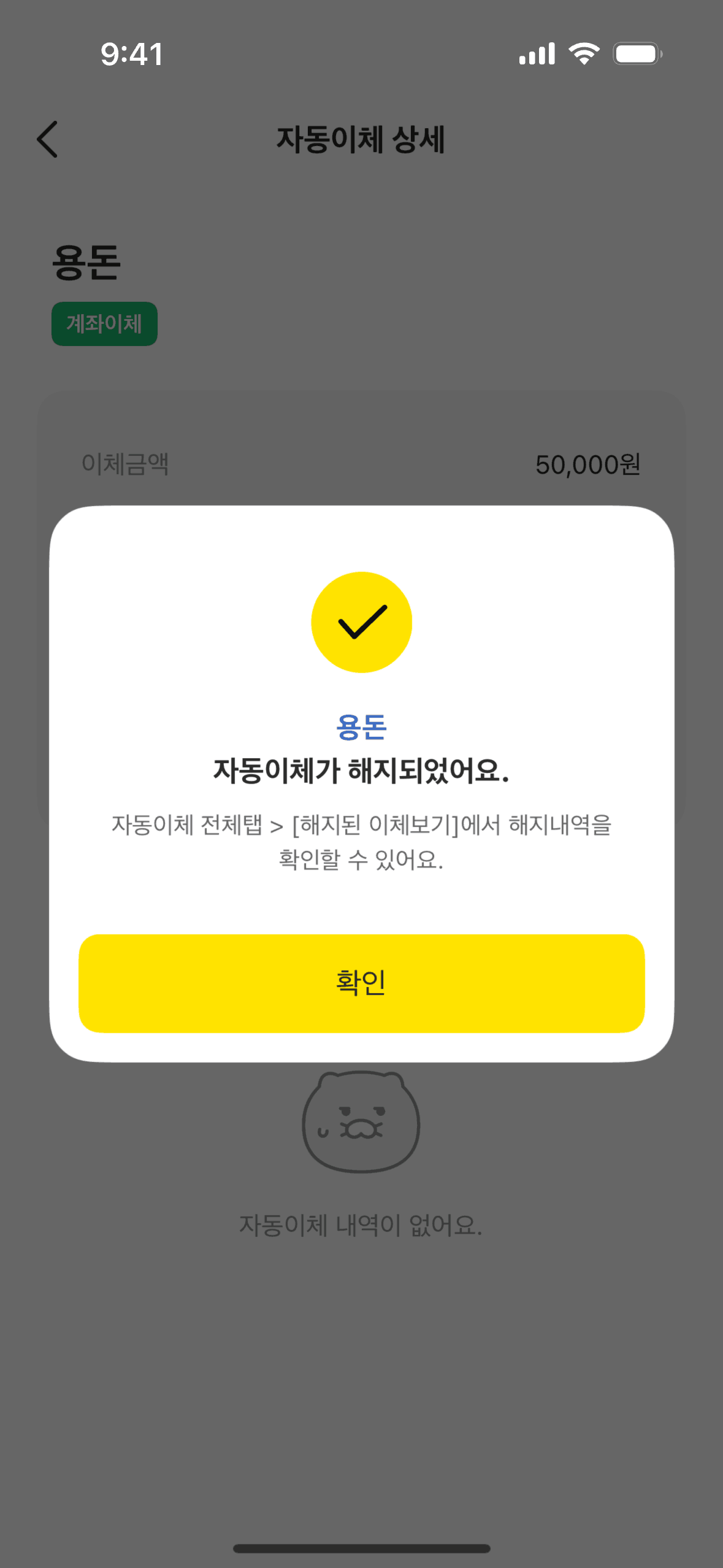 The user views automatic transfer details, cancels the transfer, and receives a confirmation. The flow showcases canceling a scheduled transfer.