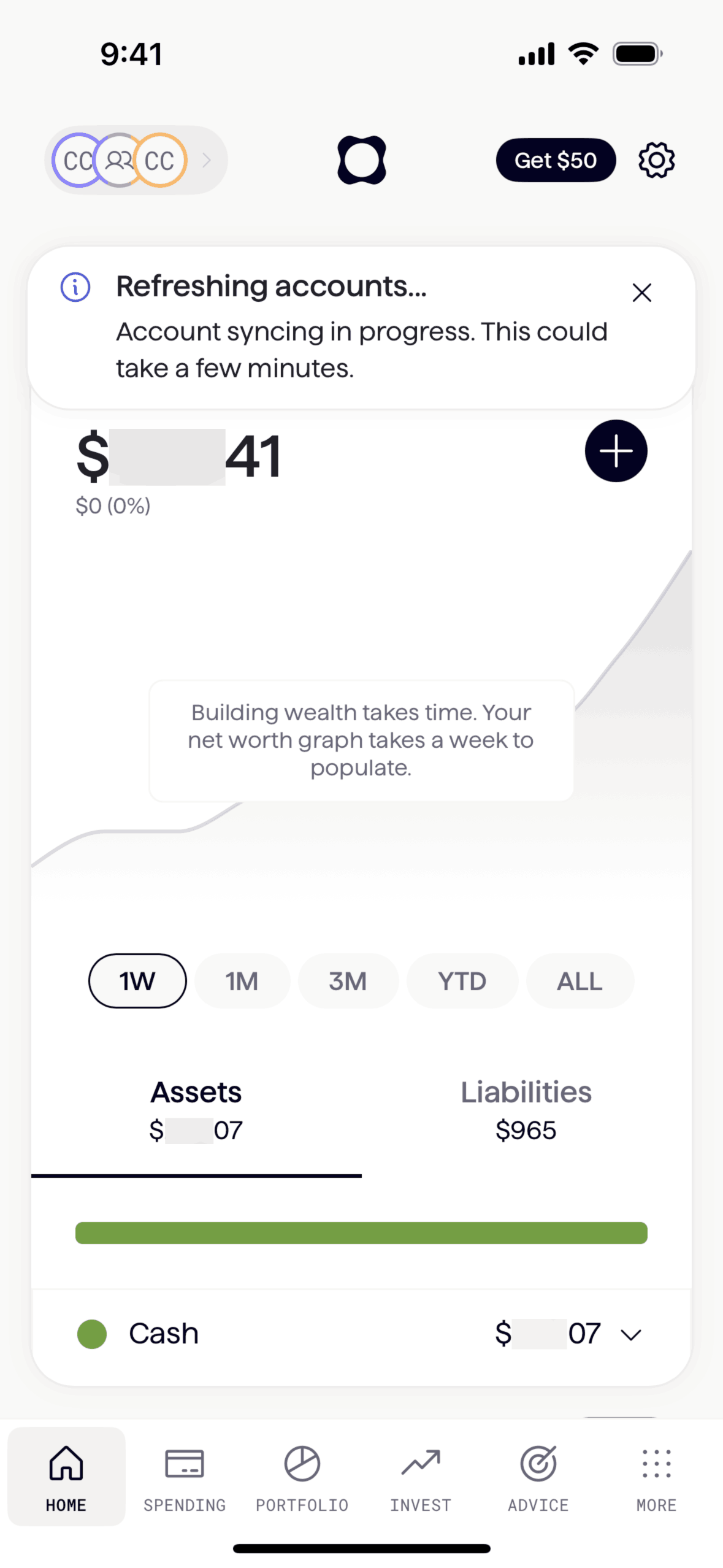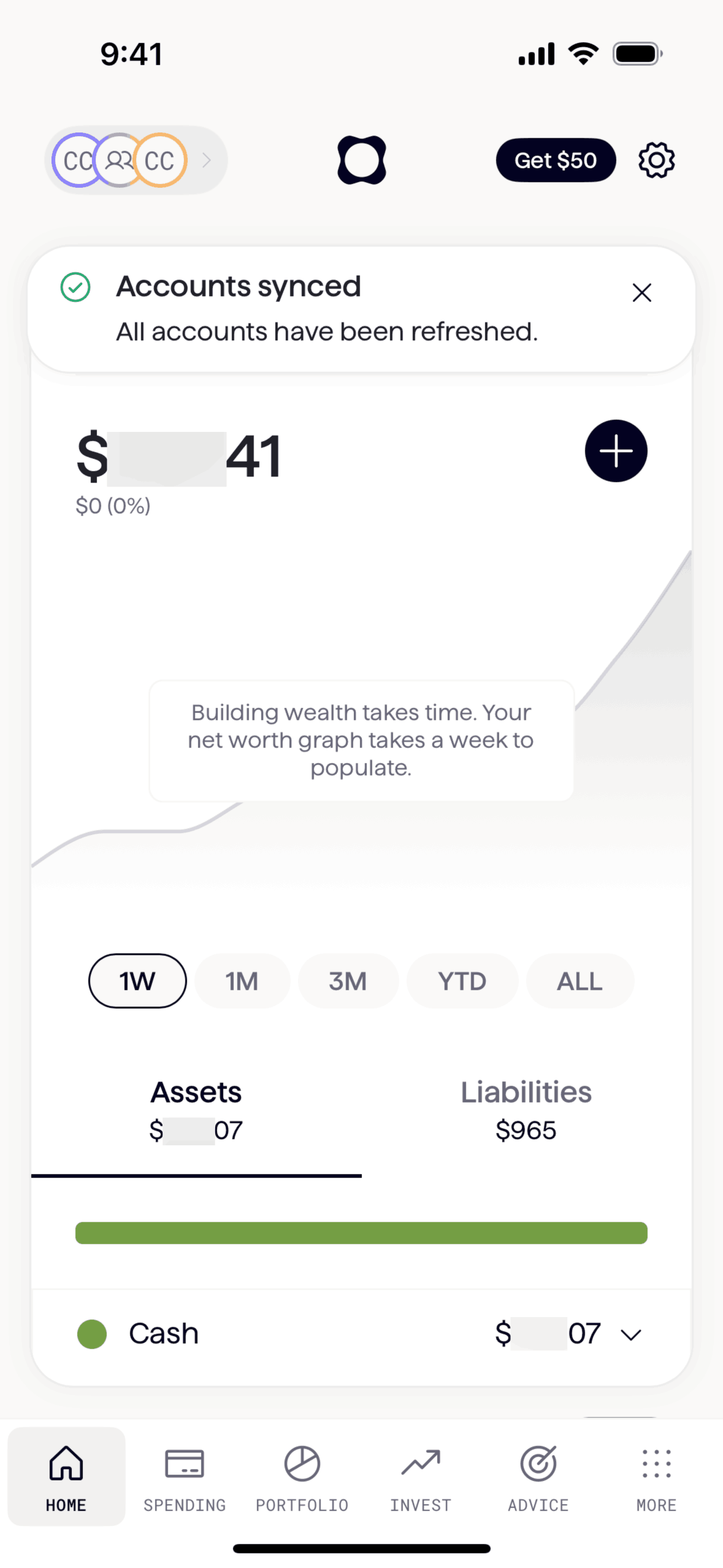 The user refreshes their accounts from the options menu. The app then syncs the accounts and displays a confirmation message.