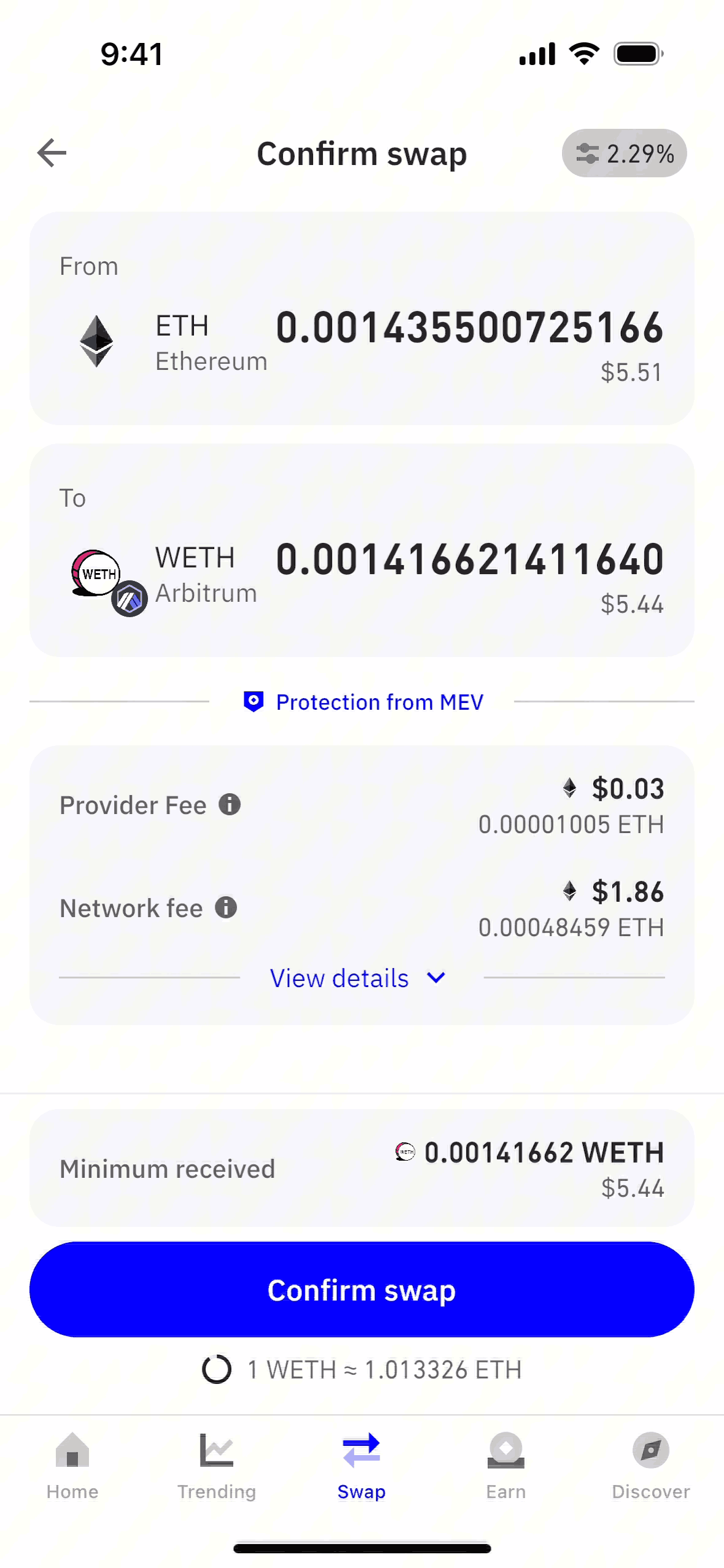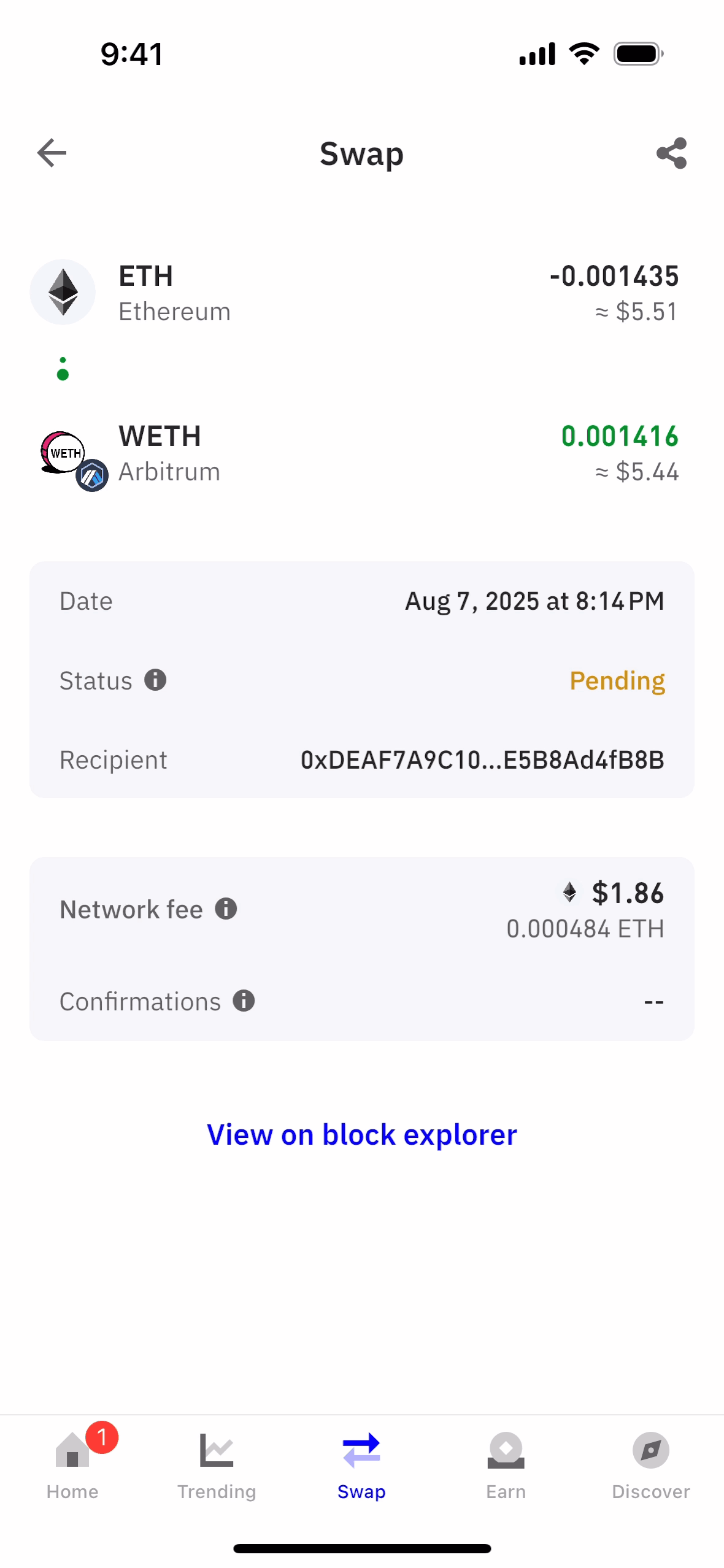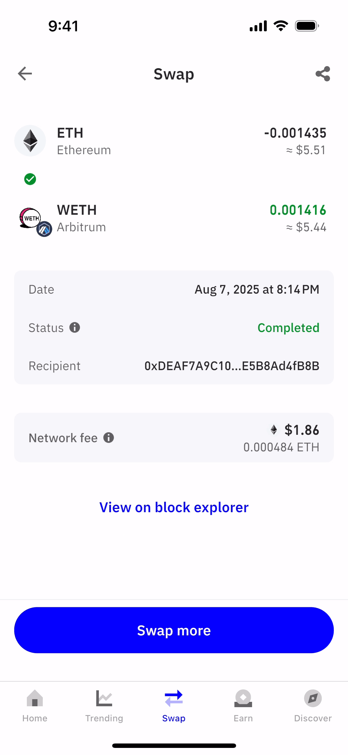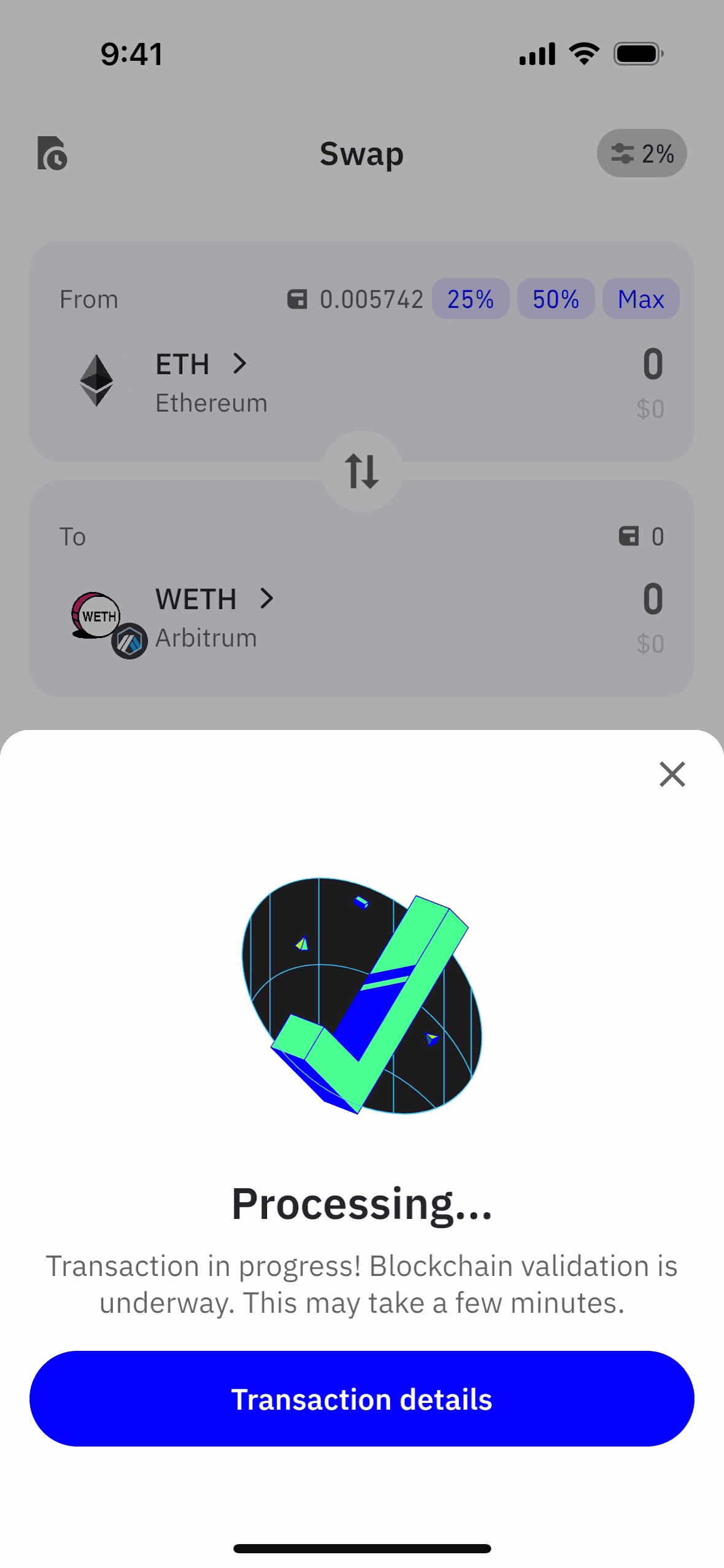 The user flow showcases swapping ETH for WETH. It includes entering the amount, confirming details, and viewing the transaction status.