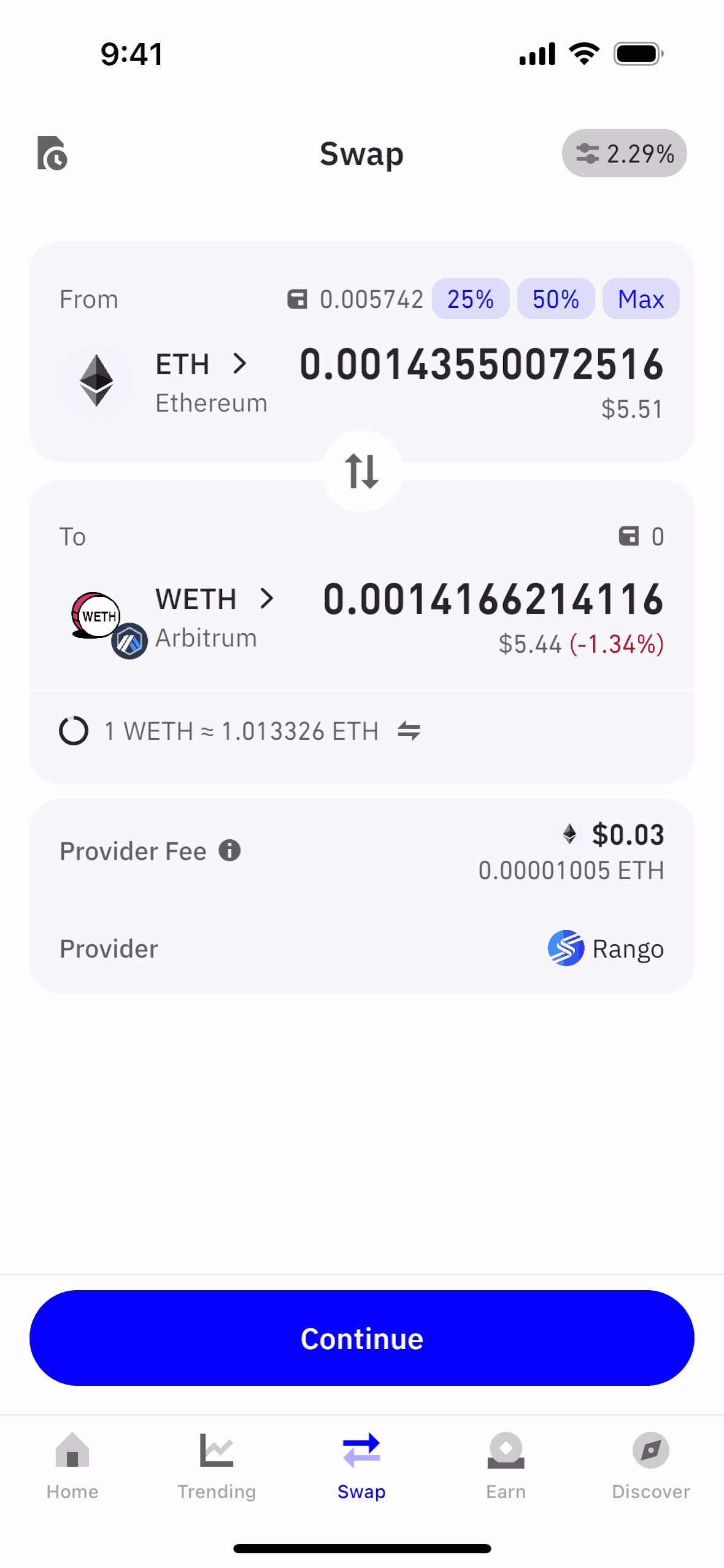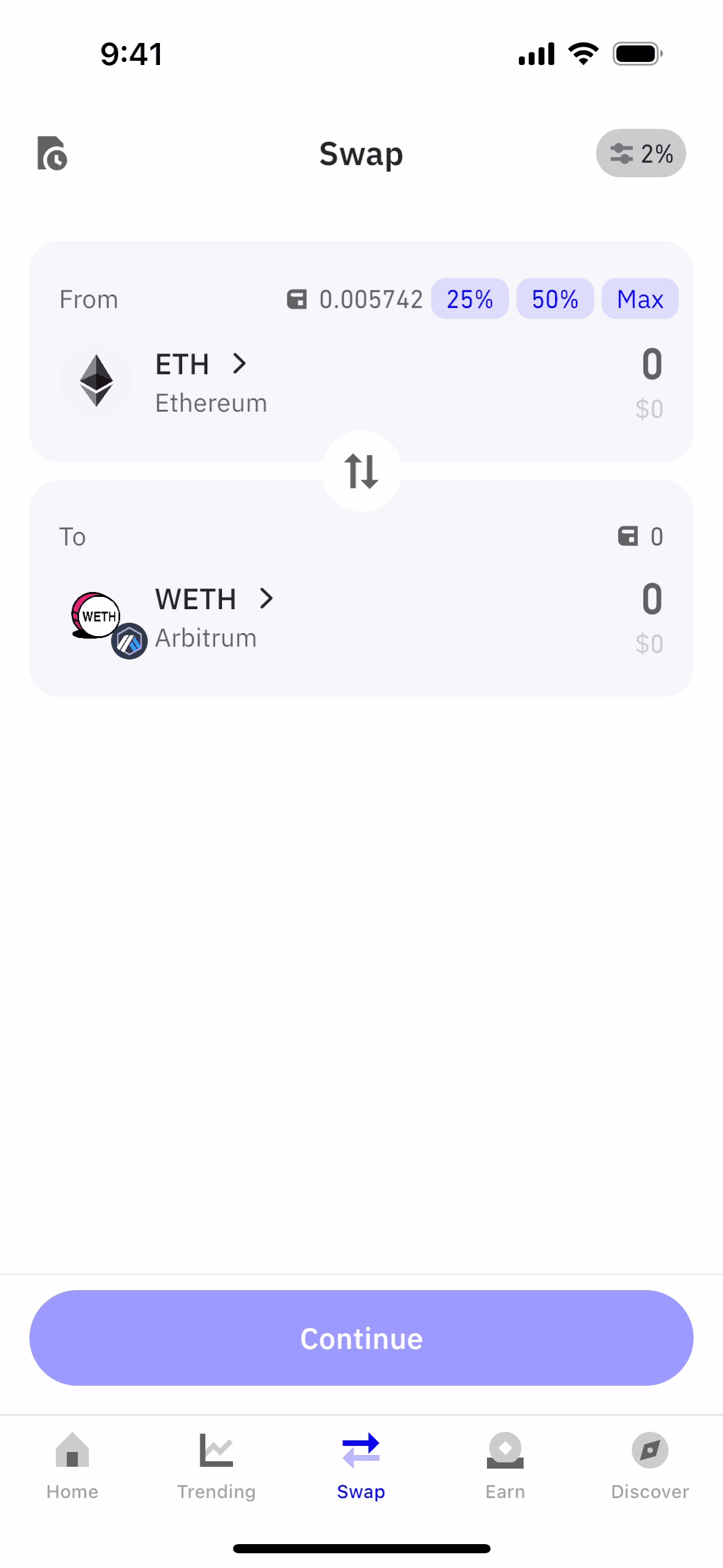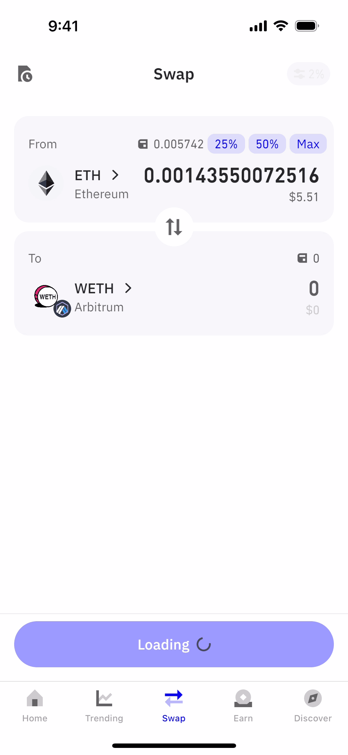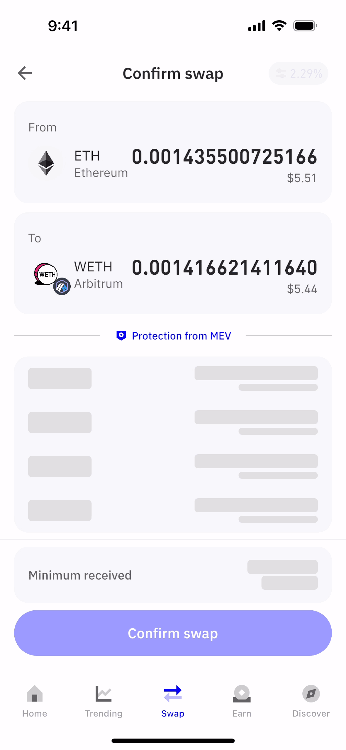 The user flow showcases swapping ETH for WETH. It includes entering the amount, confirming details, and viewing the transaction status.