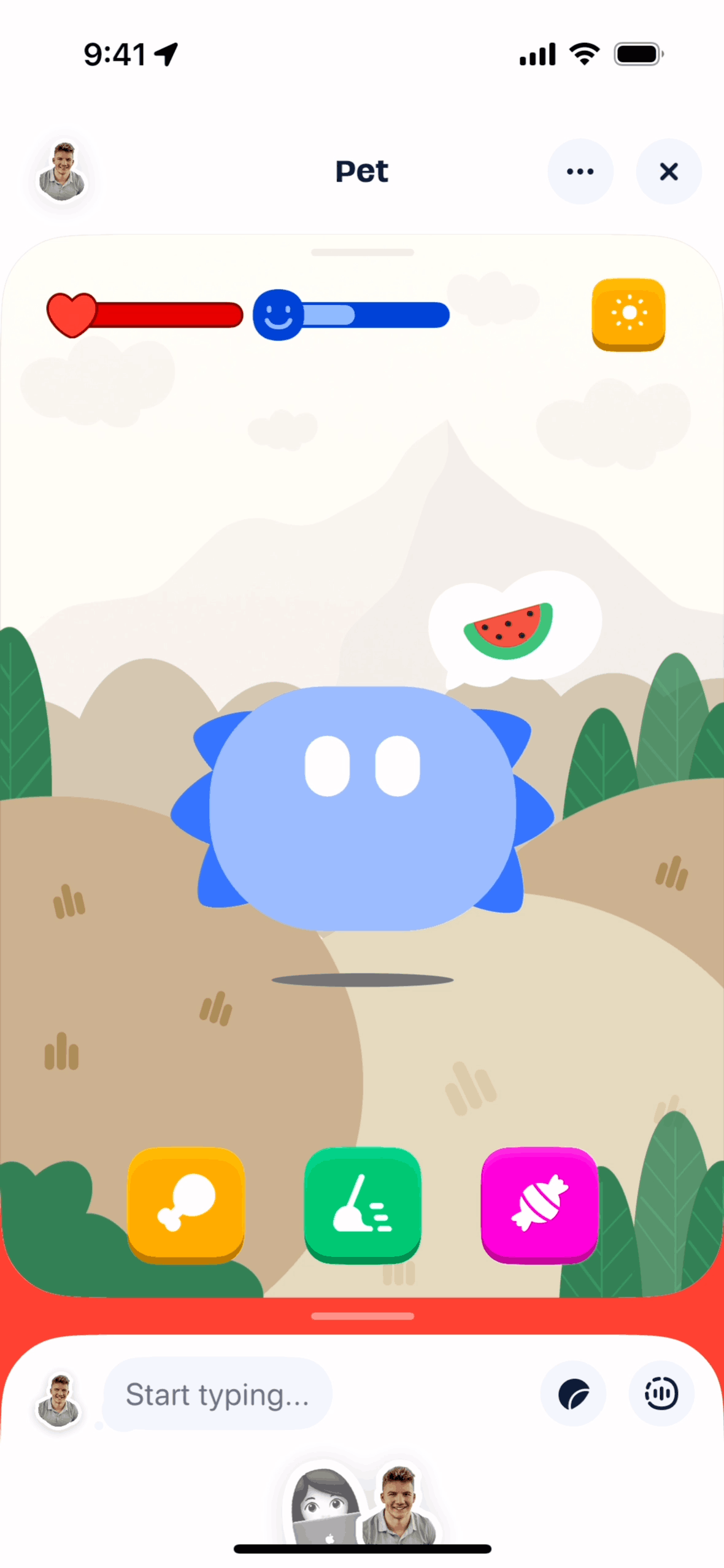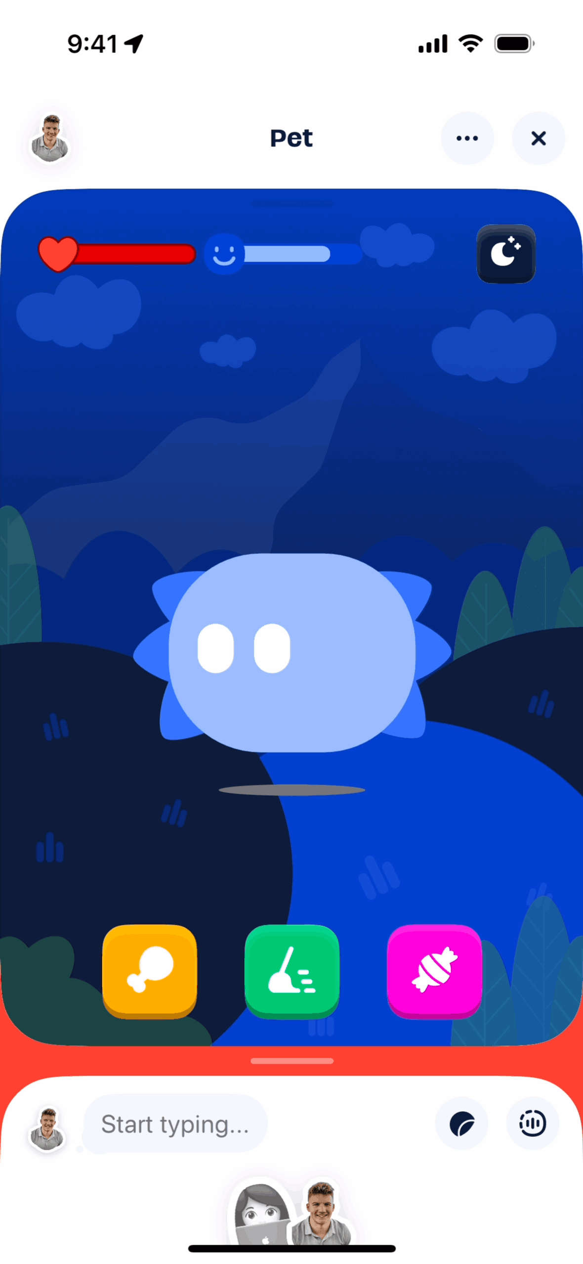 The user hatches a virtual pet from an egg and views the pet in a day and night setting. The flow returns to the dashboard with the updated pet.