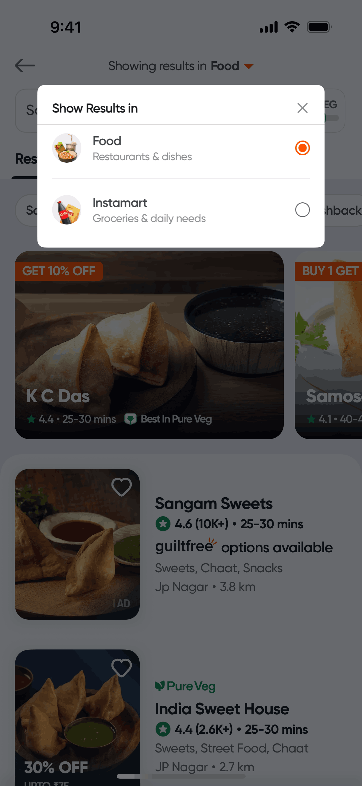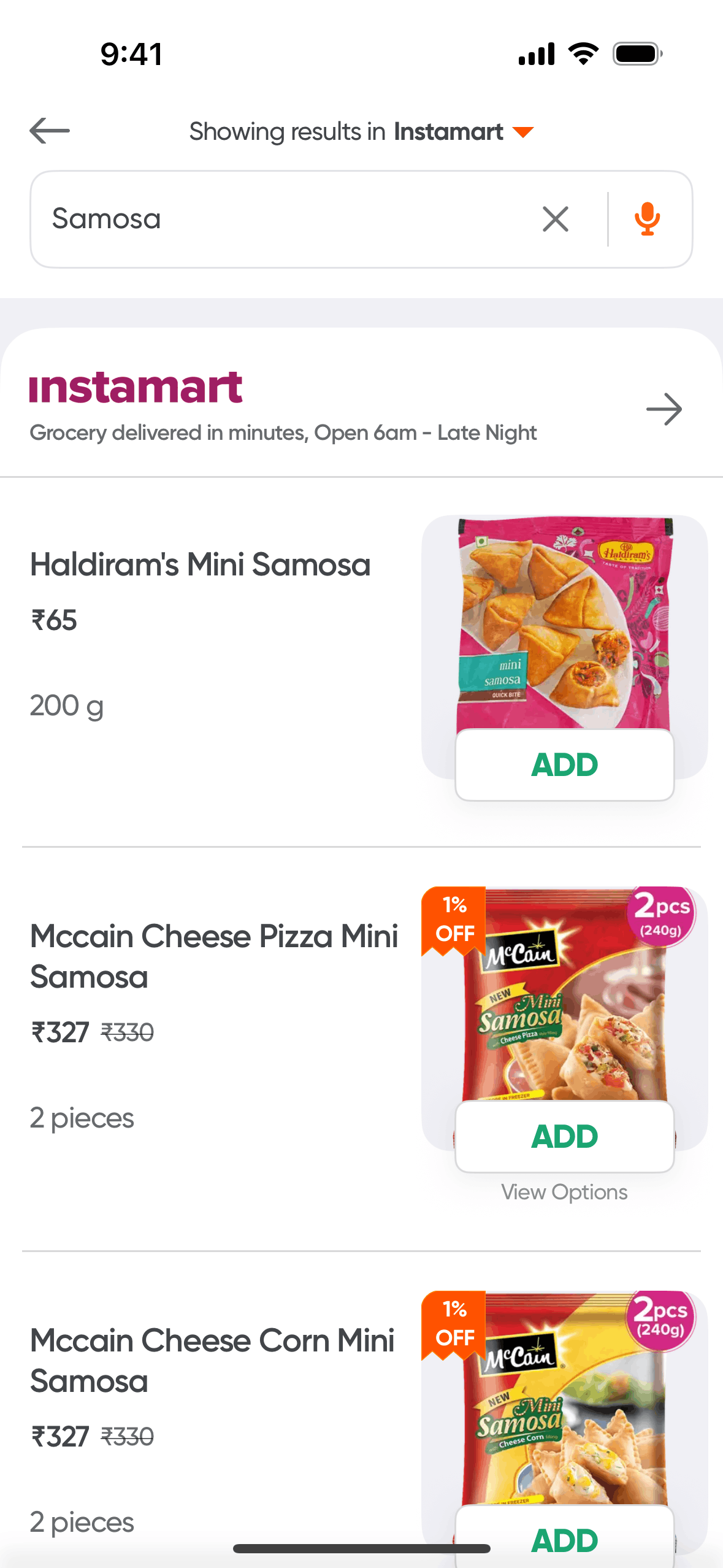 The user searches for "Samosa", initially viewing restaurant results before switching to Instamart to find grocery options.