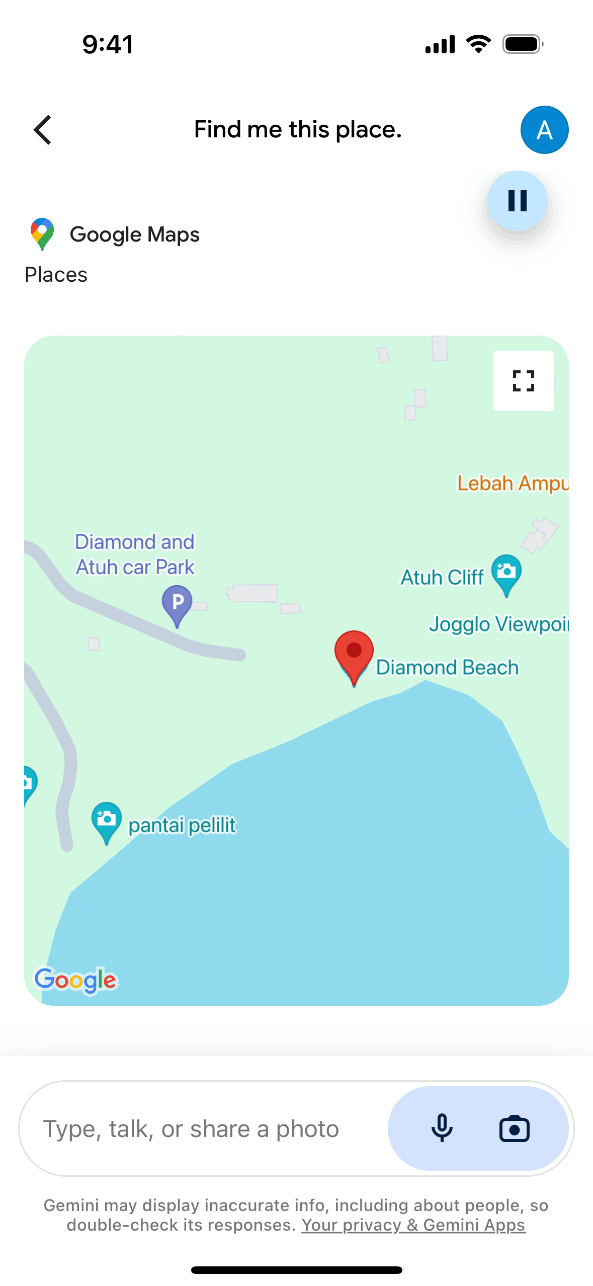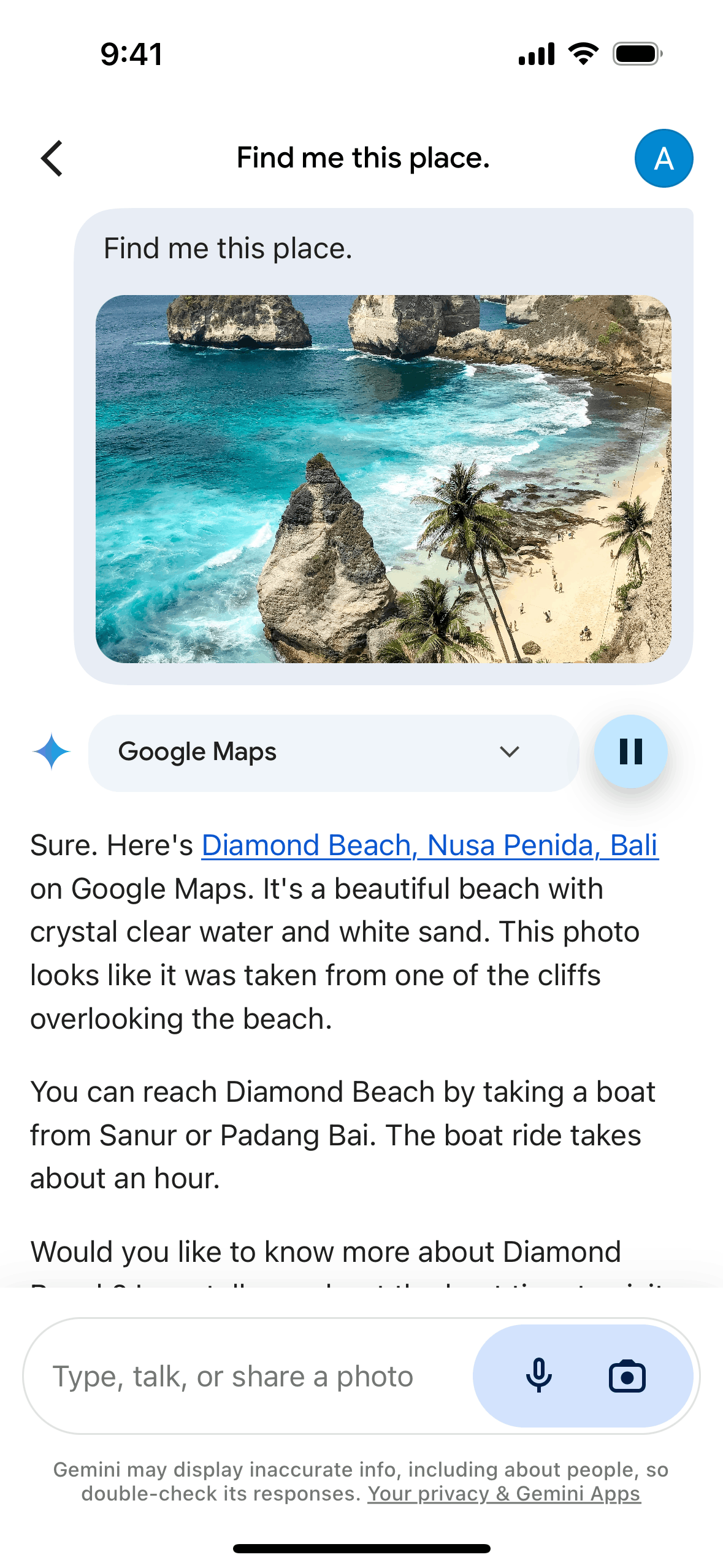 The user uploads an image and asks Gemini to identify the place. Gemini provides the location and opens it in Google Maps.