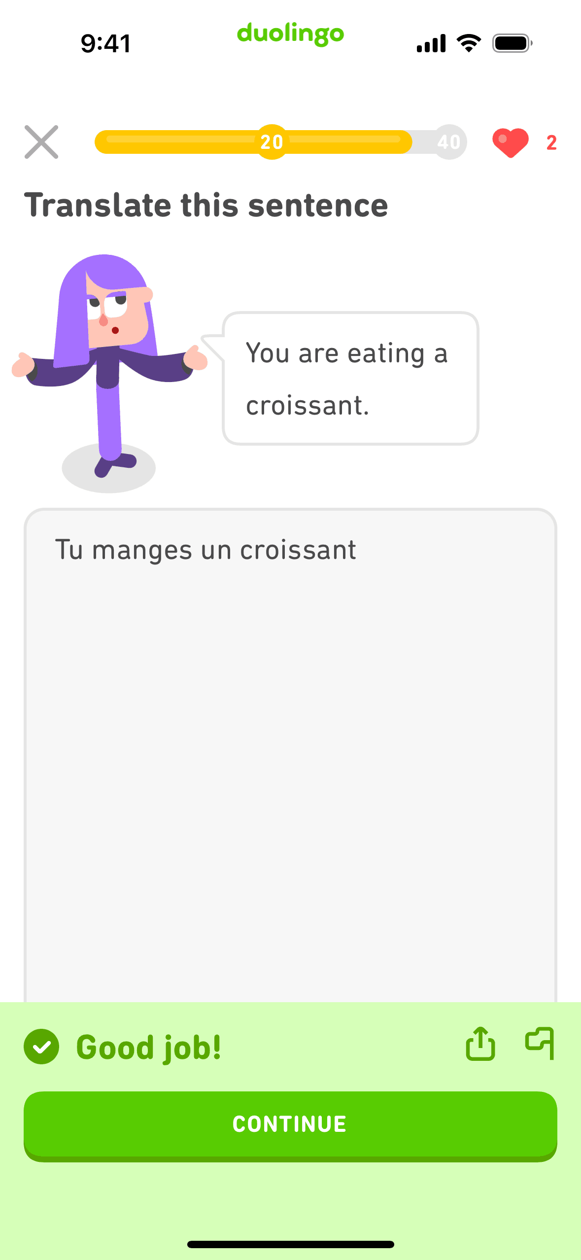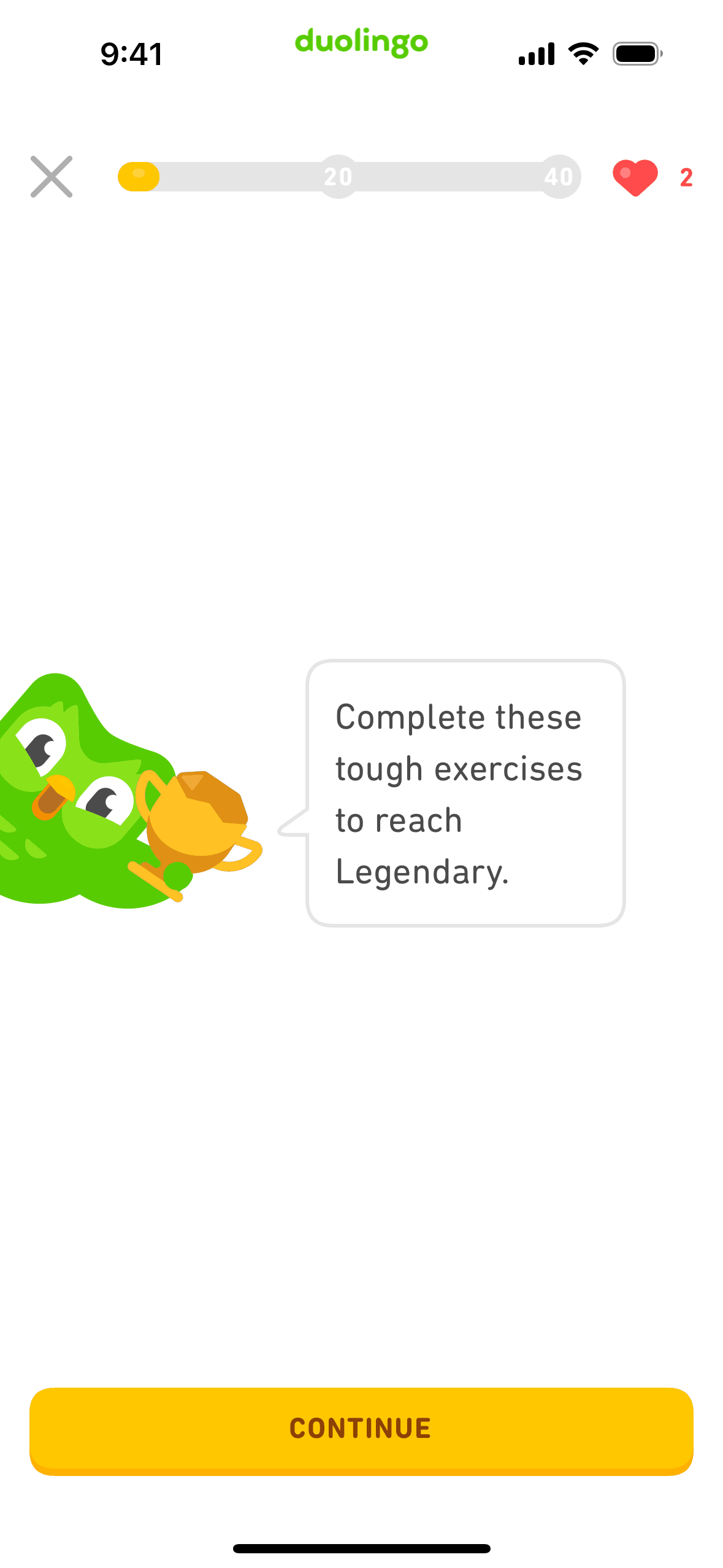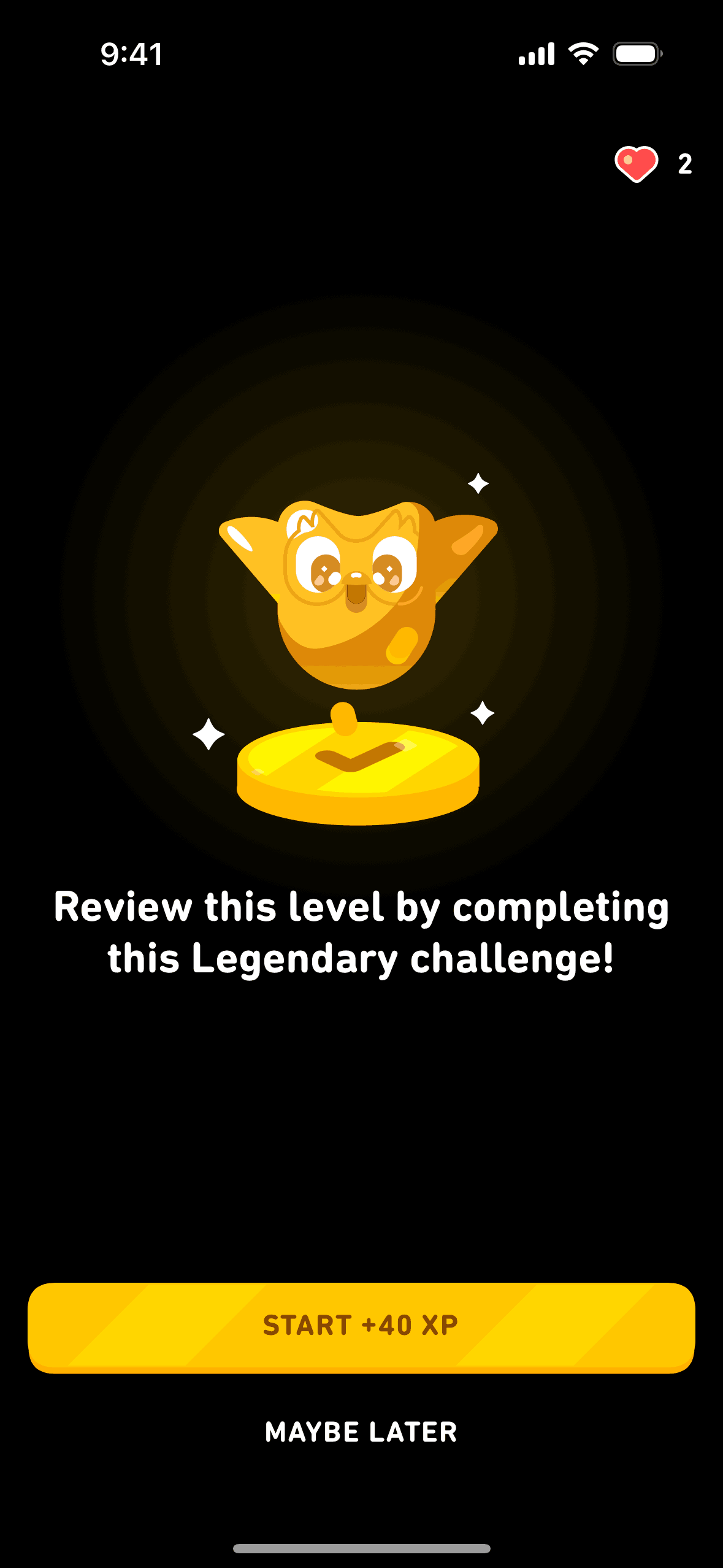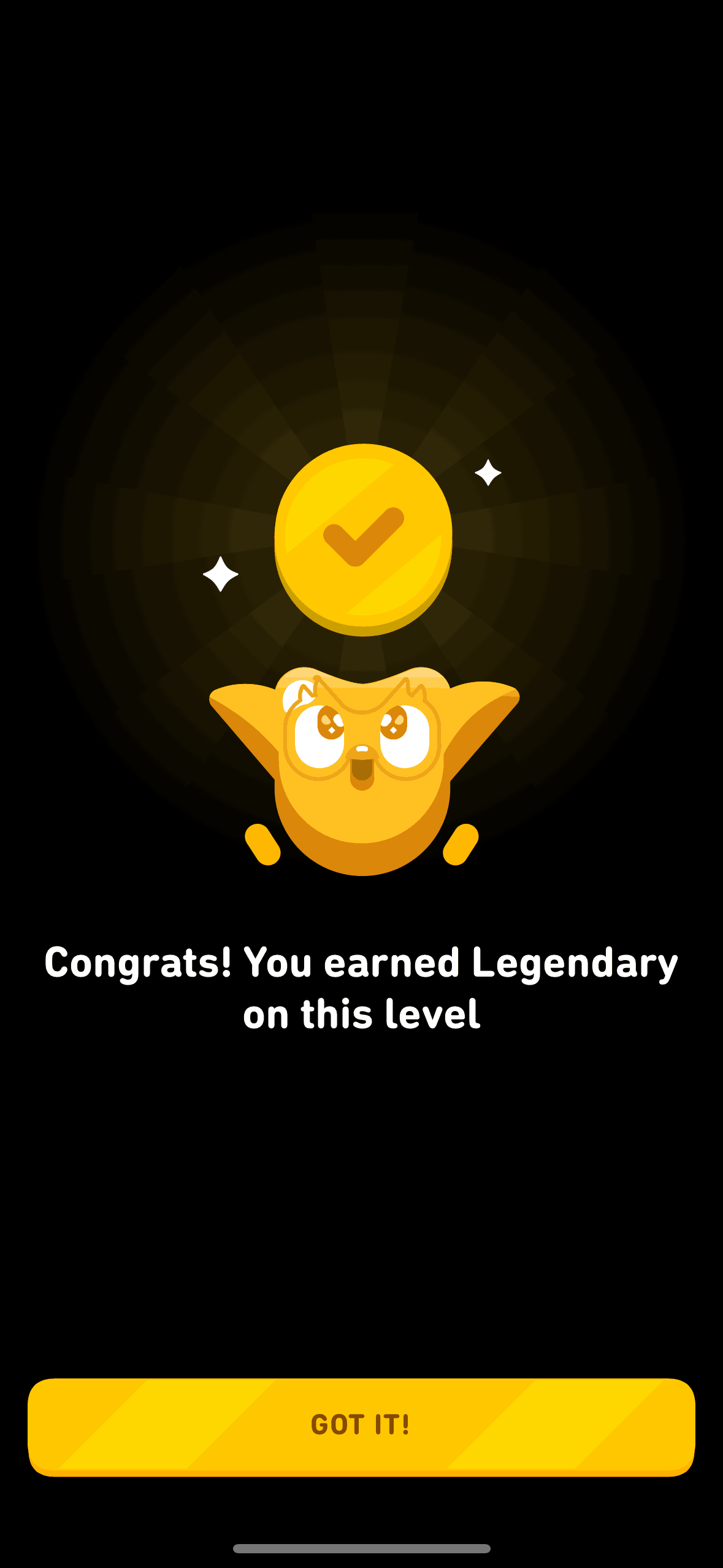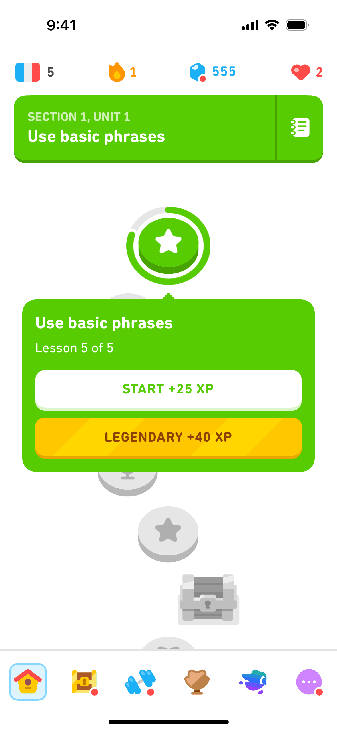 The user completes a legendary level by completing a translation exercise. They are congratulated and return to the learning path.