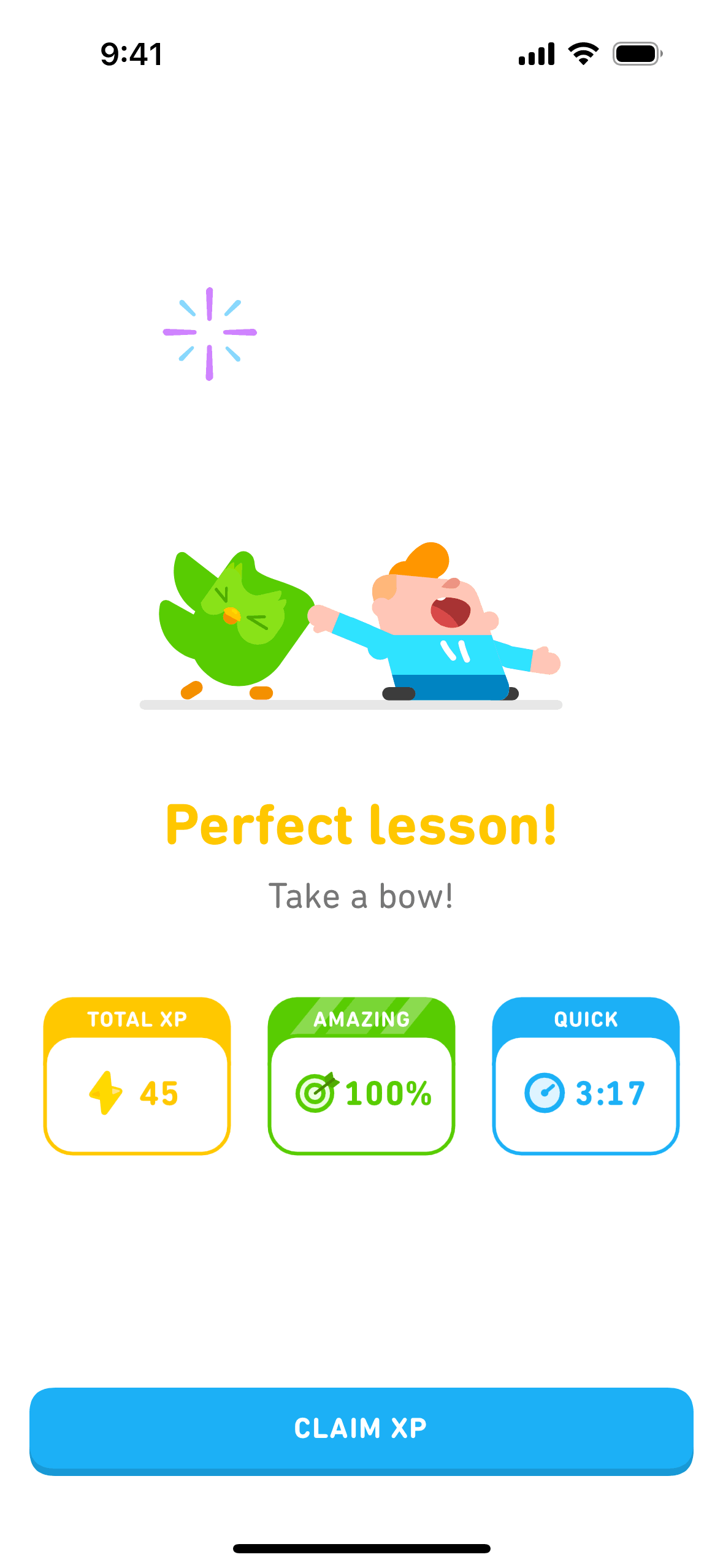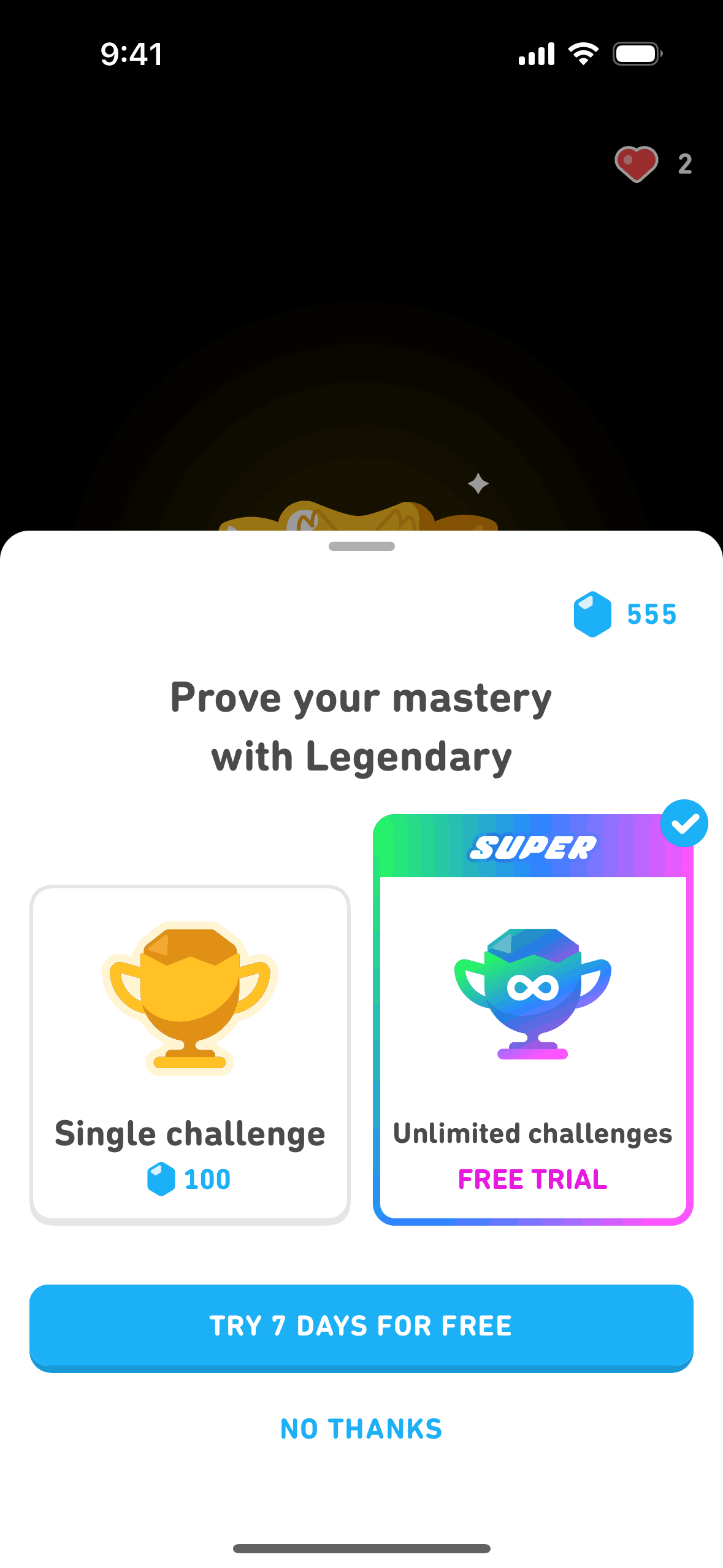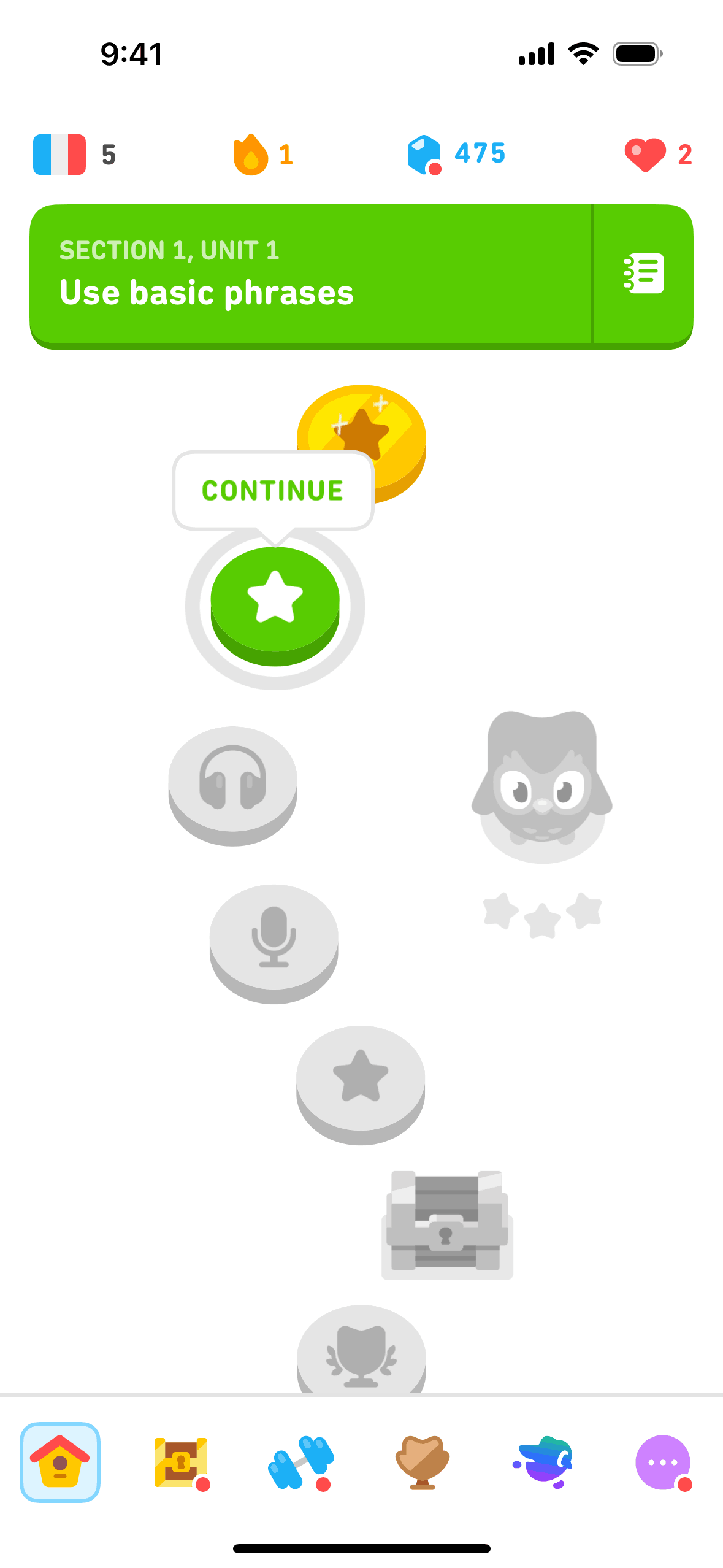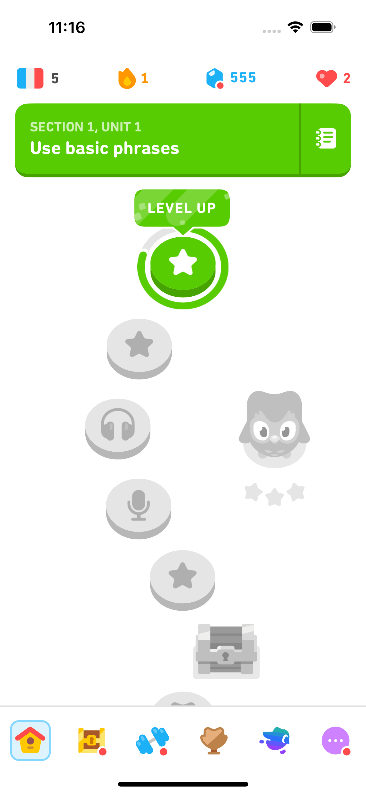 The user completes a legendary level by completing a translation exercise. They are congratulated and return to the learning path.